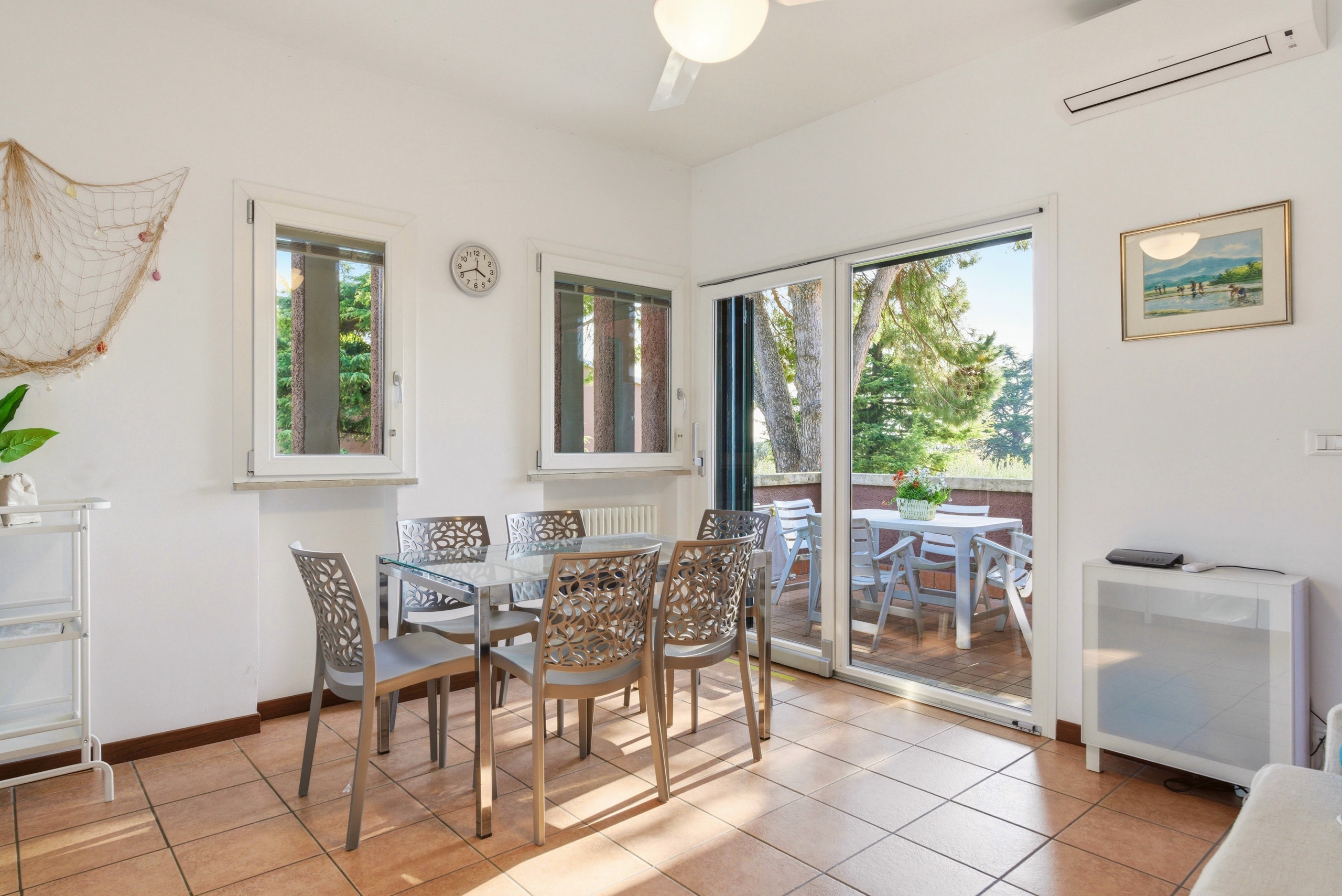 Dal terrazzo, attrezzato con tavolo e sedie, si può godere di una magnifica vista sul lago con tramonti mozzafiato e della vista della piscina per adulti e bambini (periodo di apertura garantito dal 01/06 al 30/09), lettini inclusi.