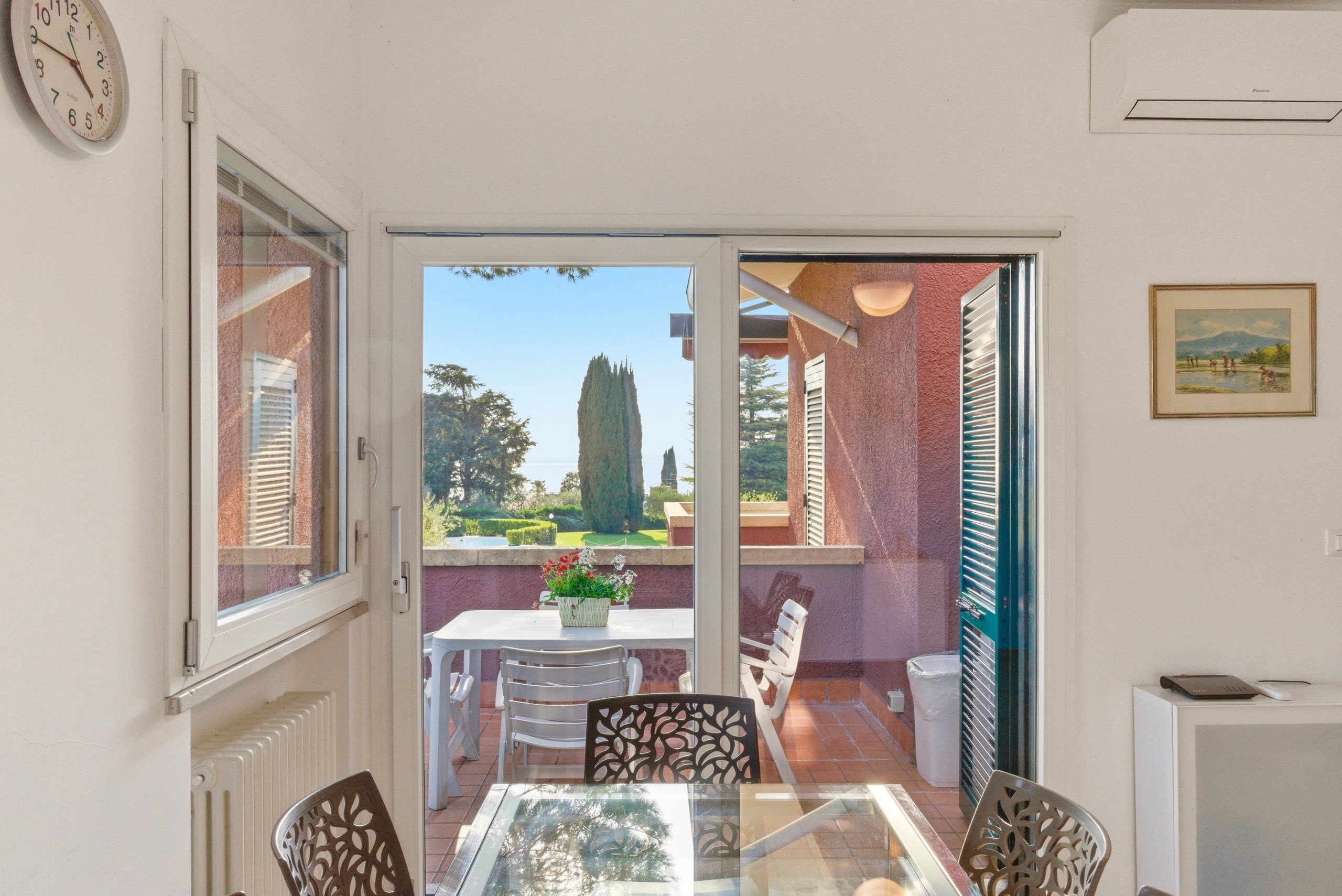 En lille og meget hyggelig lejlighed med god udsigt til den flotte have med pool og godt view til Gardasøen. Lejligheden er i et trygt indhegnet område med tilhørende stor lækker pool samt lille børnevenlig pool. Der er ligeledes bordfodbold og bordtennis bord i haven tilgængeligt. Hent liggestolene fra altanen med ned til poolområdet - så har du alle muligheder for en hyggelig dag. Lejligheden rummer 4 personer med mulighed for 6 personer, hvis sovesofaen i stuen trækkes ud. Vi anbefaler Max 4 personer. Der er gode senge og en god altan, som vi brugte hele tiden, så snart vi var i lejligheden. Værterne er meget venlige og hjælpsomme med info om lejligheden og selve området i Cisano samt Bardolino. Vi kommer helt sikkert igen😃 På altanen er