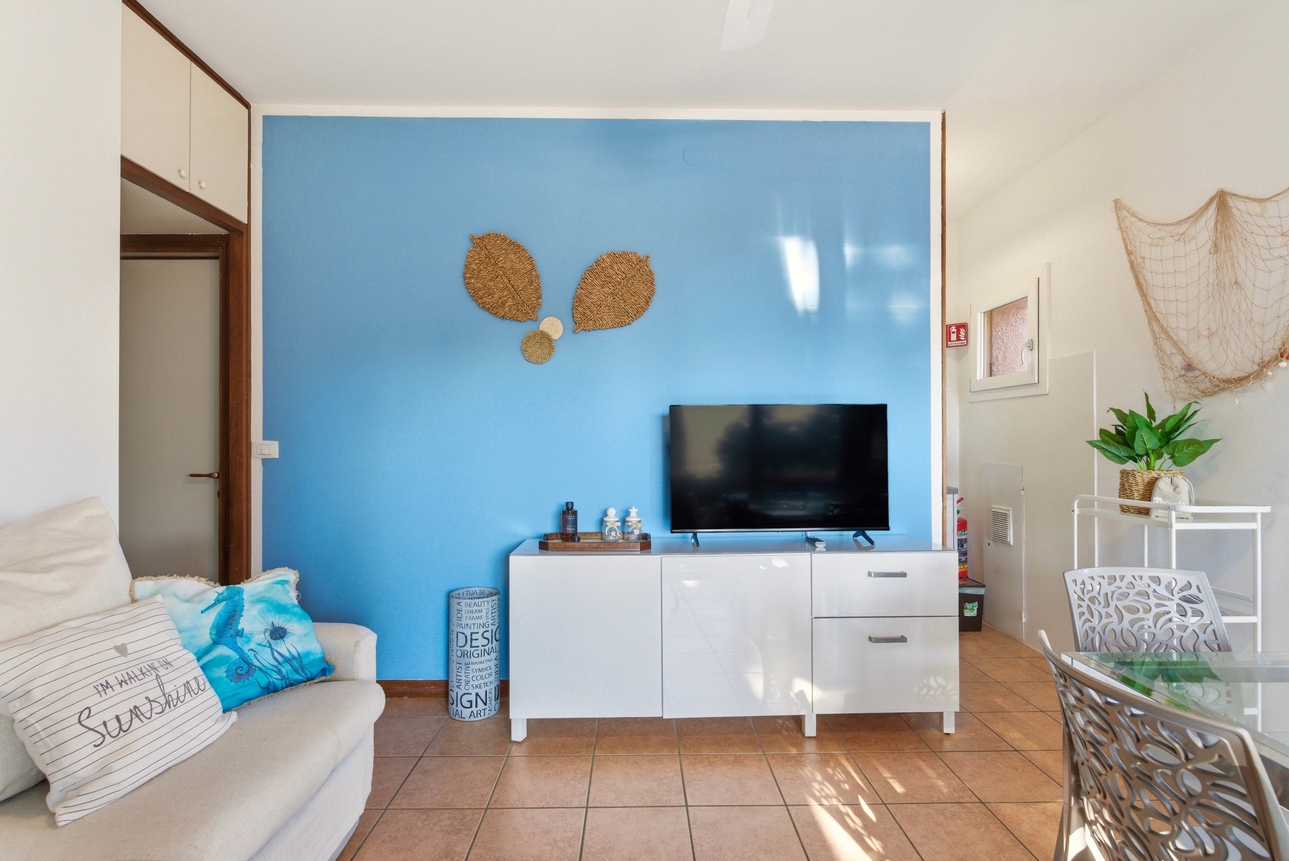 L'appartamento, parzialmente ristrutturato, è composto da una luminosa zona giorno con piccola cucina con piano a induzione, frigorifero e congelatore, lavastoviglie, forno e un divano letto matrimoniale adatto ad ospitare un adulto o due bambini. Tostapane, bollitore, aria condizionata, TV (senza satellite) e wifi disponibili. Camera matrimoniale con armadio, cameretta con letto a castello. Bagno con cabina doccia e lavatrice. Parcheggio del complesso residenziale disponibile. Animali di piccola taglia ammessi su richiesta con supplemento.