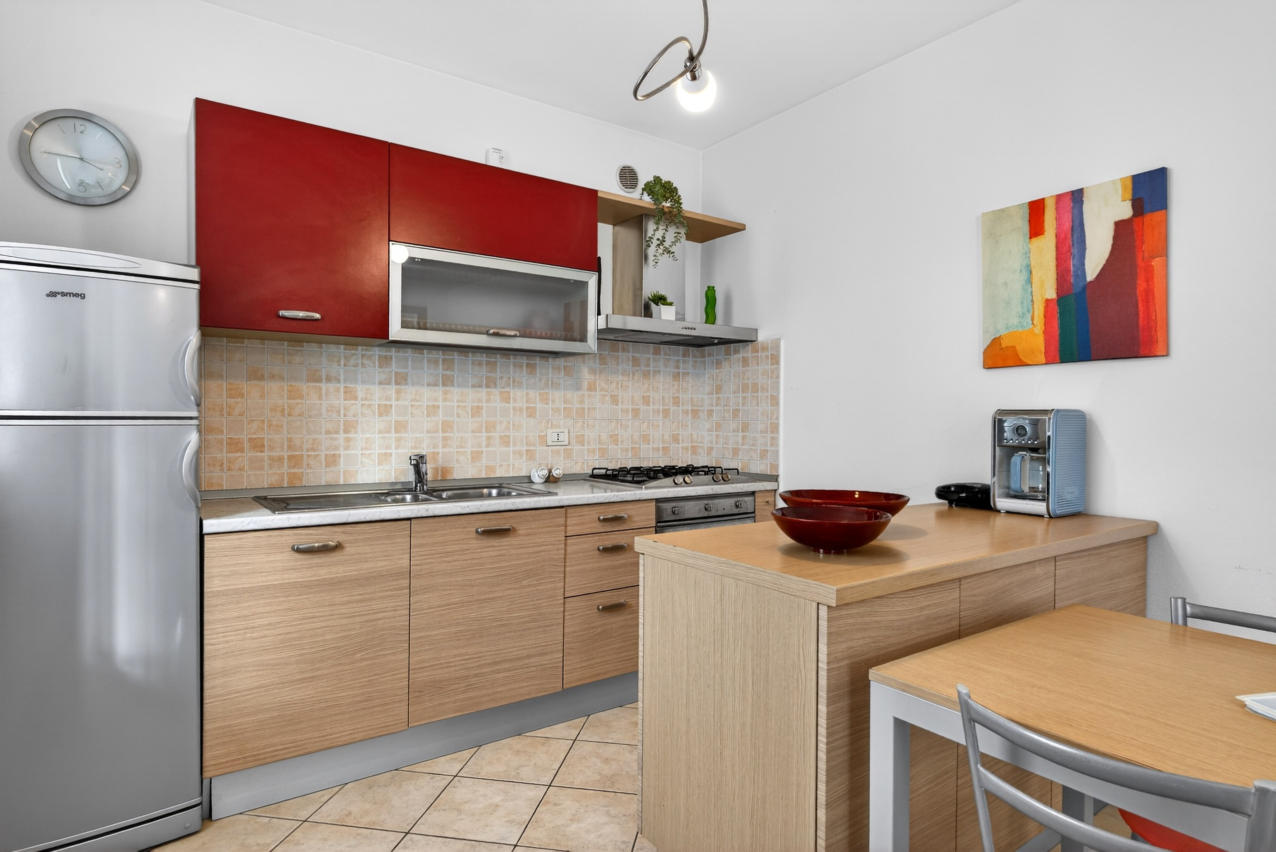 La zona giorno è completamente attrezzata per 4/6 persone e dispone di moderna cucina con grande frigorifero, frigo per vino, piano cottura con 4 piastre, forno, lavastoviglie, tostapane, bollitore e macchina da caffè tedesca. Tv satellitare, divano letto matrimoniale ed aria condizionata a disposizione degli ospiti. La zona giorno affaccia su un grazioso giardino che si estende su due lati dell’appartamento con terrazza pavimentata ed ombreggiata dalla tenda da sole per piacevoli pranzi all’aperto.