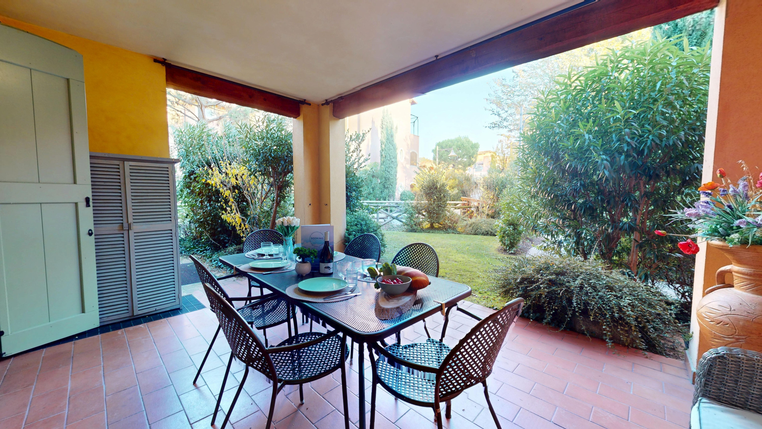 Gli ospiti potranno godere di numerosi comfort, tra cui aria condizionata, riscaldamento a pompa di calore, connessione WiFi gratuita e un pratico garage privato. L'appartamento è inoltre dotato di un giardino esterno con arredi da giardino, perfetto per momenti di relax.
