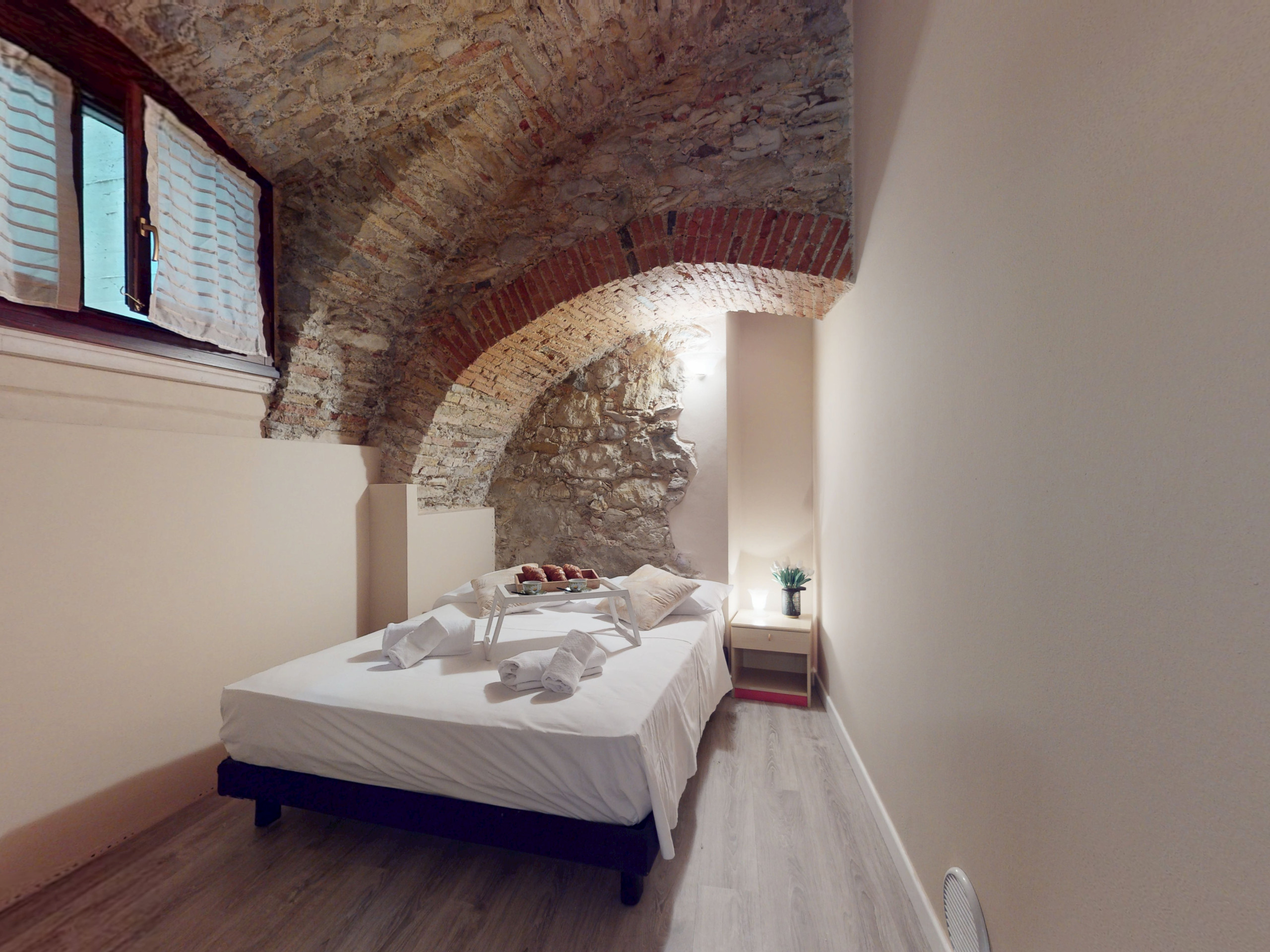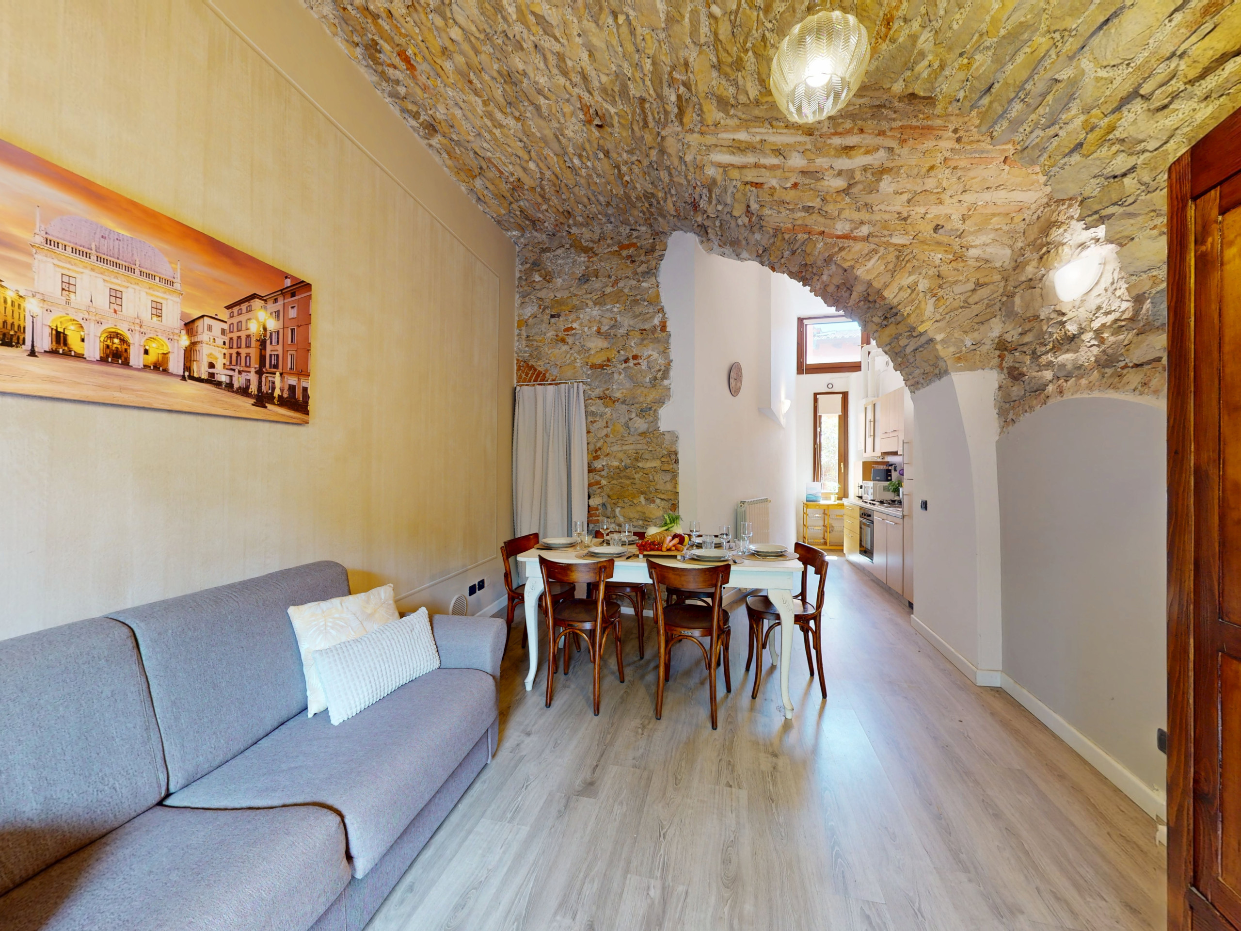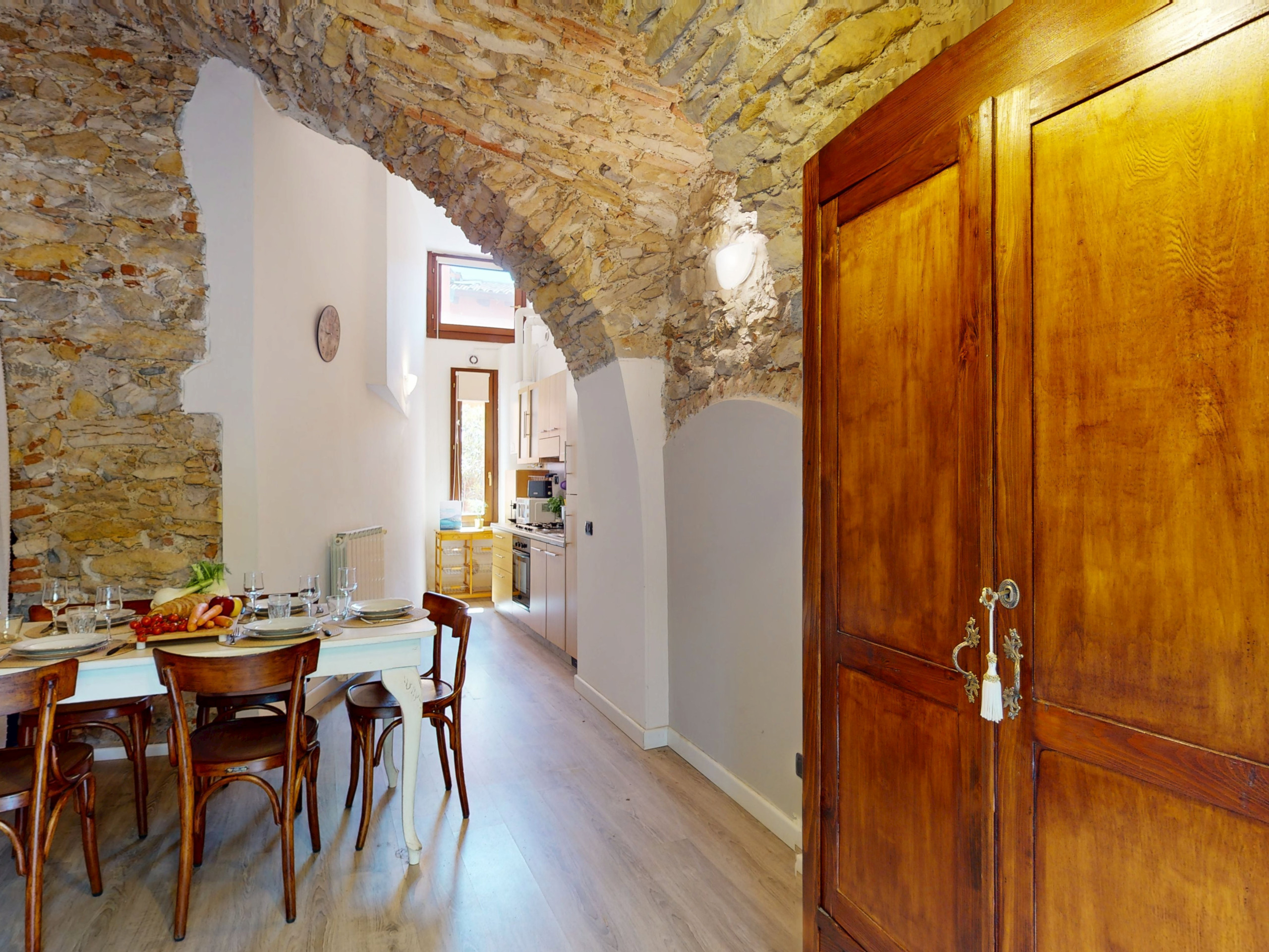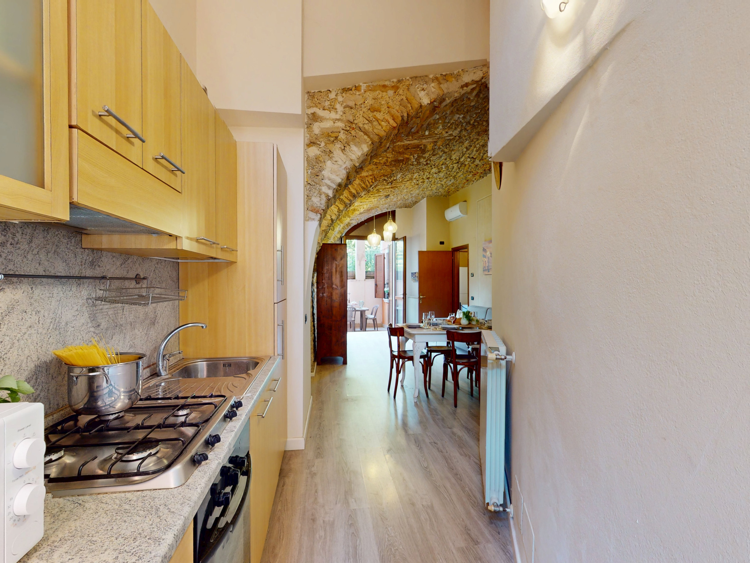 L'appartamento, situato al piano terra, colpisce per la sua atmosfera unica: tutti gli ambienti sono caratterizzati da suggestive volte e soffitti in pietra, che raccontano la storia del luogo e offrono un'accoglienza calda e senza tempo.