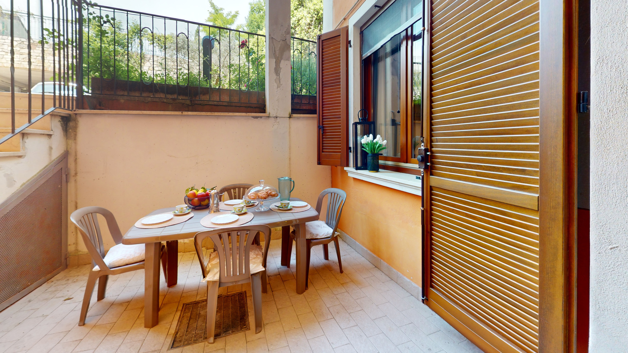 All’esterno, un portico privato attrezzato con tavolo e sedie offre uno spazio intimo dove gustare una colazione all’aperto o rilassarsi dopo una giornata al lago.