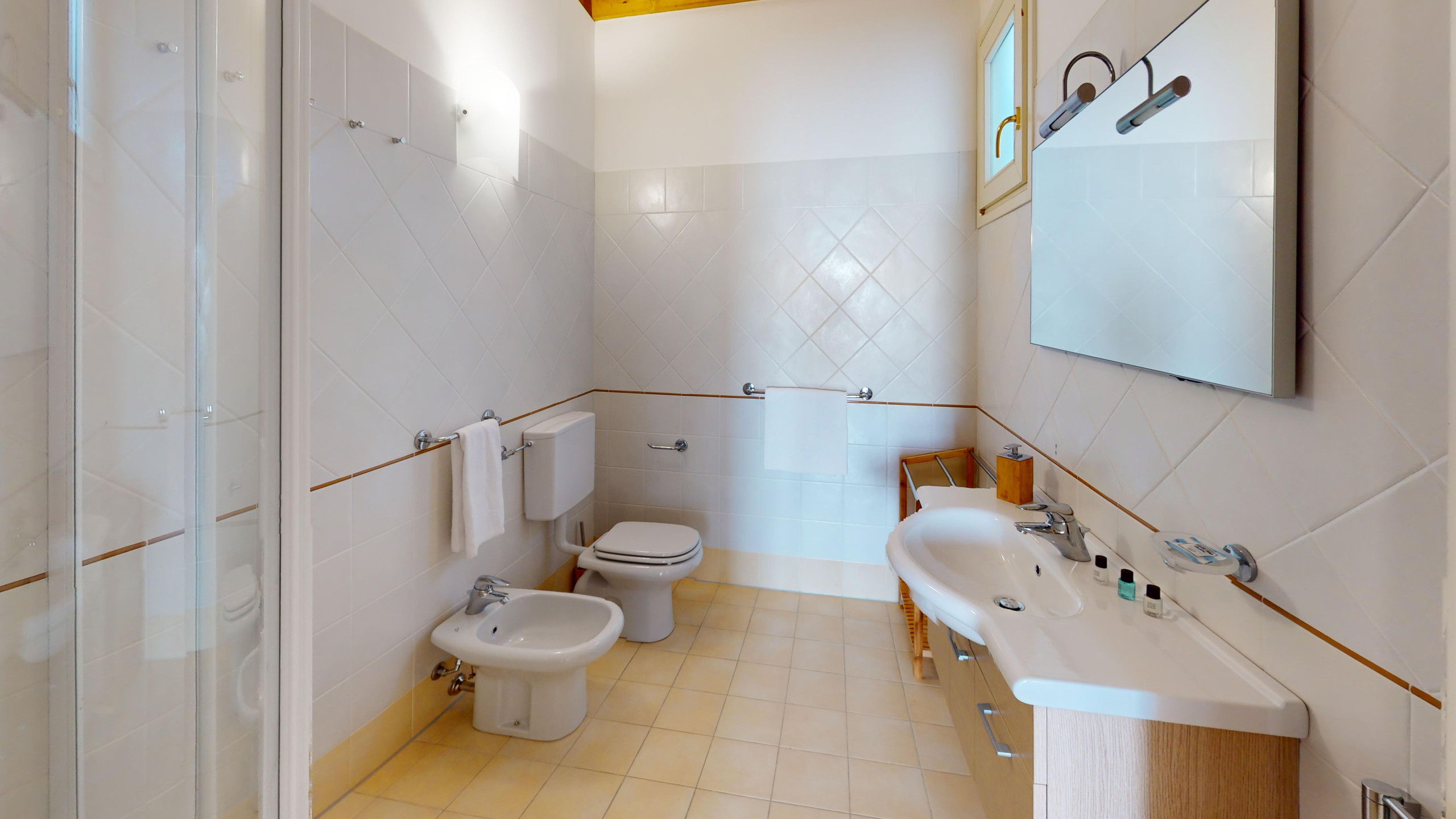 Il bagno finestrato con doccia è ampio e confortevole, a disposizione un pratico locale lavanderia ideale per chi desidera rinfrescare la biancheria durante il soggiorno.