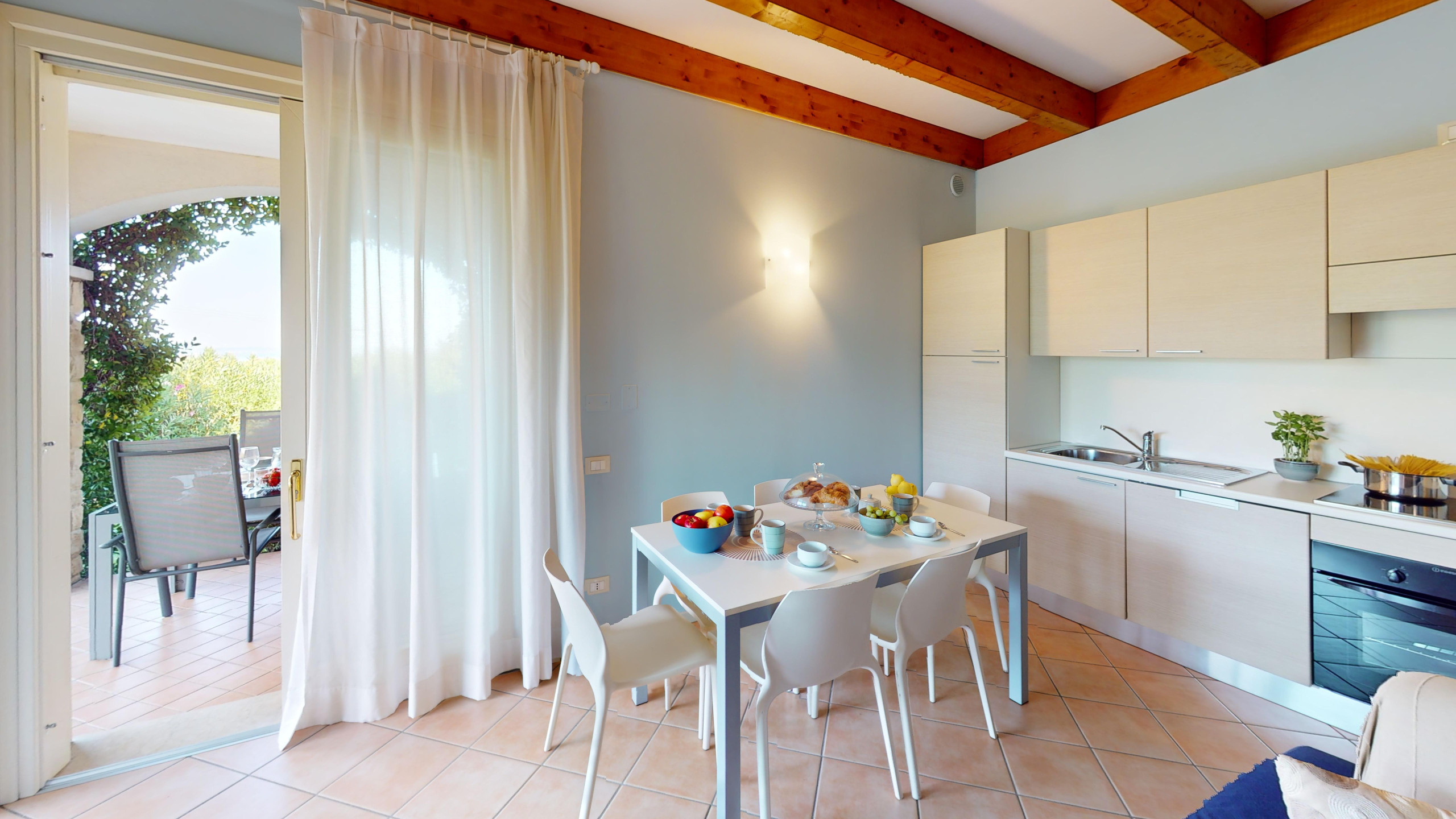 All’esterno, un portico privato attrezzato con tavolo e sedie offre uno spazio intimo dove gustare una colazione all’aperto o rilassarsi dopo una giornata al lago.