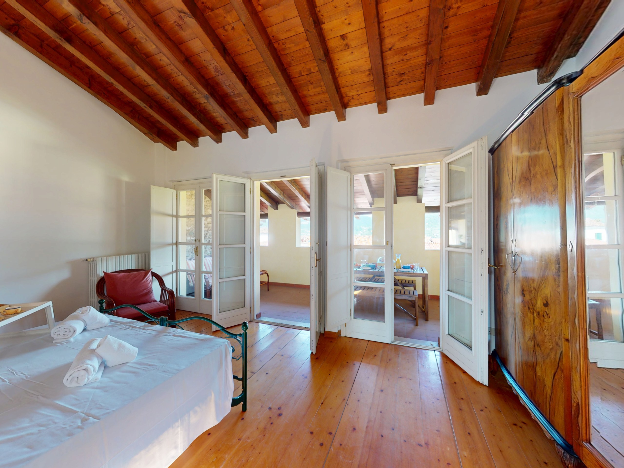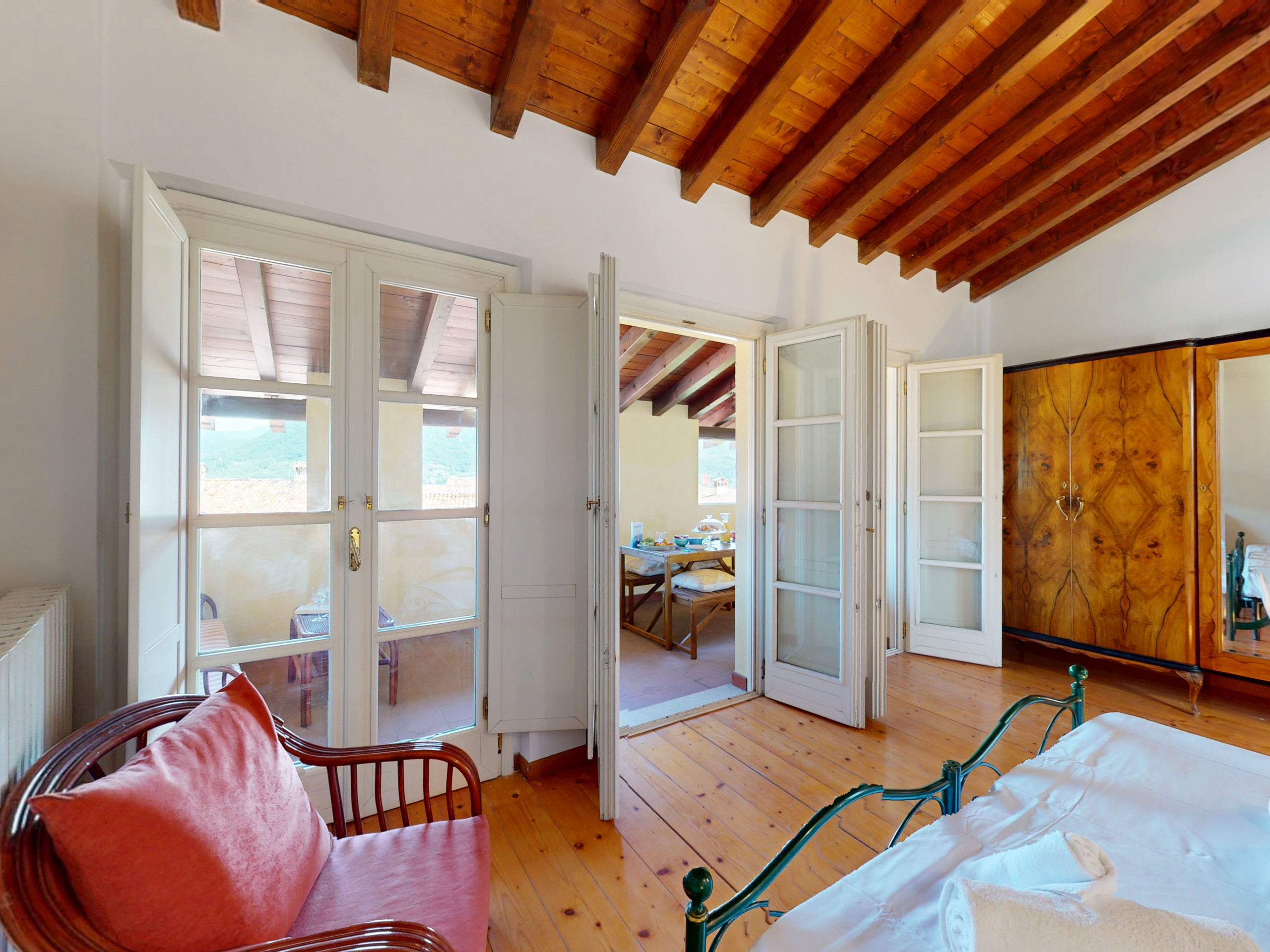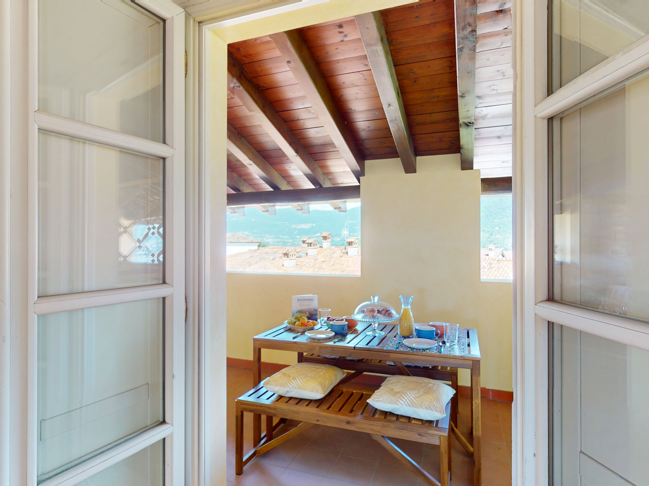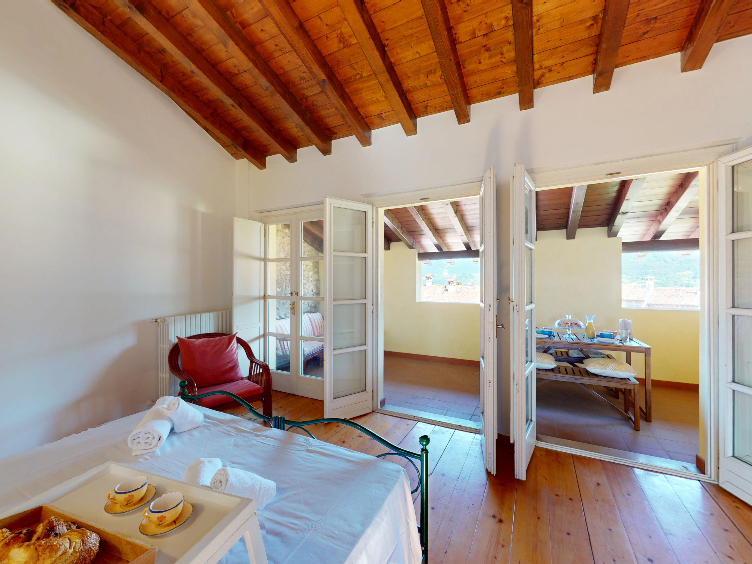 Salendo al piano superiore, l’ambiente si apre su due camere da letto con suggestive travi a vista: la camera padronale, ampia e rilassante, si apre su un terrazzo privato arredato con tavolo e sedie, da cui si gode una splendida vista sul lago, perfetta per una colazione all’aperto o un aperitivo al tramonto.