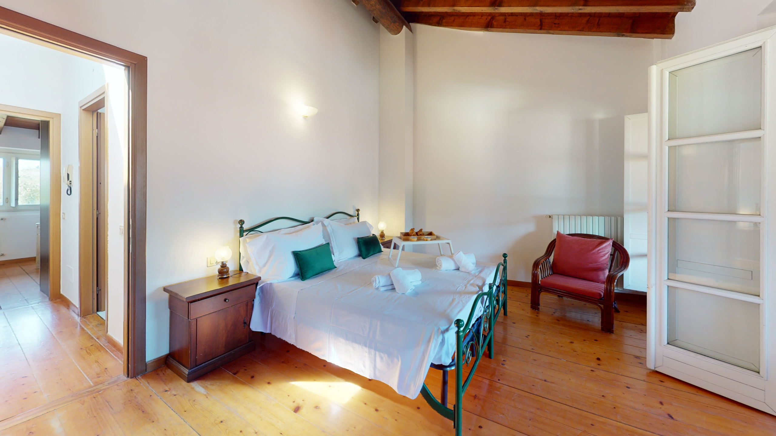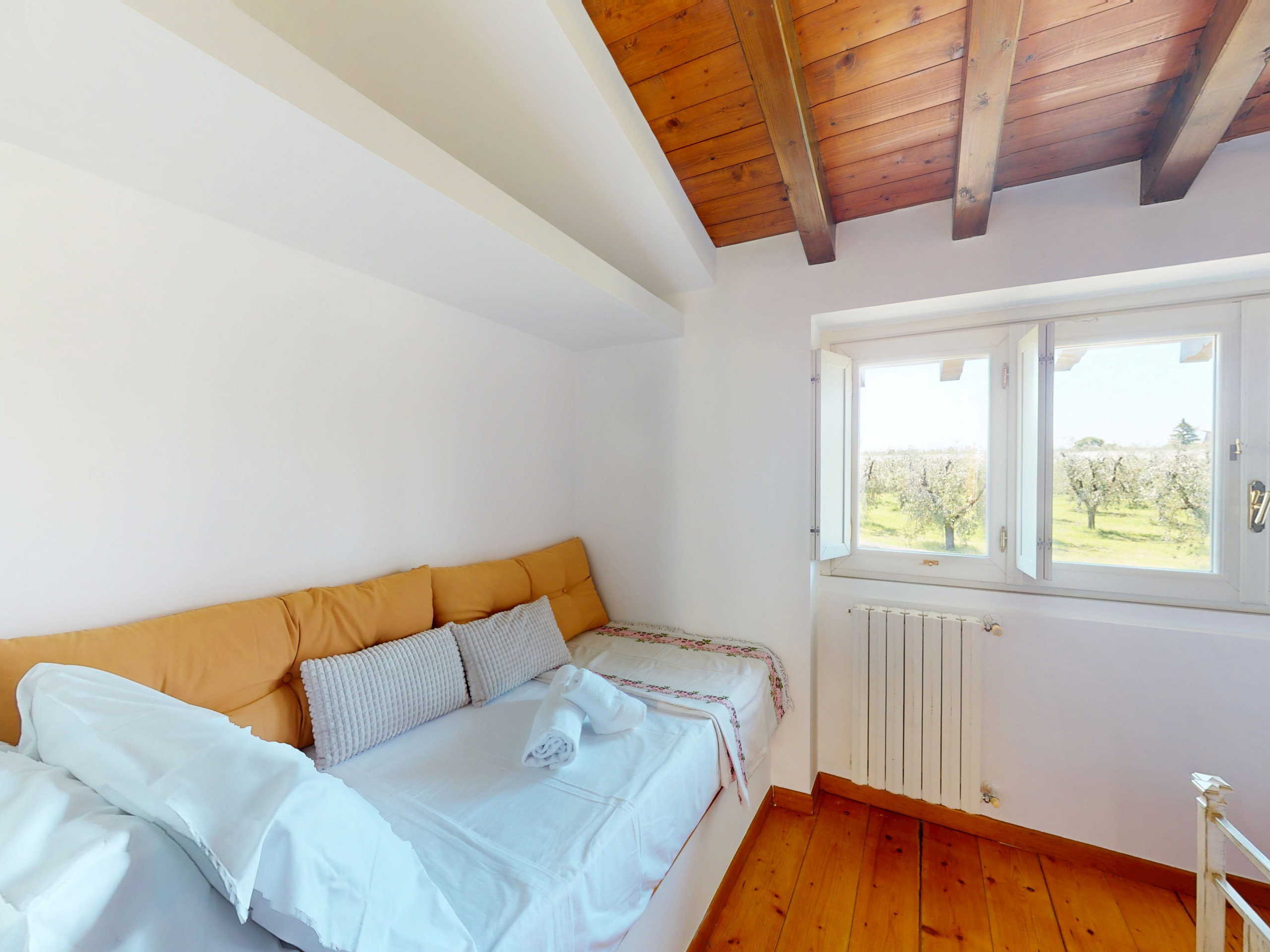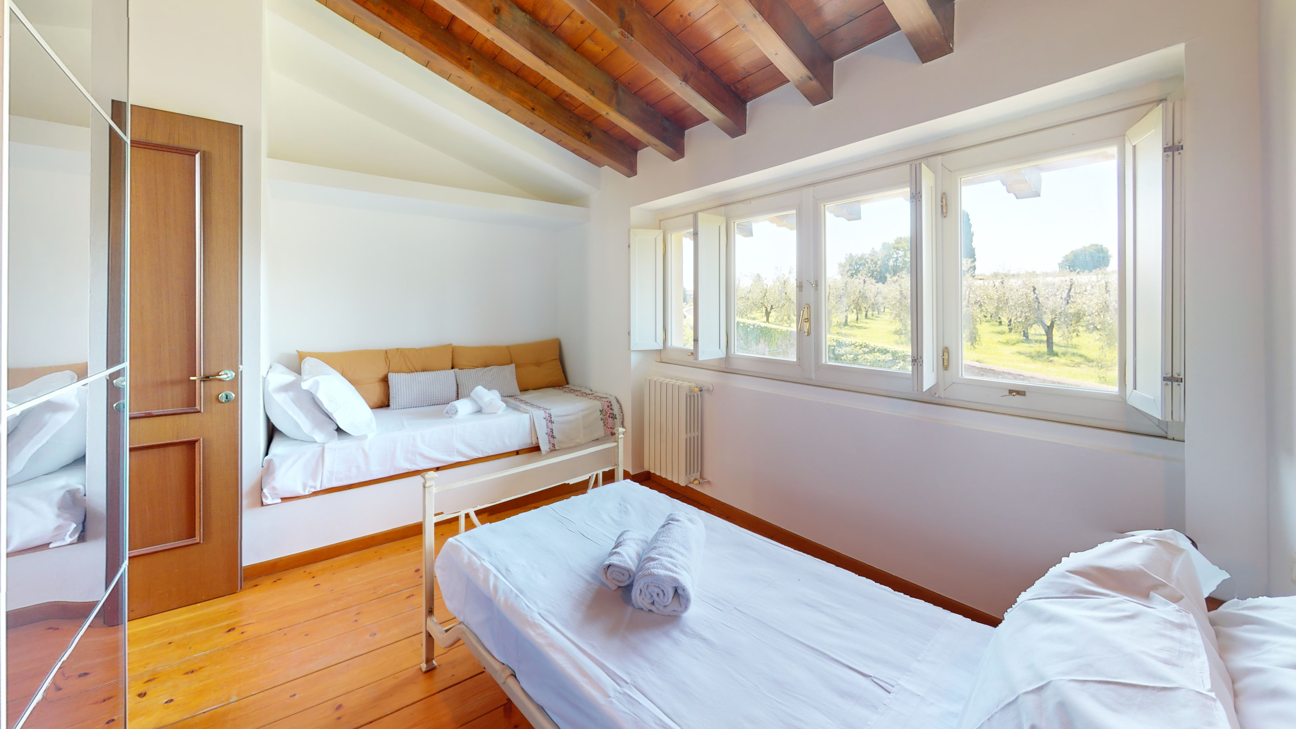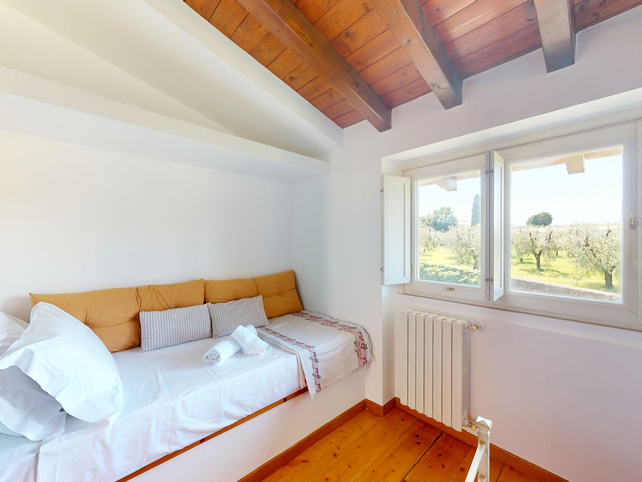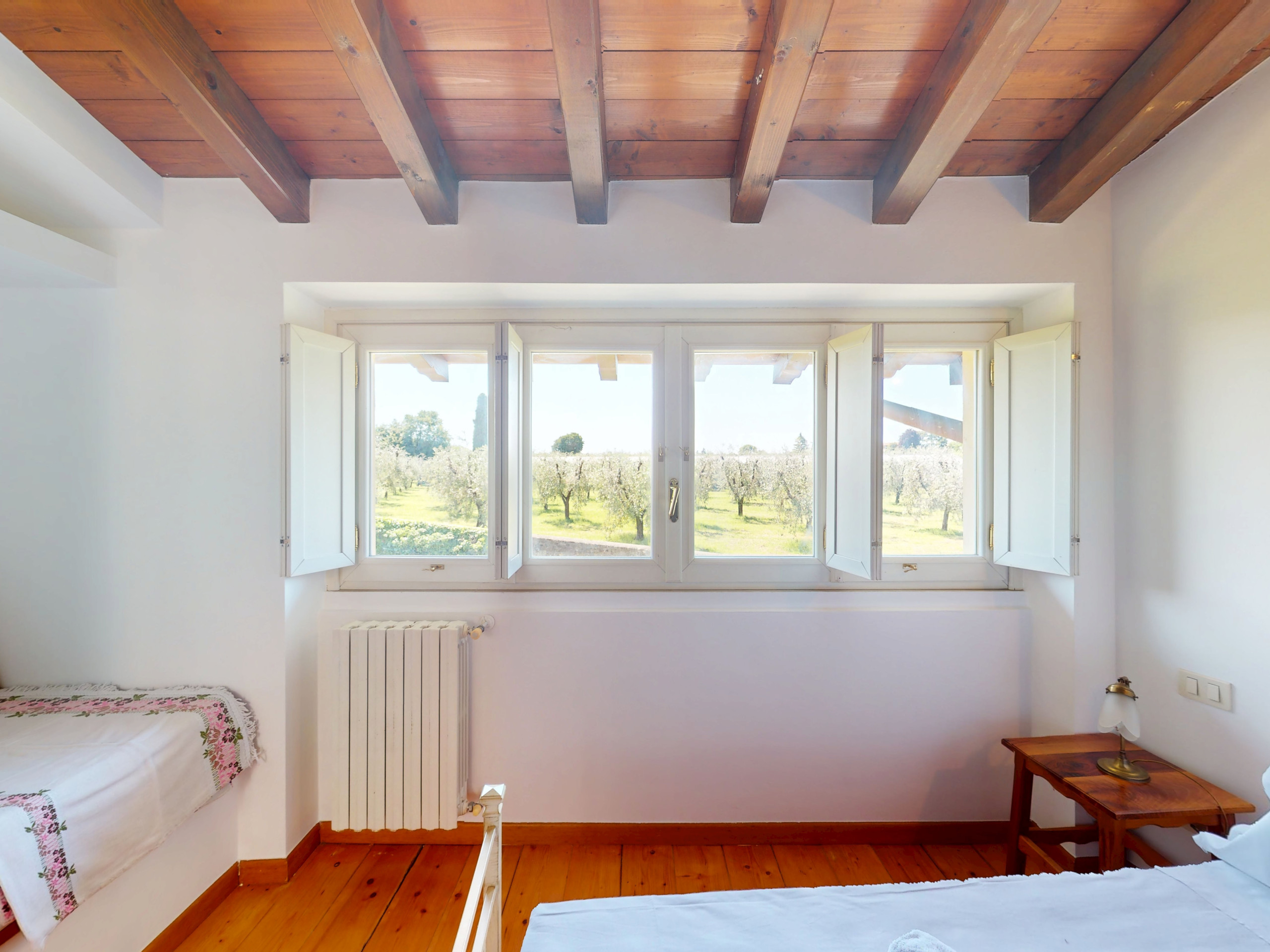 La seconda camera, anch’essa luminosa e silenziosa, è arredata con due letti singoli ed è affacciata sui verdi uliveti che circondano la zona.