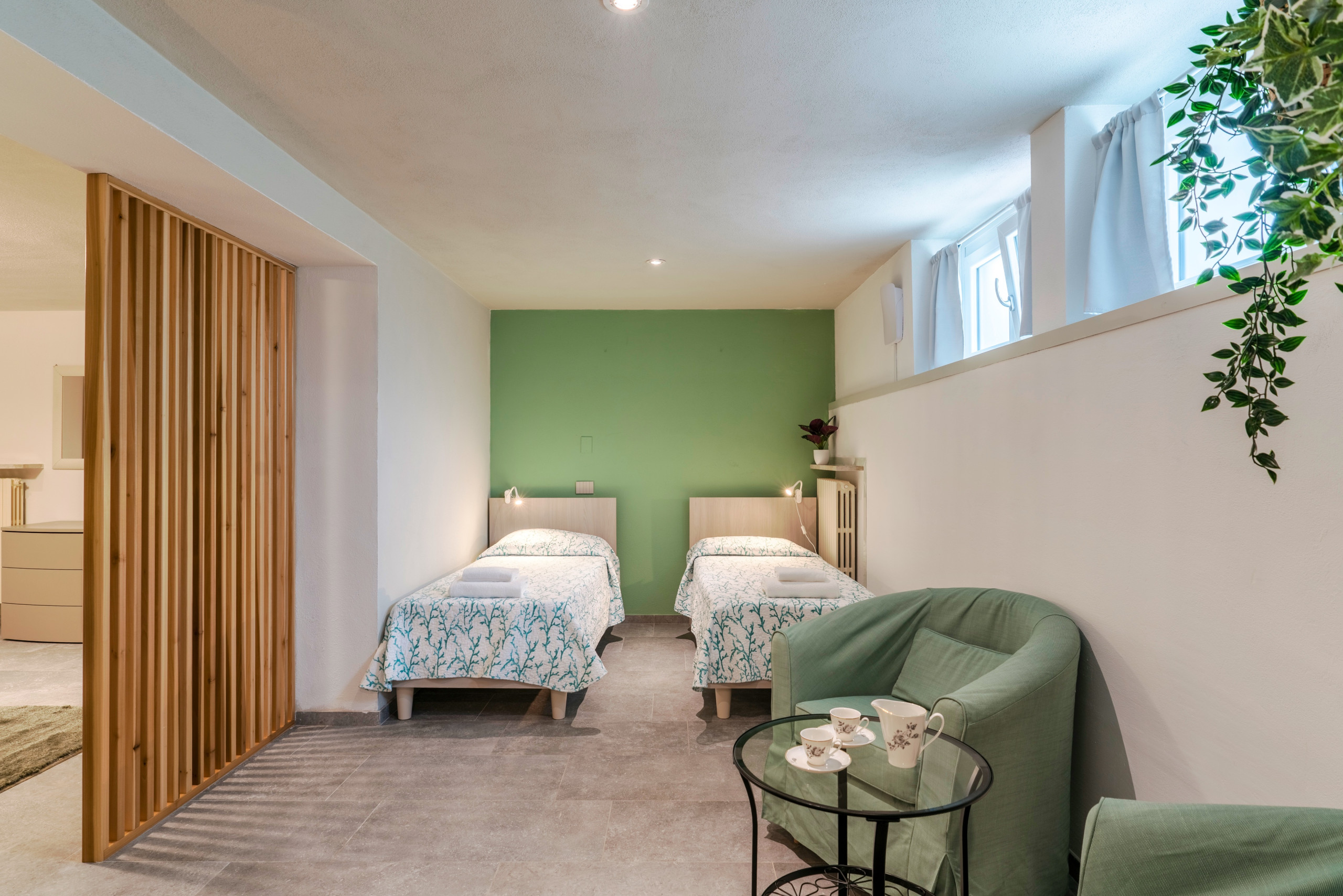 Il piano seminterrato è riservato alla Family Suite, ampia camera da letto dotata di un letto matrimoniale e due letti singoli, separati da una paratia in legno per garantire maggior riservatezza. E’ presente anche un terzo bagno con doccia a disposizione degli ospiti.