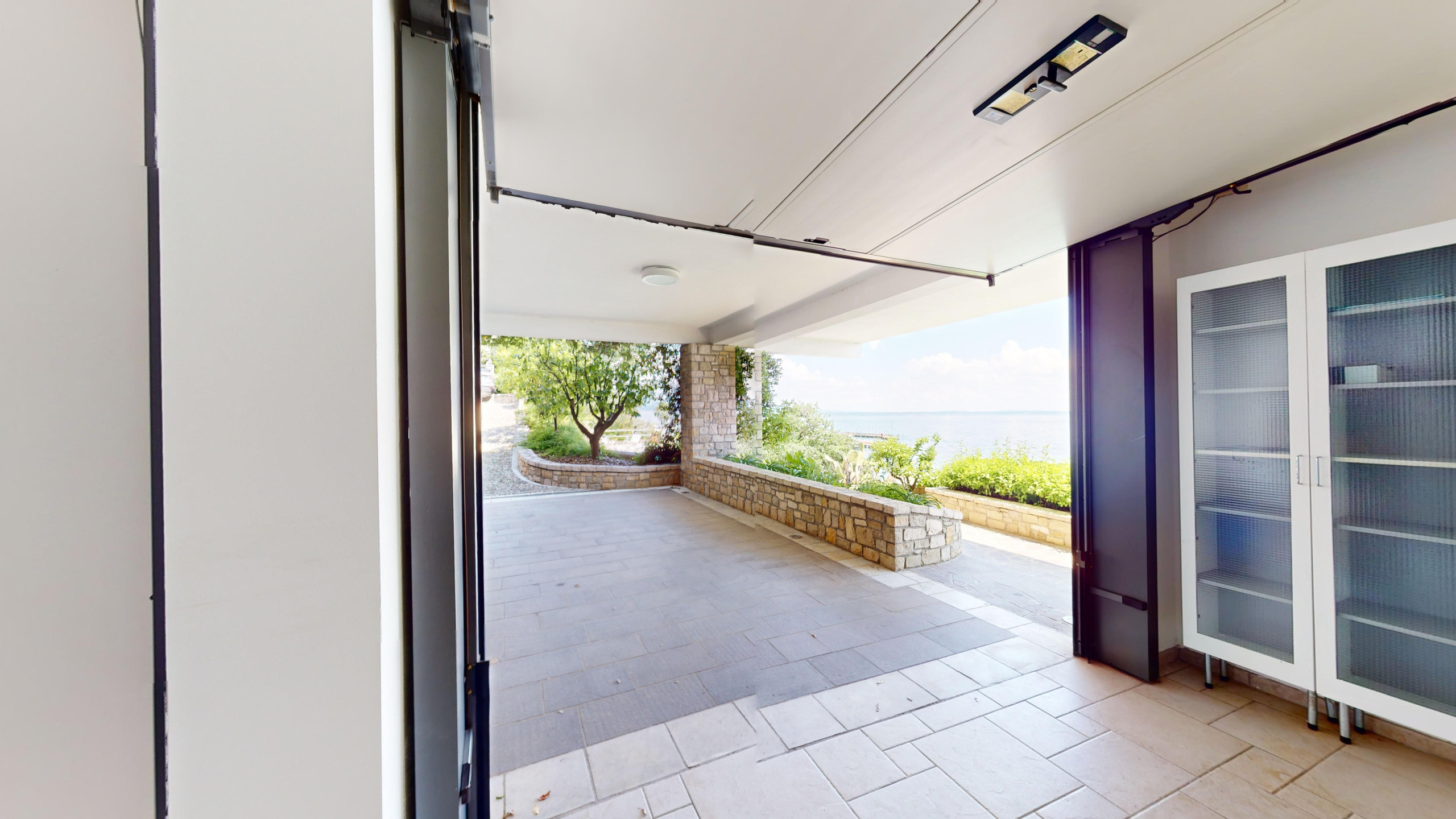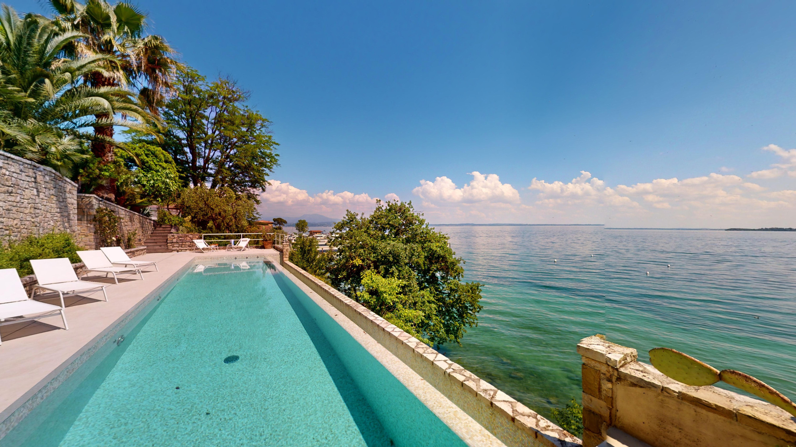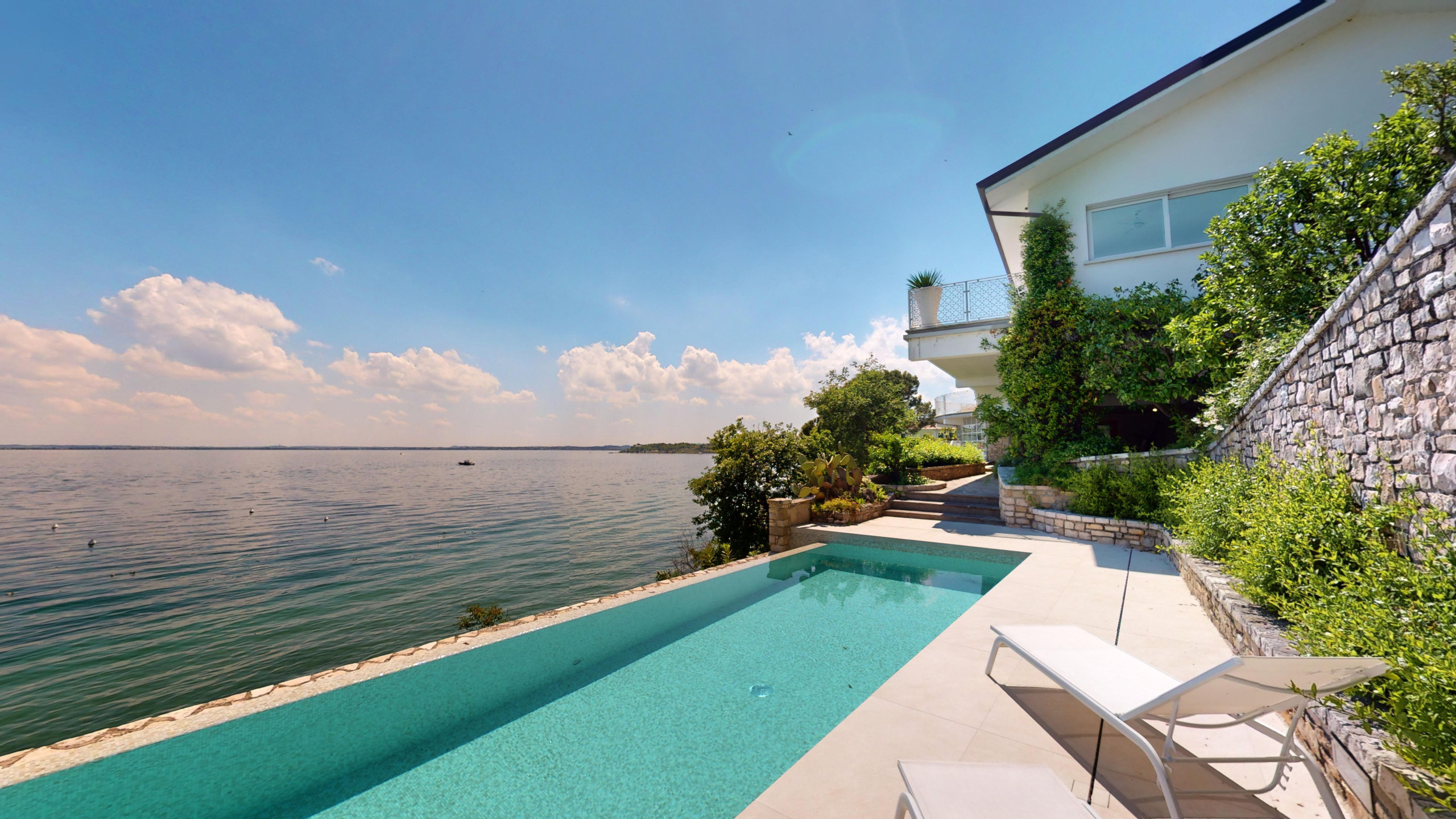 Il lato sud-est della casa è servito interamente da un ampio terrazzo da cui si domina il lago e da cui si può godere anche della vista della piscina e del porto retrostante.