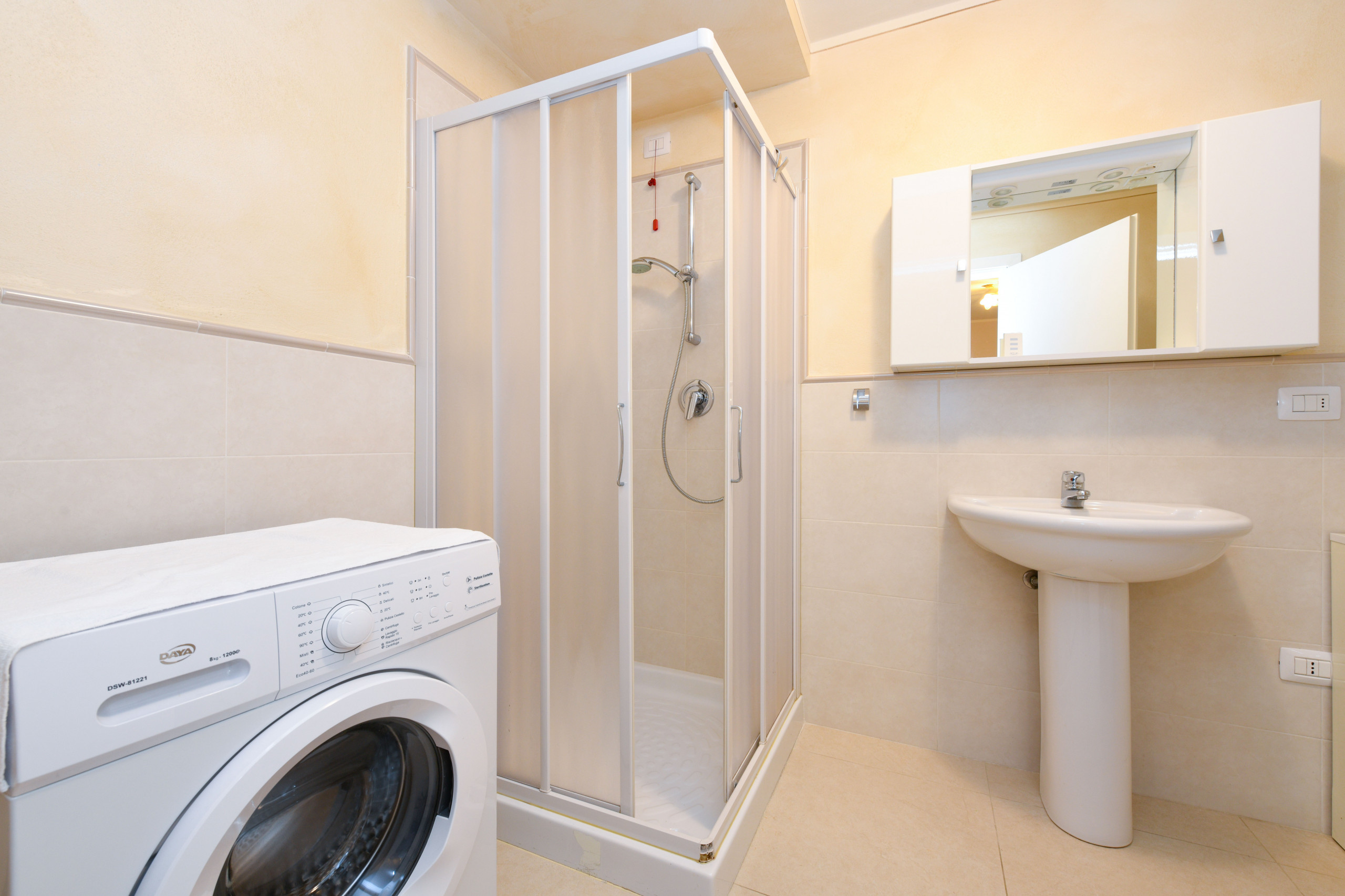 Al piano seminterrato troviamo un salone con letto matrimoniale un bagno con doccia e lavatrice. L'immobile è dotato di schermi