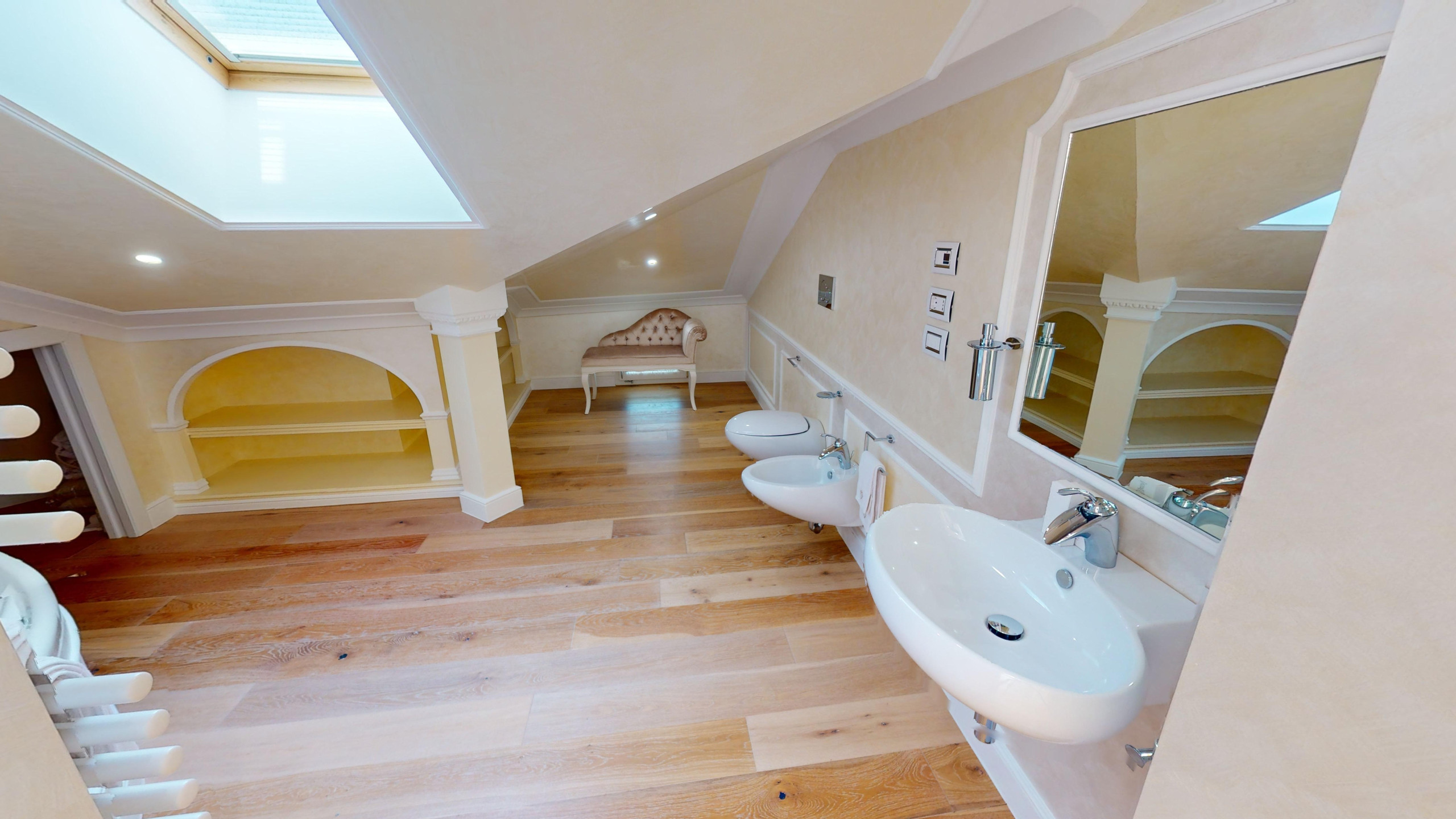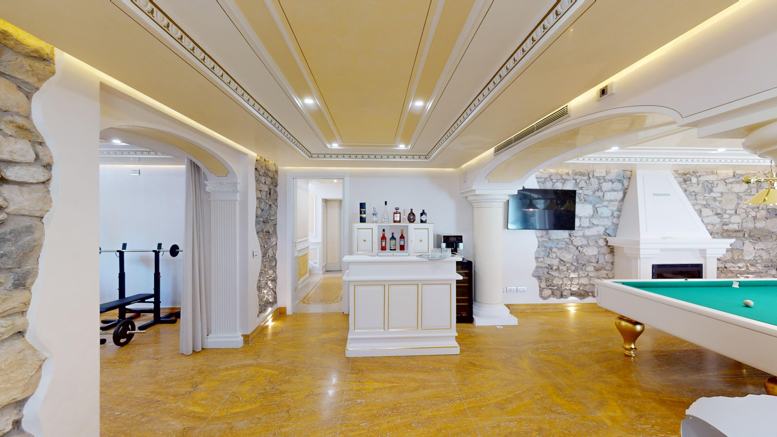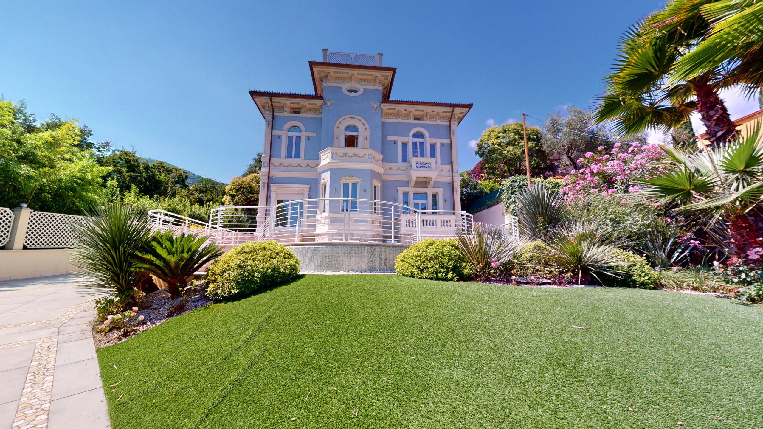 Gli interni della villa sono stati ristrutturati con una attenzione meticolosa ai dettagli, preservando il carattere originale della struttura. La villa è disposta su quattro livelli ed è dotata di un ascensore interno. Al primo piano si trova la luminosa zona giorno che comprende un ampio salone con camino, una sala da pranzo vista Lago e una cucina moderna dotata di tutti i comfort e una camera da letto con bagno privato. Al secondo piano vi sono le tre camere dal letto, tutte dotate di bagno con vasca e balcone. Al terzo piano infine la mansarda con bagno che accoglie una stanza da letto matrimoniale e una zona giorno. Da qui è possibile accedere alla terrazza solarium panoramica con la splendida vista Lago. Al piano interrato è possibile accedere alla lavanderia, al bagno e alla zona Spa e centro benessere, dotato di sauna, bagno turco e vasca idromassaggio. Sullo stesso livello si può trovare anche la palestra completamente attrezzata e la zona svago con mini bar e tavolo da biliardo da cui si può accedere direttamente alla piscina. Dal giardino finemente curato è possibile accedere alla zona pranzo esterna con gazebo, tavolo, barbecue e cucina esterna con vasca idromassaggio.