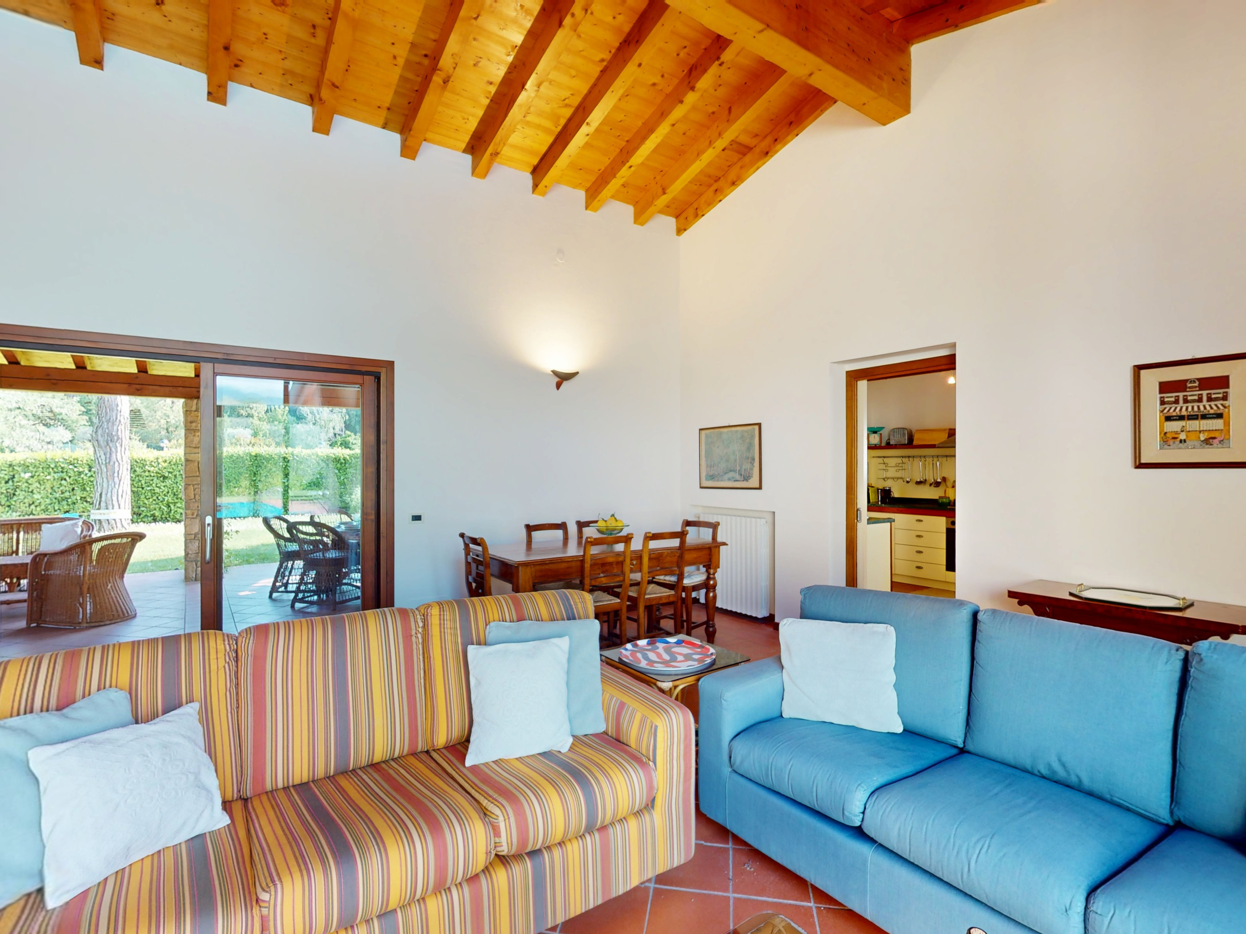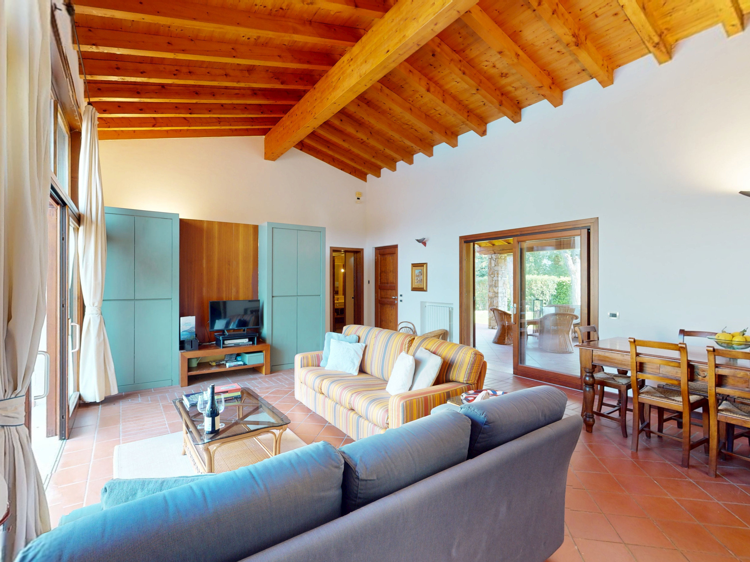 Tutto su un unico livello, l’abitazione si apre su ambienti ampi e luminosi, impreziositi da alti soffitti con travi in legno a vista che raccontano la tradizione architettonica italiana più autentica.