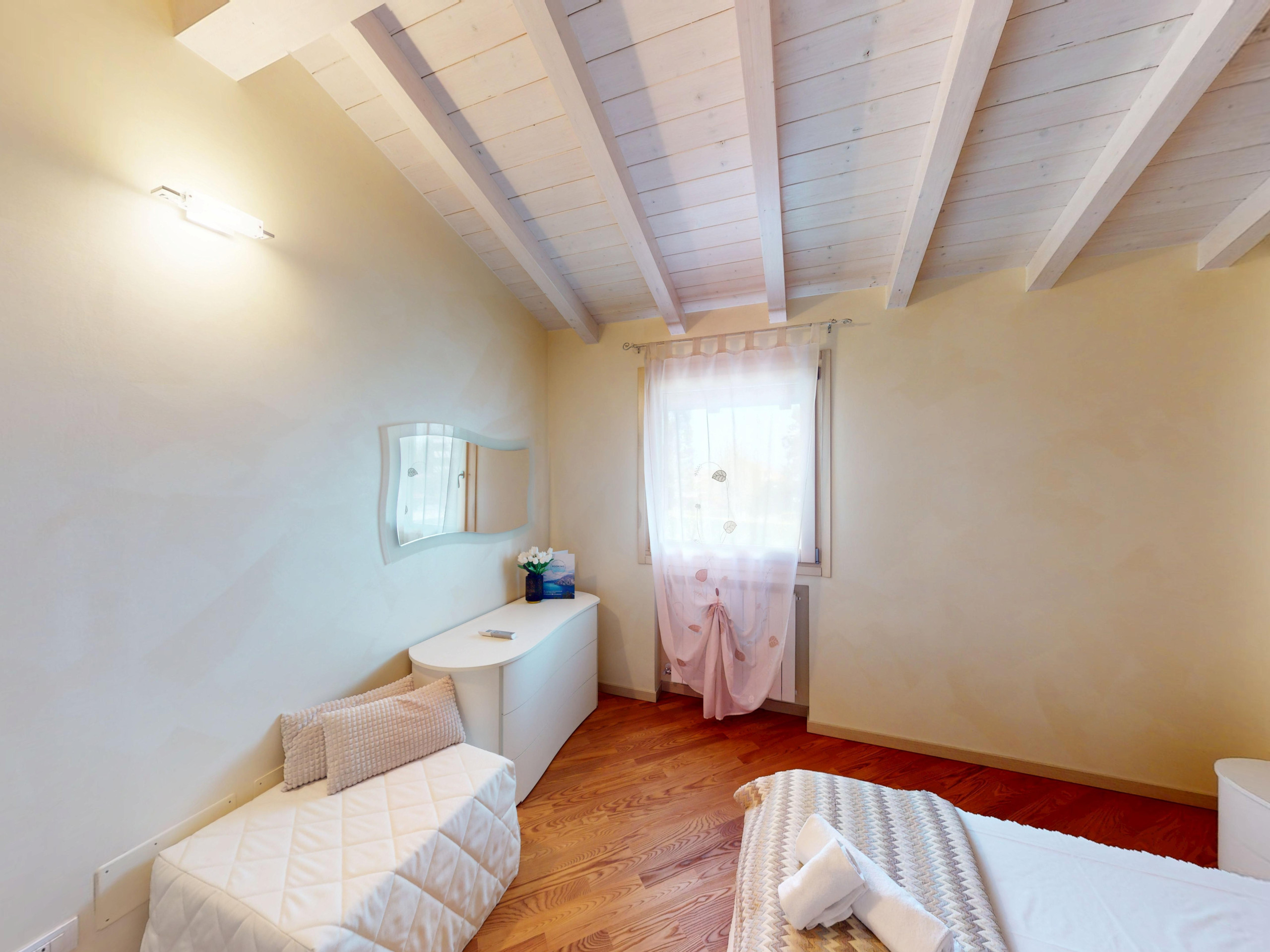 Zwei Schlafzimmer auf zwei Ebenen: ein Doppelzimmer mit privatem Bad im Obergeschoss und ein Zimmer mit zwei Einzelbetten im Erdgeschoss, die Privatsphäre und Komfort gewährleisten.