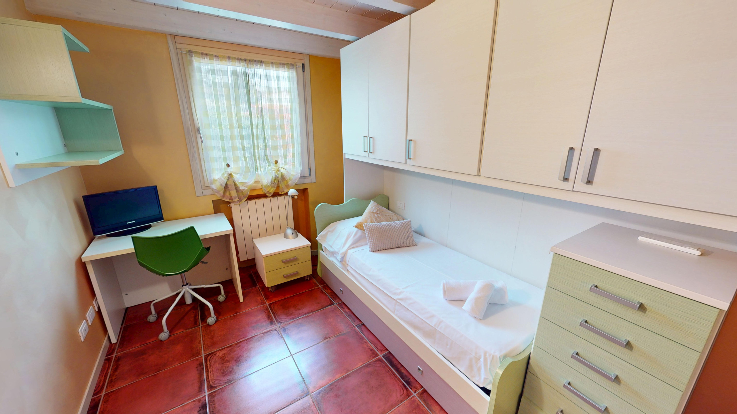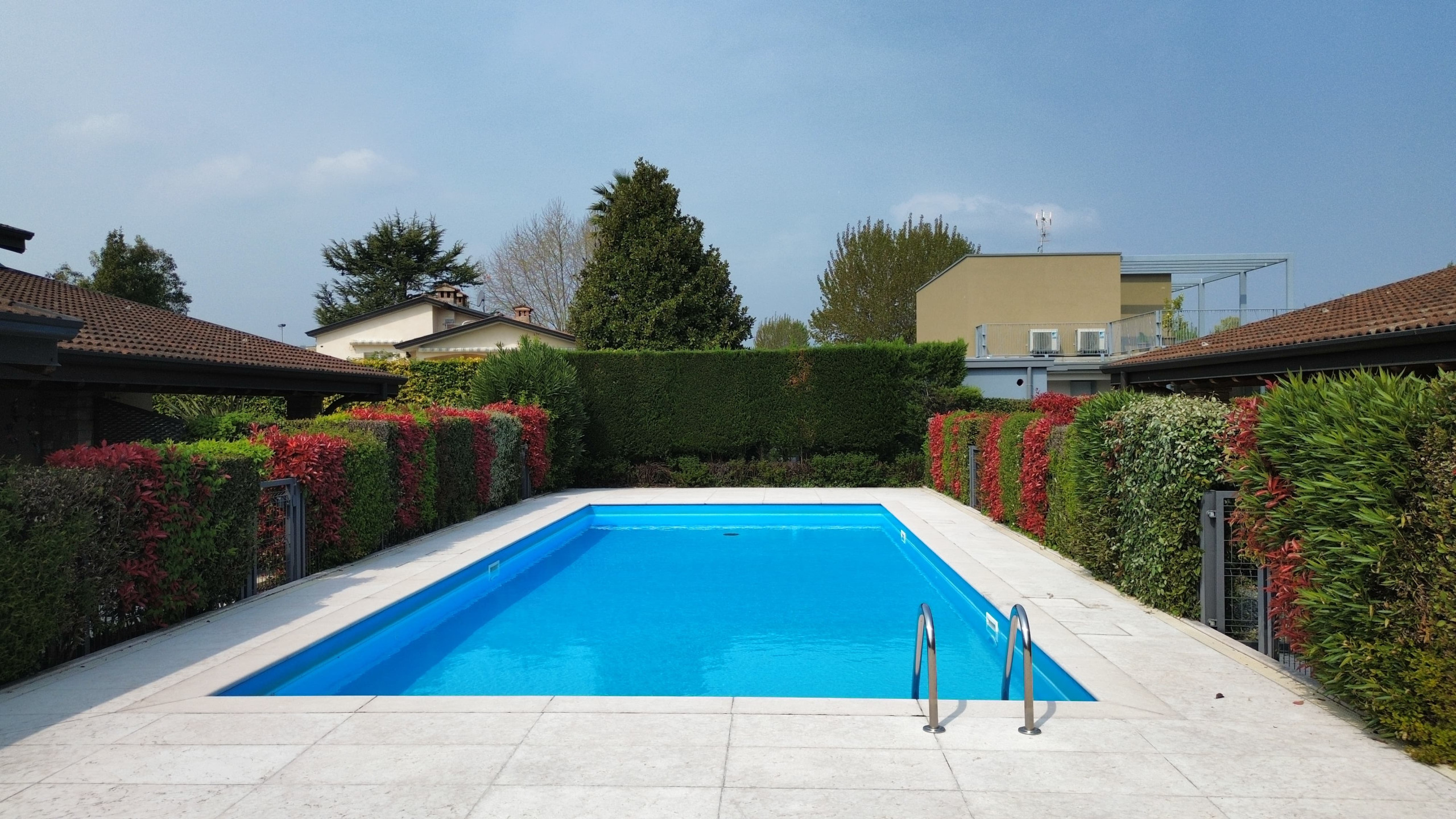Im Erdgeschoss lädt eine geräumige Wohnzone dazu ein, sich zwischen natürlichem Licht und gepflegten Räumen zu entspannen, mit direktem Zugang zur Außenveranda: Hier schaffen der Barbecue-Kamin, der große Tisch und der Blick auf den Pool die ideale Atmosphäre für Mahlzeiten im Freien und Abende unter den Sternen. Der eingezäunte Garten, ausgestattet mit Tisch und Liegestühlen, ist der perfekte Ort, um Entspannung zwischen Natur und Privatsphäre zu genießen.