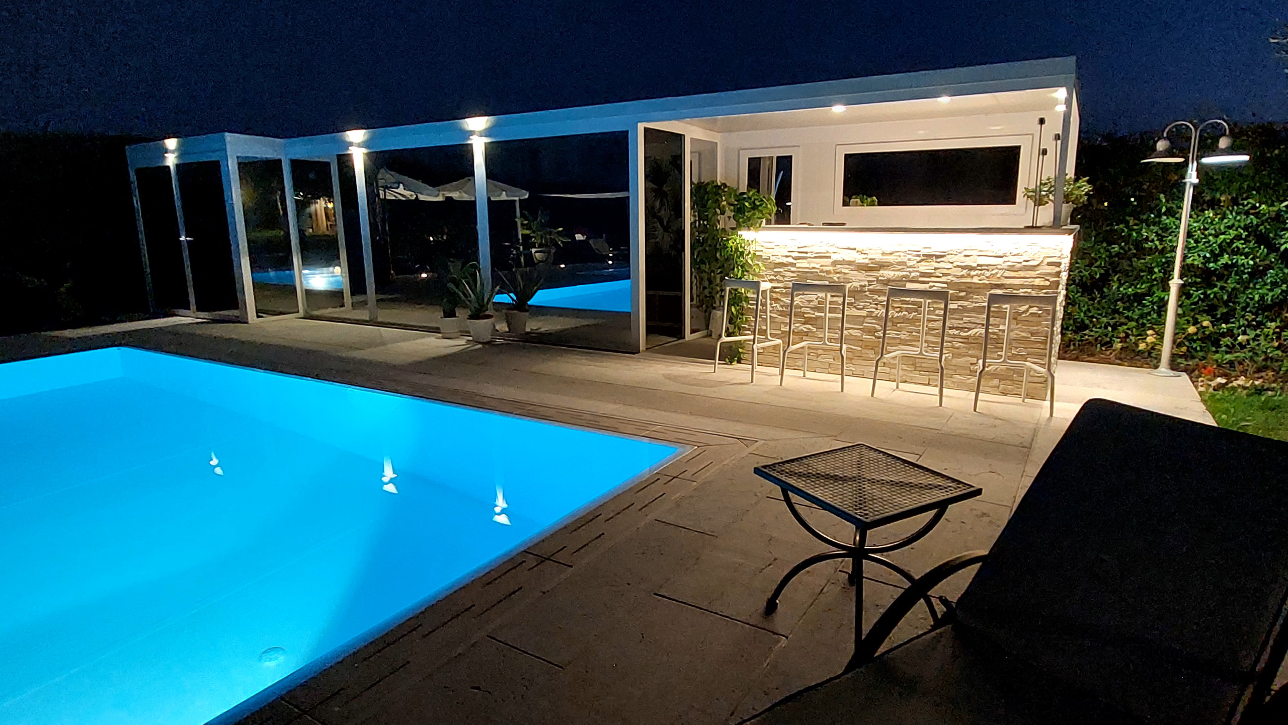 Das Herzstück der Residenz ist der wunderschöne 17 Meter lange Pool, der durch Whirlpool und ein kleines Bar zur Verfuegung aufgewertet wird und ideal für Entspannungsmomente oder zum Frühstücken im Freien ist. Daneben bietet ein elegantes Bad mit Dusche und Umkleidekabine weitere Praktikabilität.