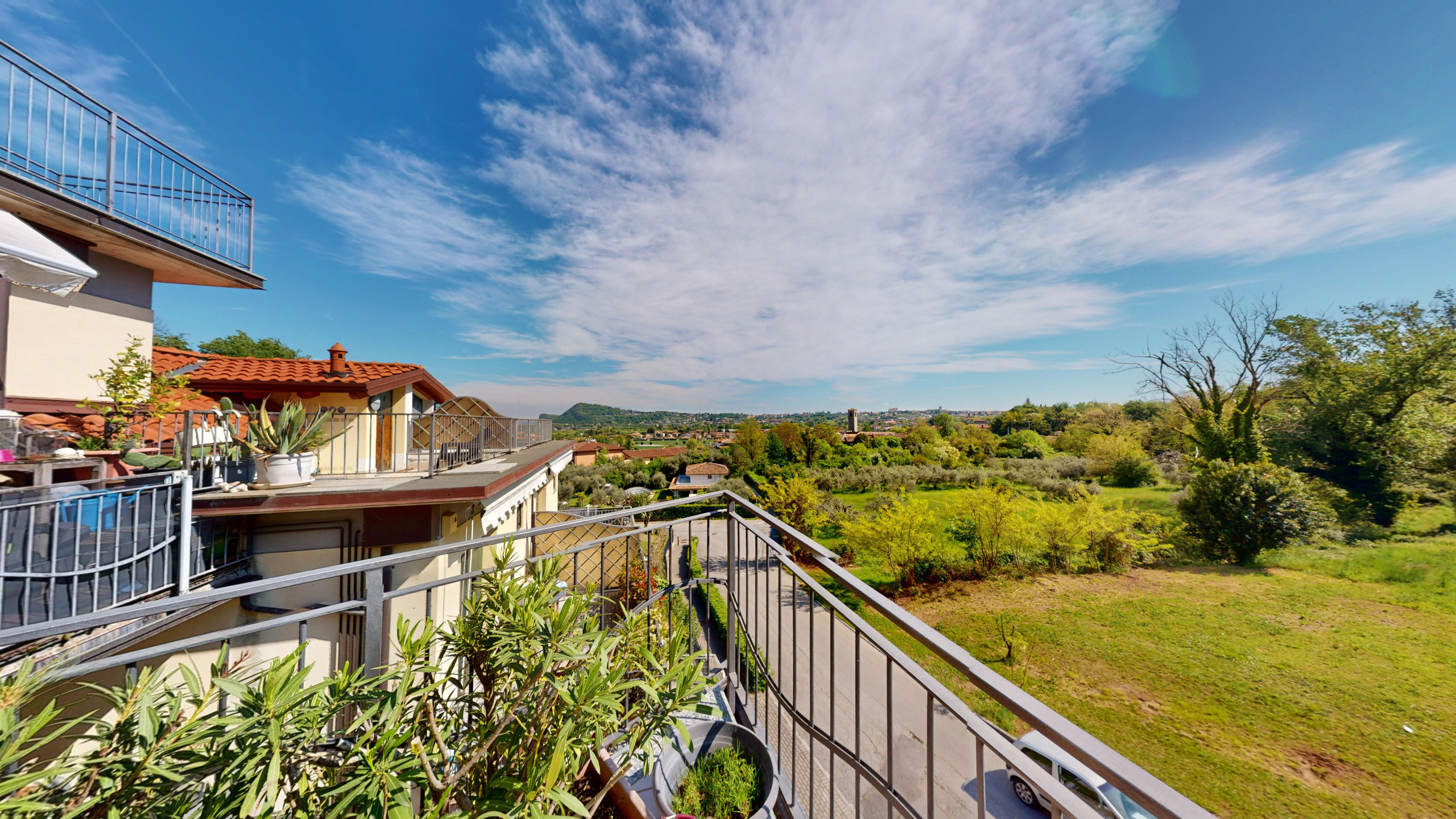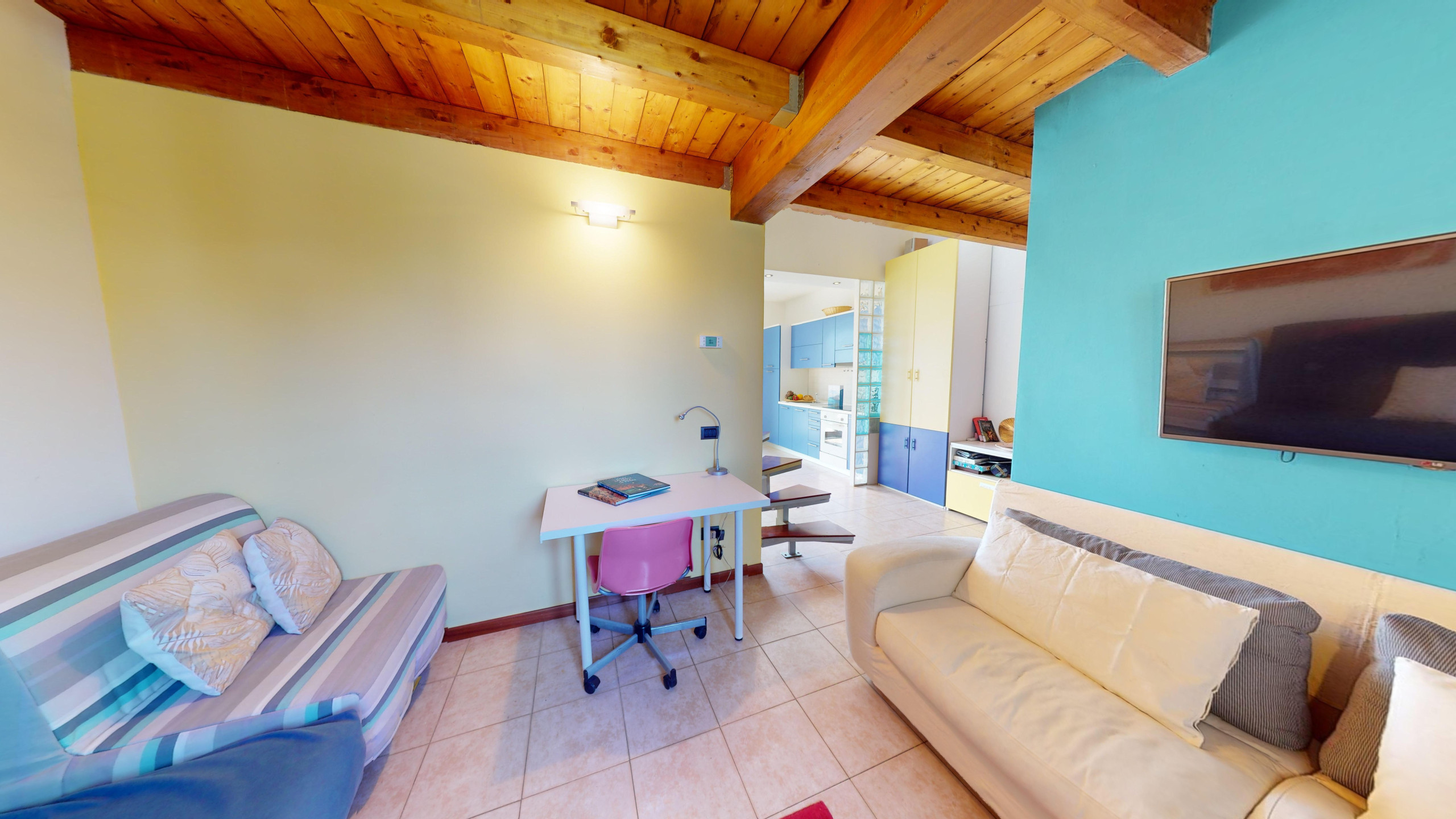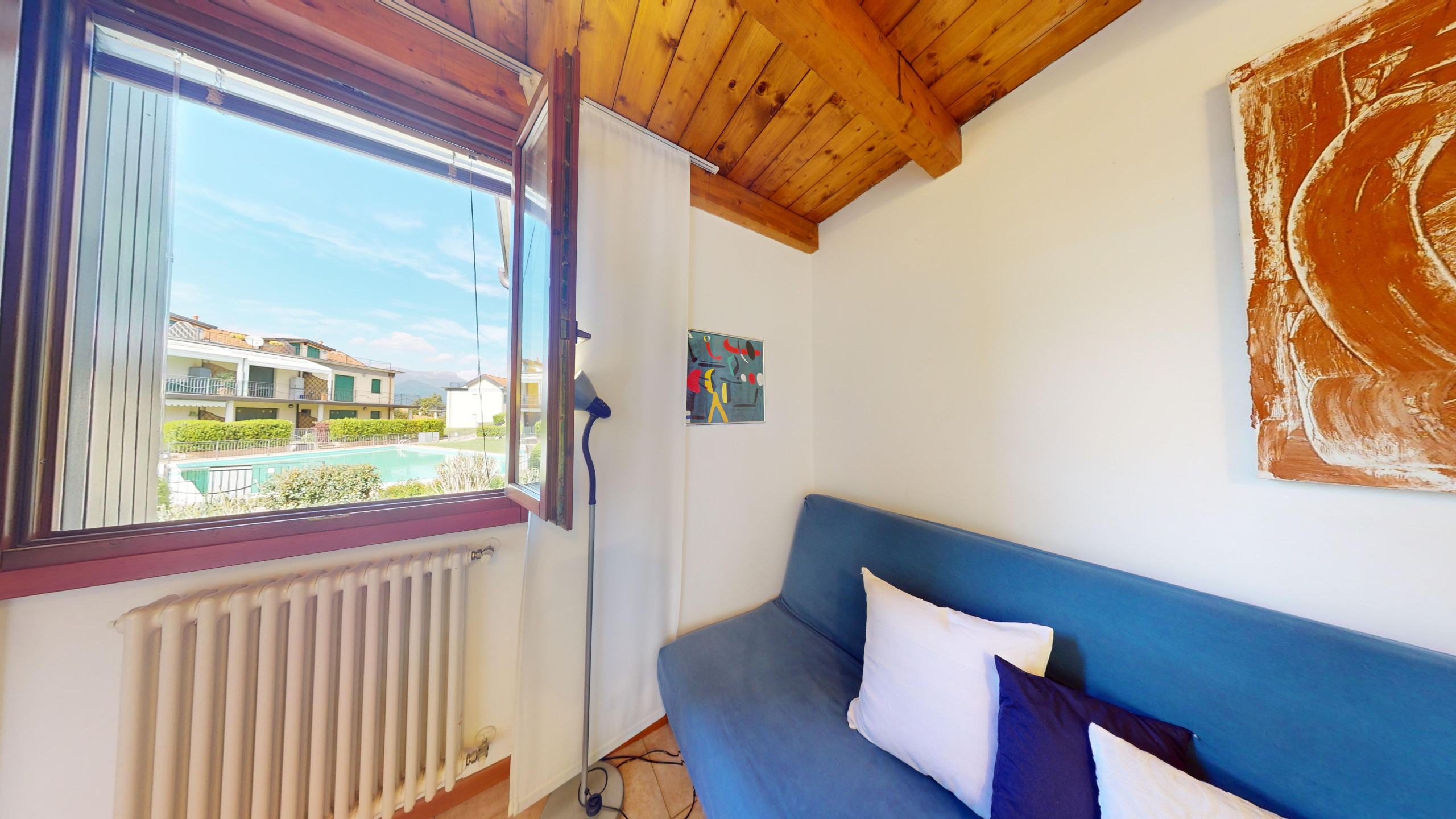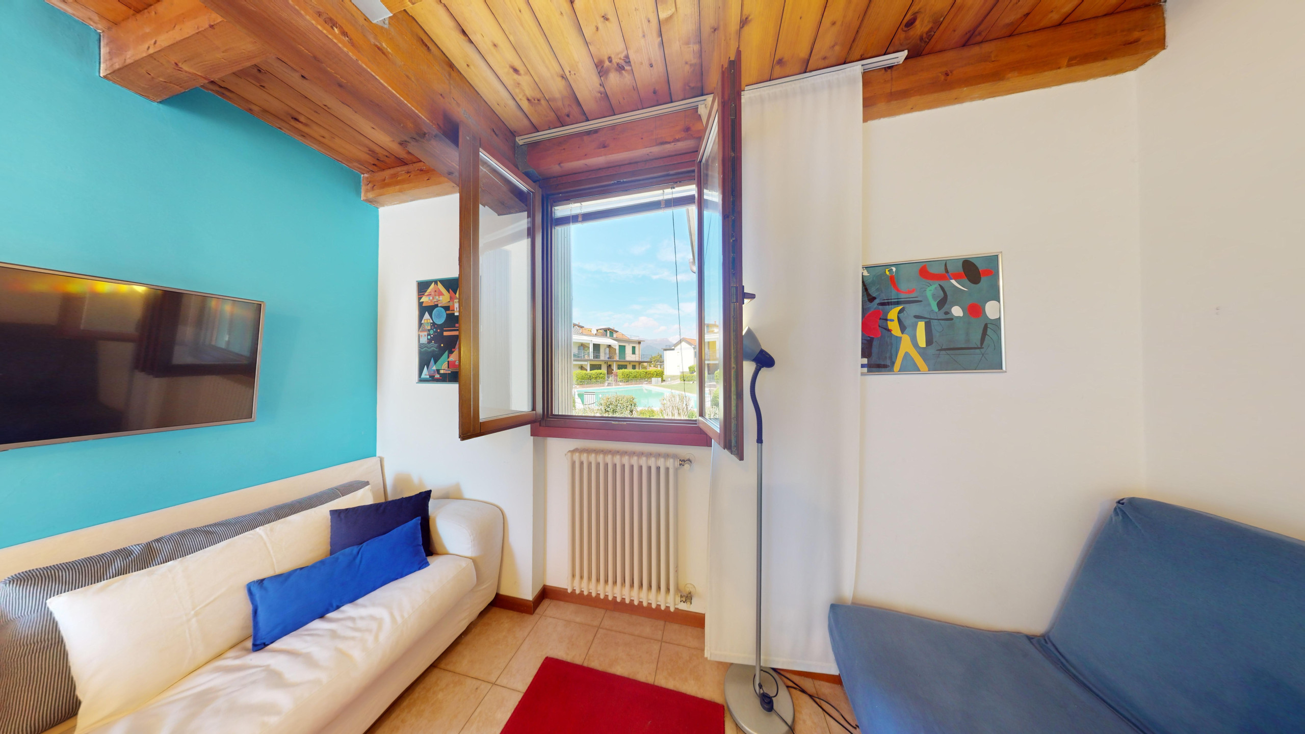 Vom Wohnzimmer aus gelangt man auf die komplett ausgestattete, große Terrasse mit Essbereich und Liegestühlen, von der aus man den felsigen Vorsprung der Rocca di Manerba und das Naturschutzgebiet des Sasso bewundern kann. Im Dachgeschoss befindet sich das Doppelschlafzimmer mit eigenem Bad mit Dusche und Waschmaschine. Die Immobilie ist mit Bildschirmen ausgestattet. Vom Schlafzimmer aus gelangt man auf die Sonnenterrasse mit Seeblick, von der aus man den Vorsprung, den Glockenturm der Pieve Vecchia und den üppigen Grün der Wälder mit den charakteristischen Olivenfeldern in völliger Privatsphäre bewundern kann.