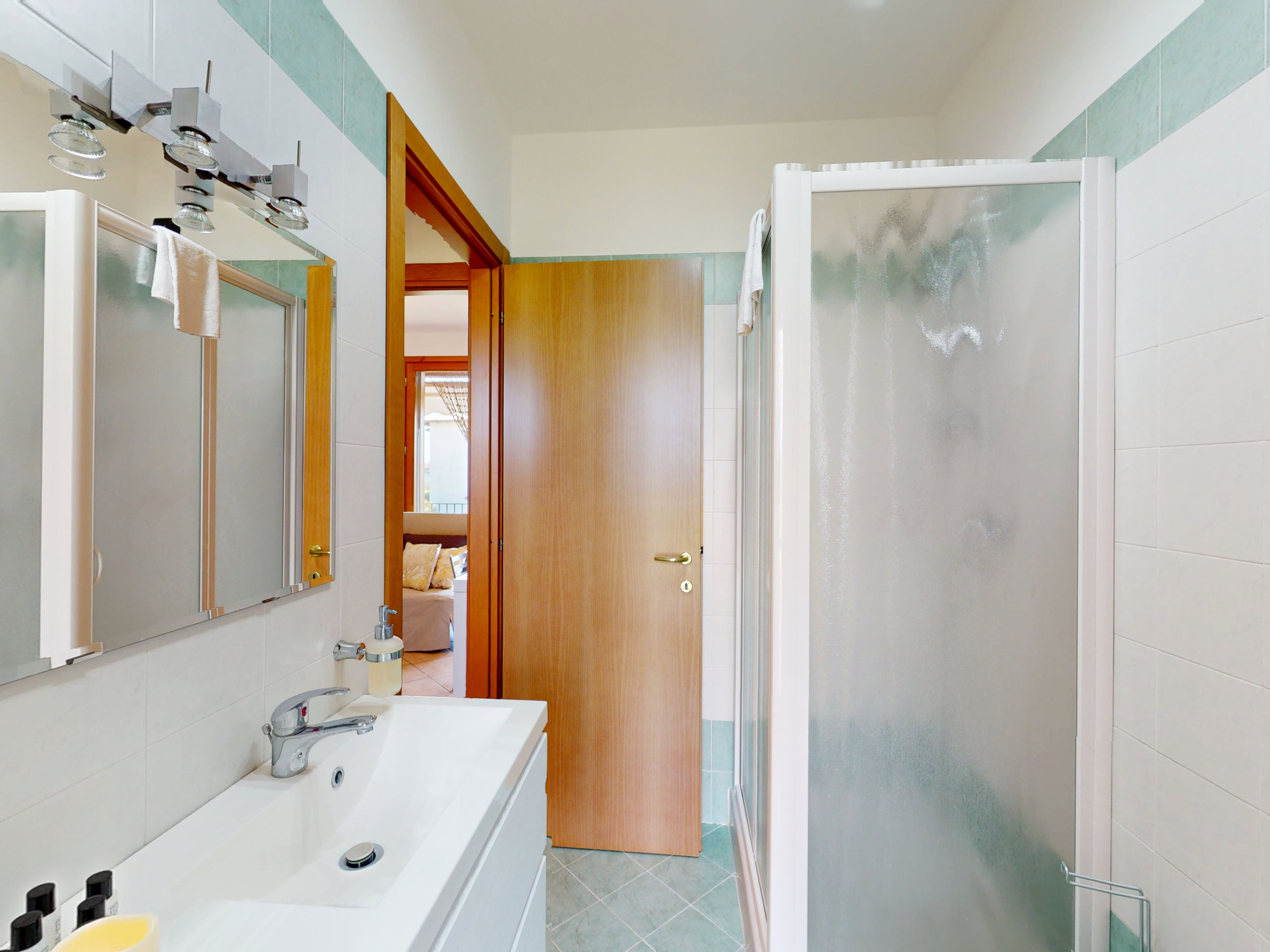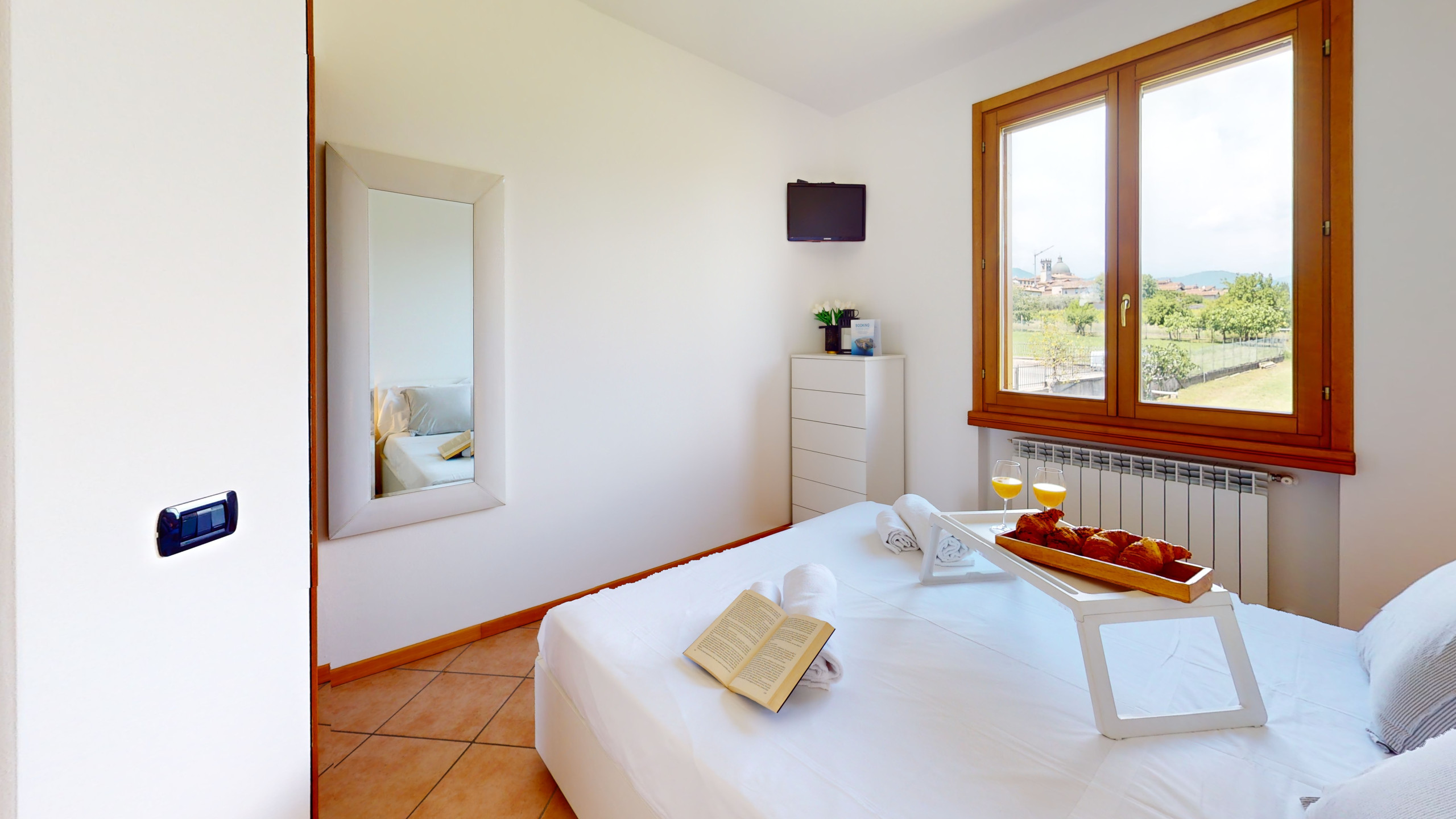 Das Schlafzimmer, ruhig und geräumig, ist perfekt für diejenigen, die auch an heißen Tagen eine erholsame Ruhe suchen.