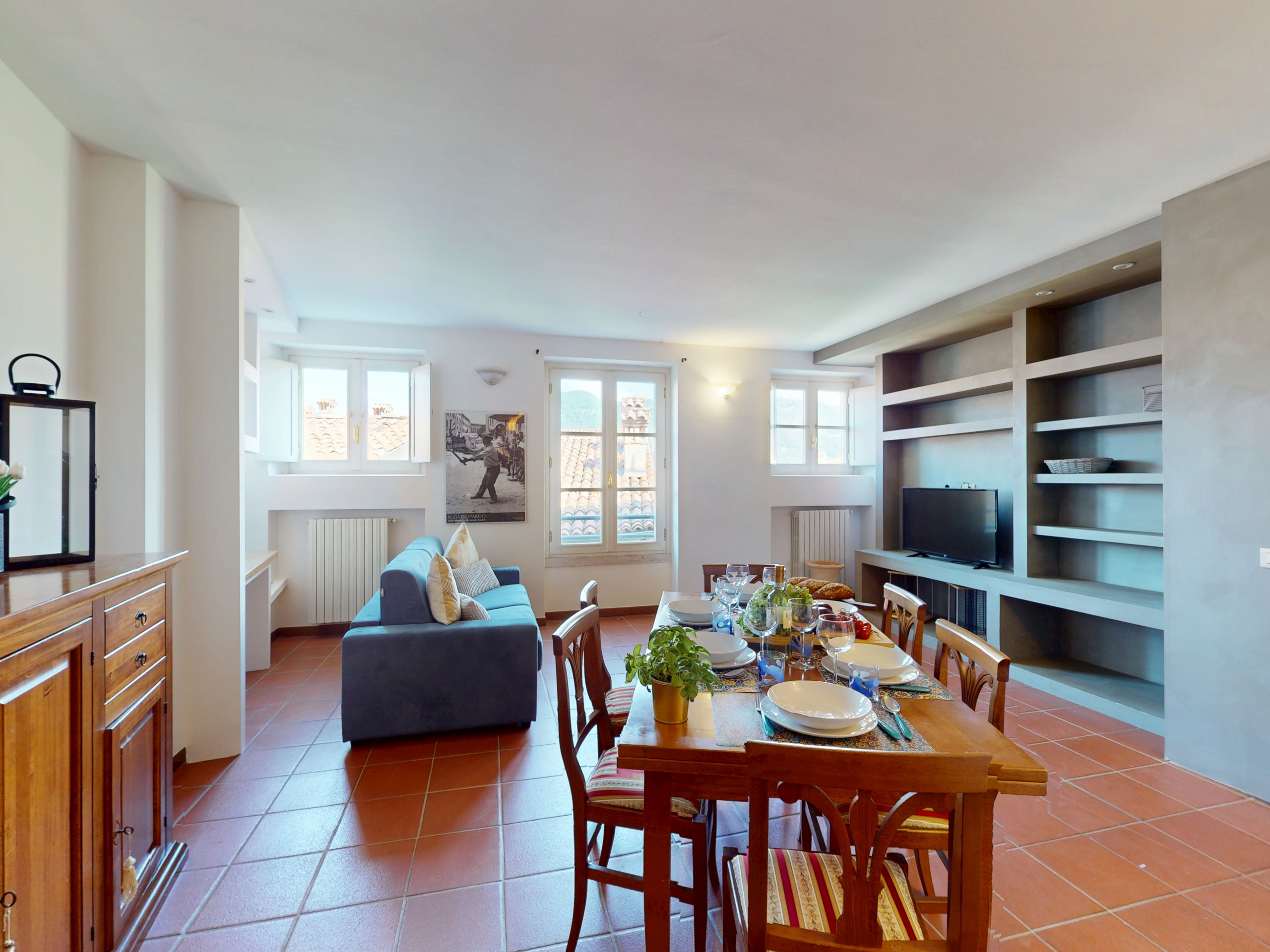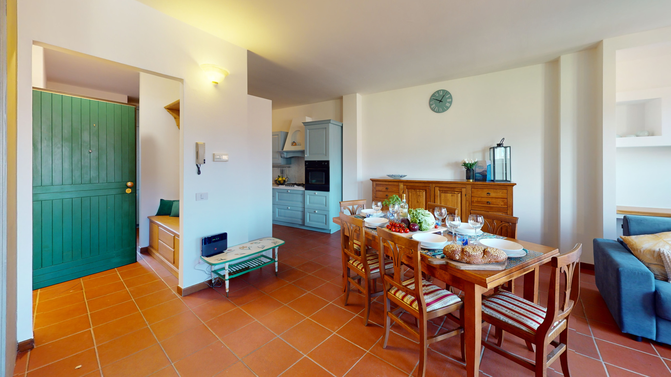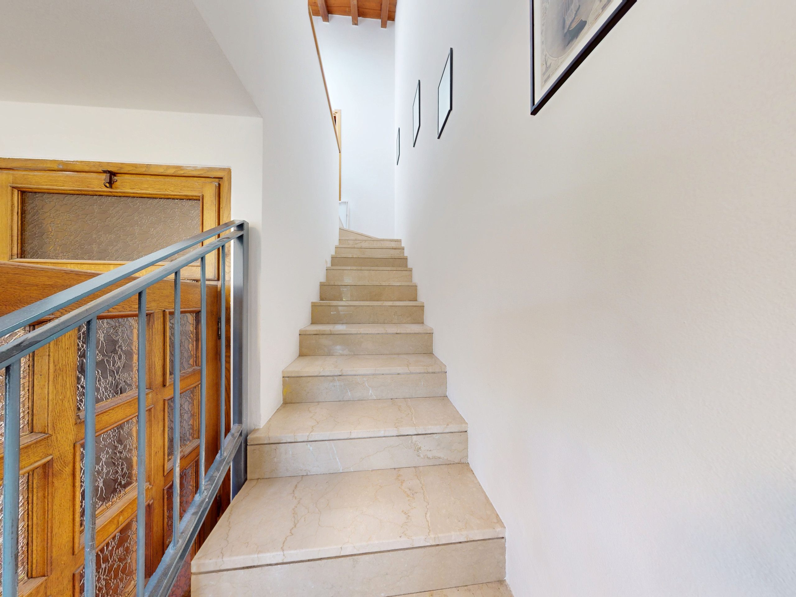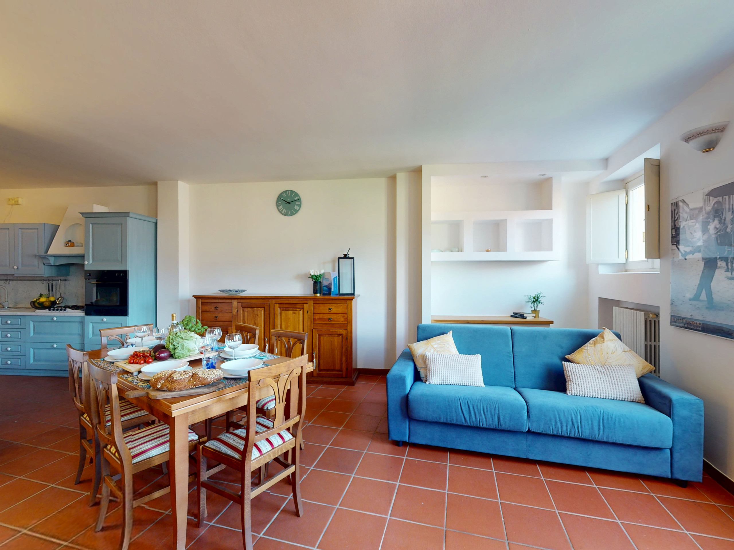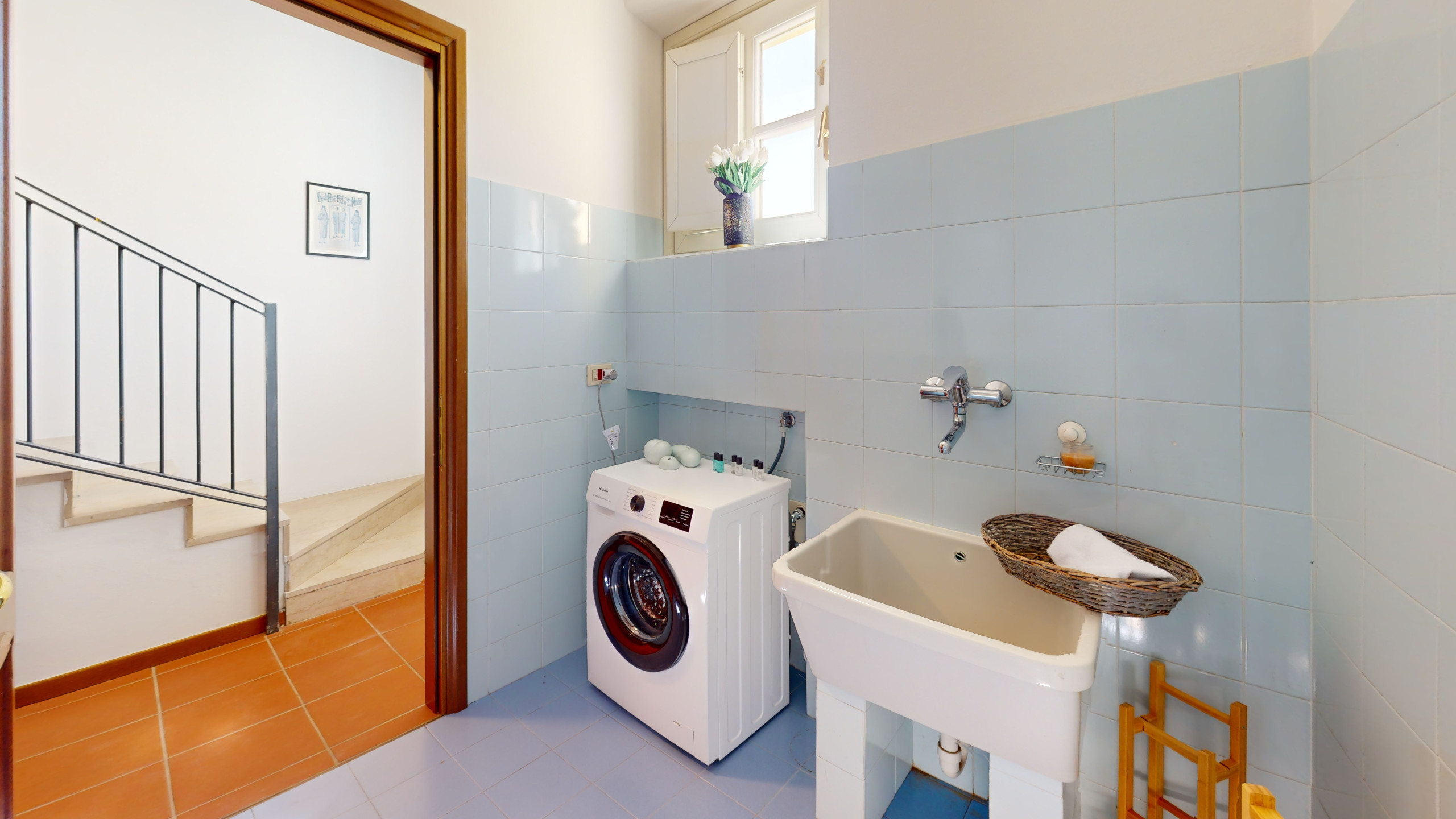 Im ersten Stock erwartet Sie eine geräumige Wohnzone mit heller und einladender Atmosphäre, mit einer vollständig ausgestatteten Küche: perfekt zum Zubereiten von Familienmahlzeiten oder Abendessen mit Freunden.
