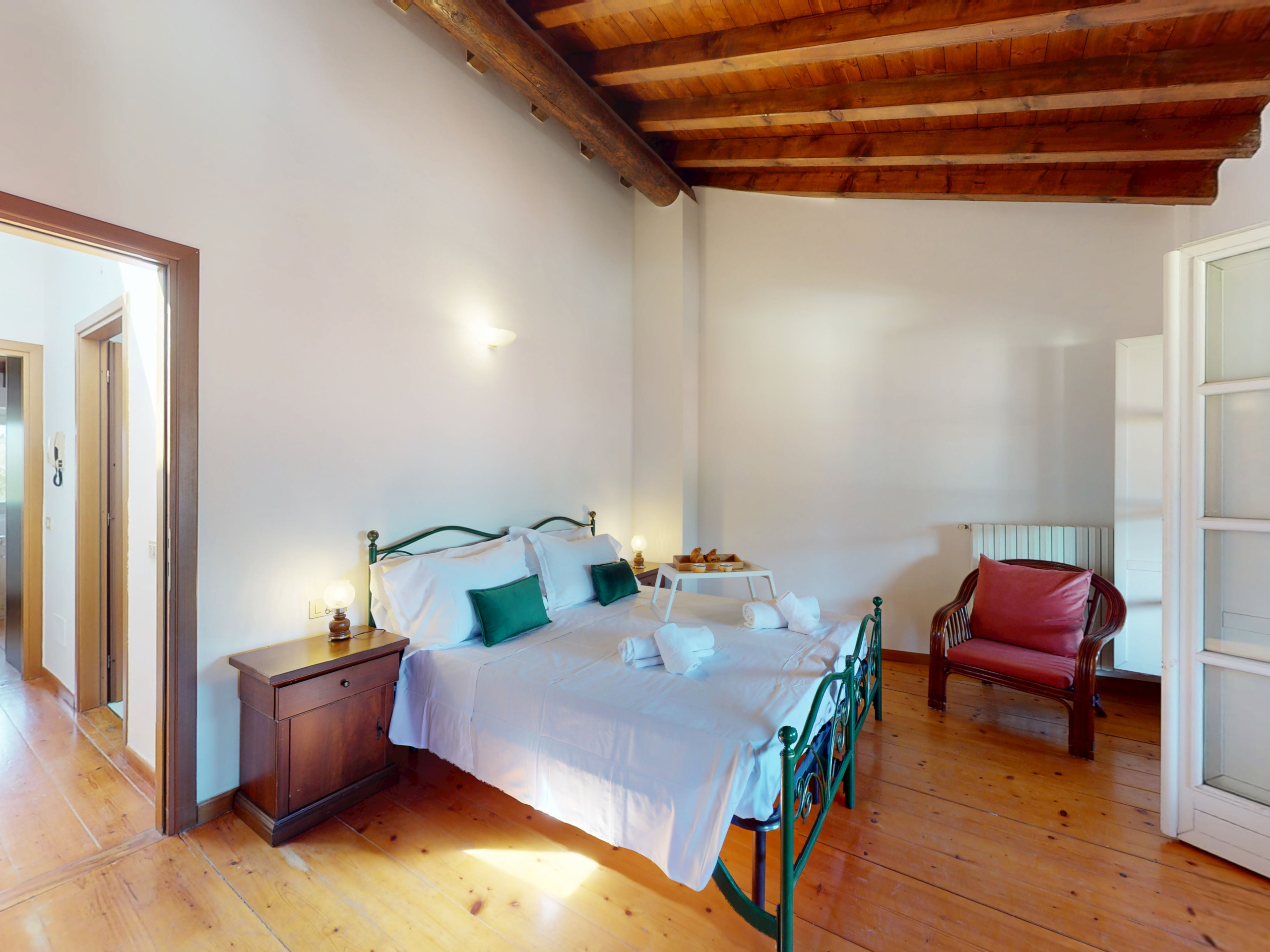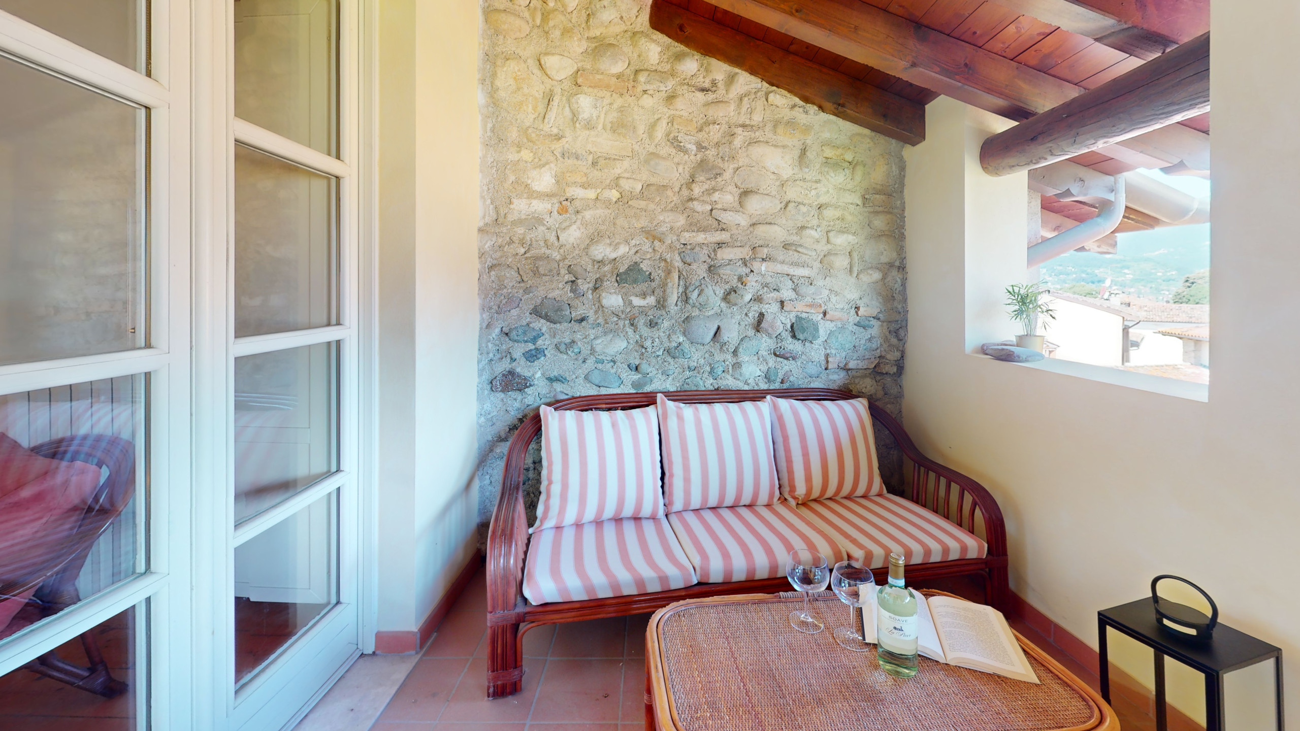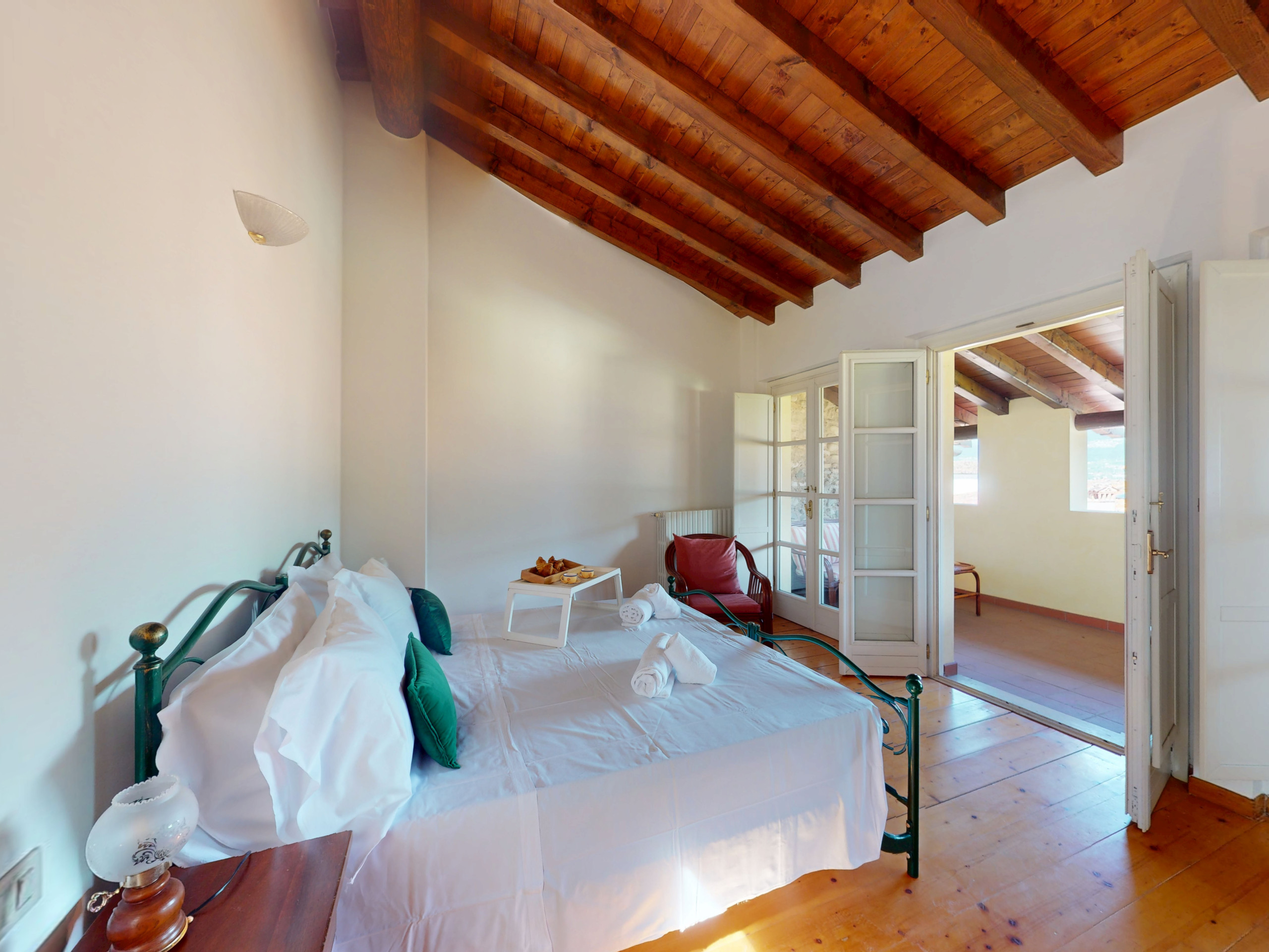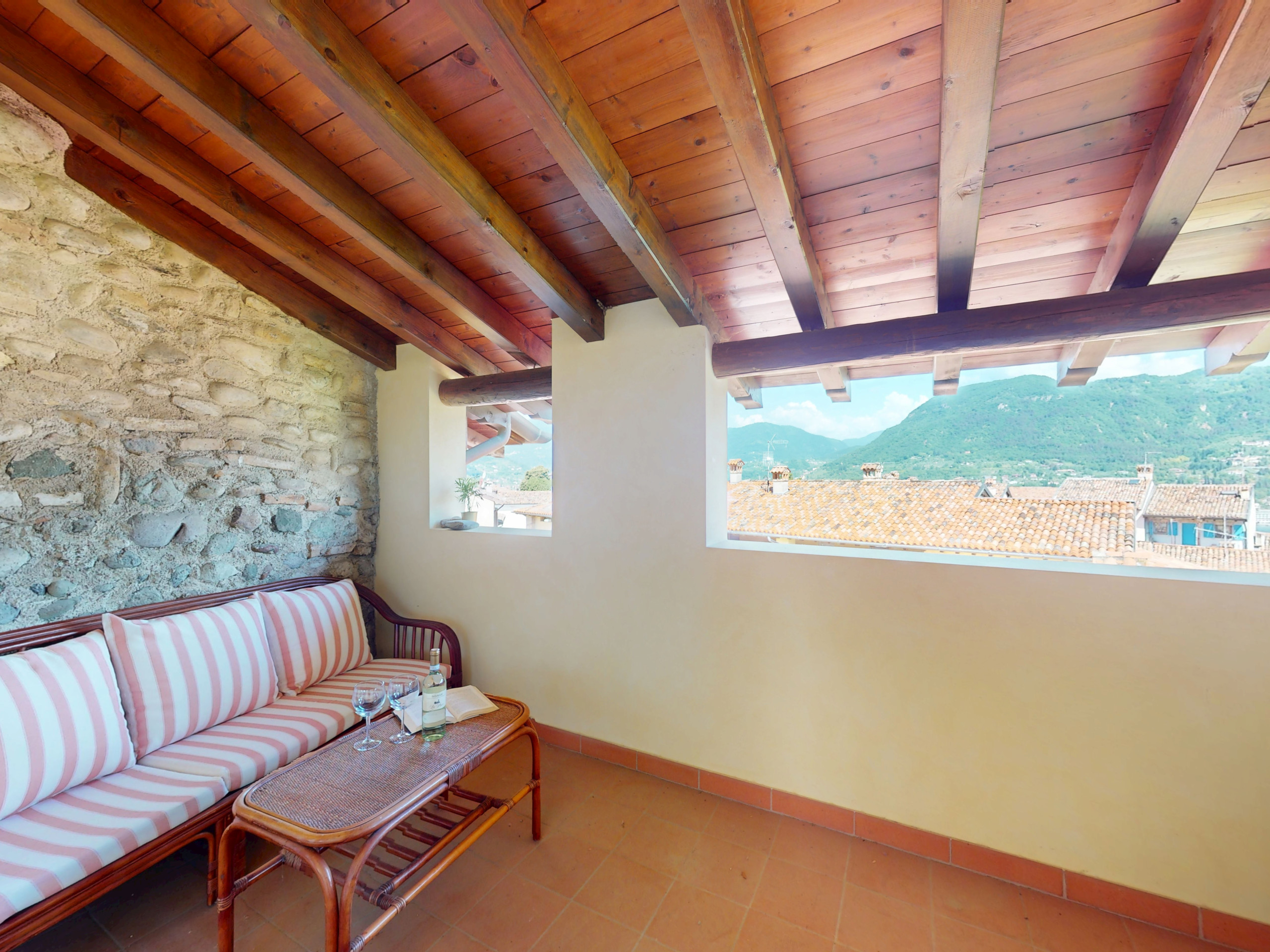 Im Obergeschoss öffnet sich der Raum zu zwei Schlafzimmern mit stimmungsvollen Sichtbalken: Das Hauptschlafzimmer, geräumig und entspannend, führt auf eine private, möblierte Terrasse mit Tisch und Stühlen, von der aus man einen herrlichen Blick auf den See genießt - perfekt für ein Frühstück im Freien oder einen Aperitif bei Sonnenuntergang.