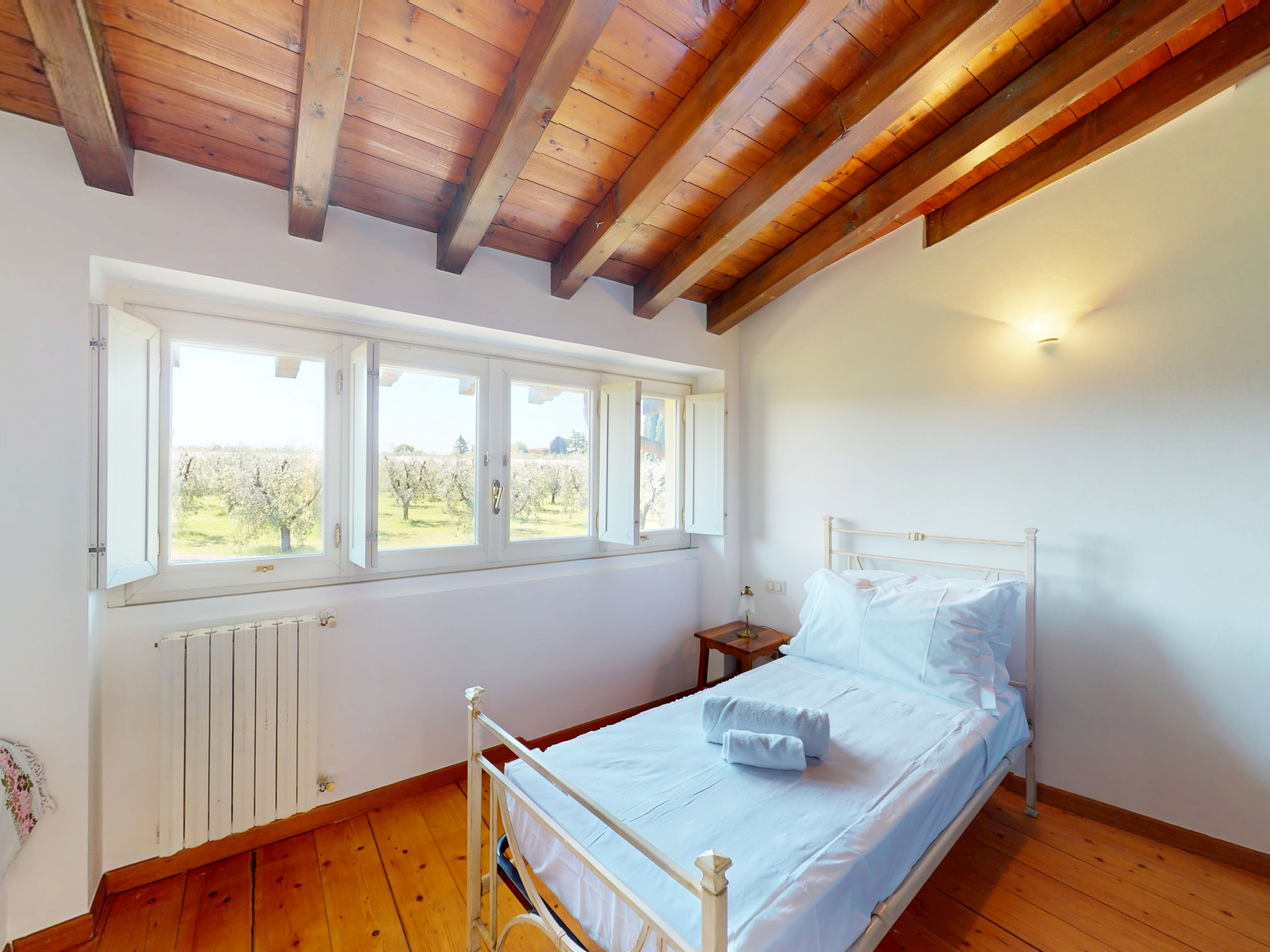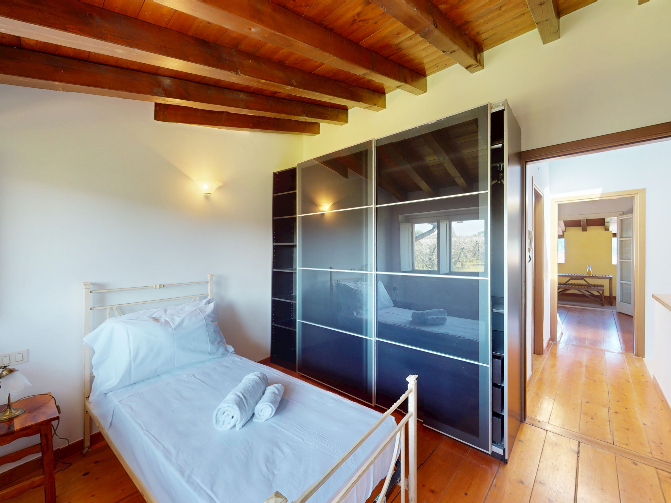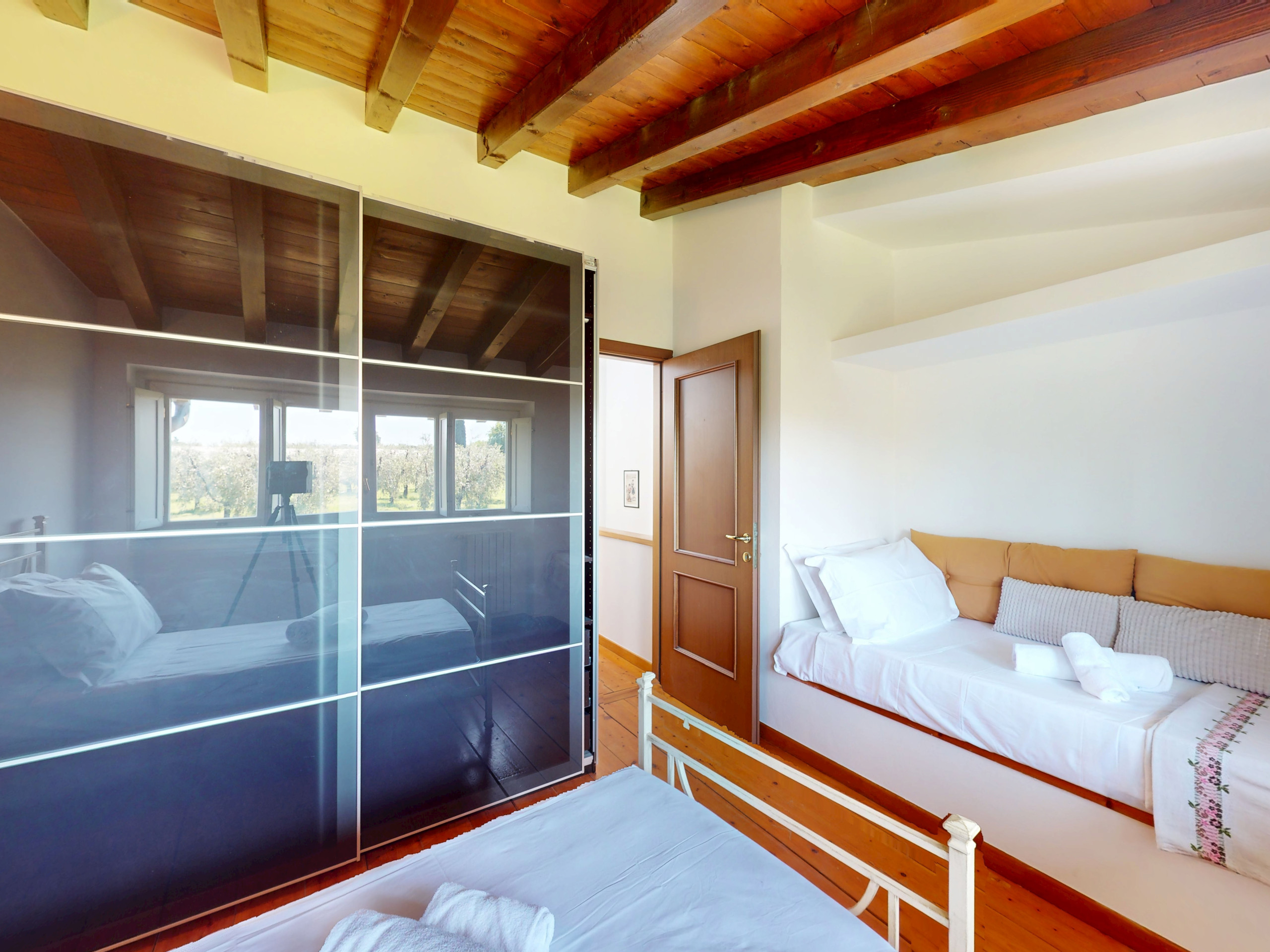 Das zweite Schlafzimmer, ebenfalls hell und ruhig, ist mit zwei Einzelbetten ausgestattet und blickt auf die grünen Olivenhaine, die die Gegend umgeben.