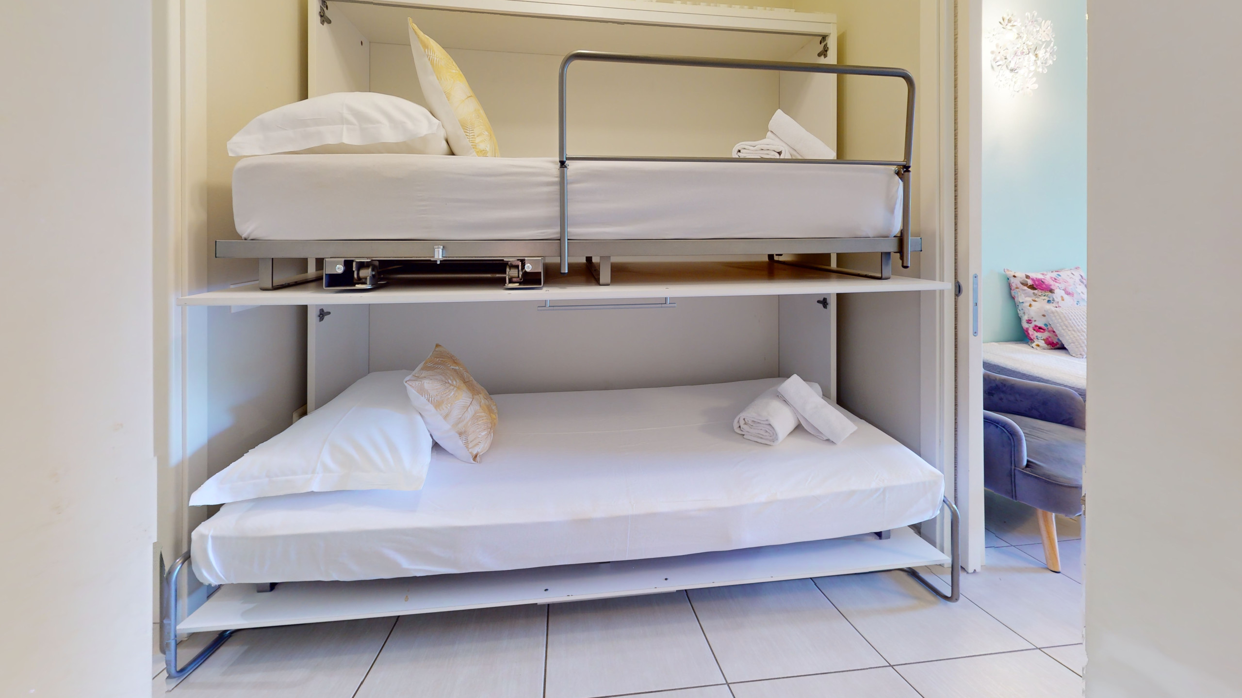 Das Innere besteht aus einem hellen Wohnbereich mit vollständig ausgestatteter Küche, Essbereich und Schlafsofa, während das geräumige Doppelzimmer sich zum zweiten Garten öffnet, der als Relaxbereich und Spielfläche für Kinder eingerichtet ist.