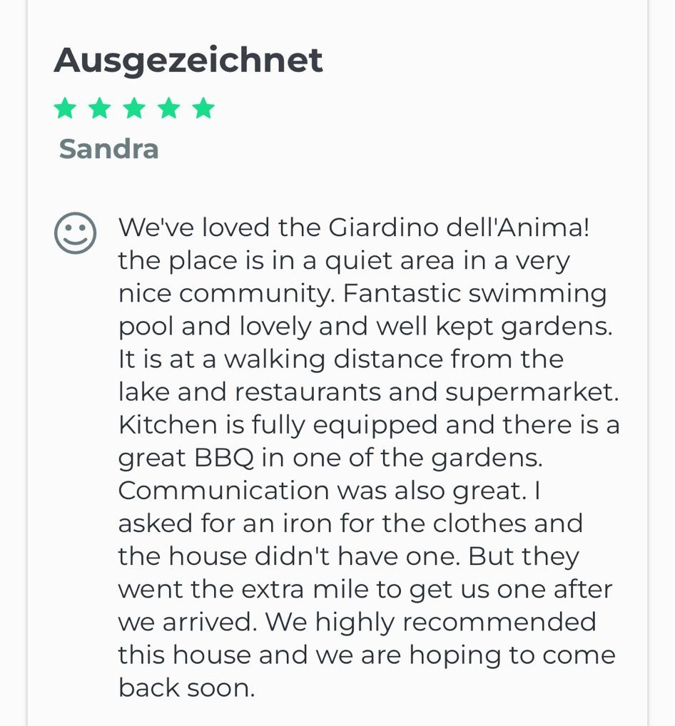 We've loved the Giardino dell'Anima! the place is in a quiet area in a very nice community. Fantastic swimming pool and lovely and well kept gardens. It is at a walking distance from the lake and restaurants and supermarket. Kitchen is fully equipped and there is a great BBQ in one of the gardens. Communication was also great. I asked for an iron for the clothes and the house didn't have one. But they went the extra mile to get us one after we arrived. We highly recommended this house and we are hoping to come back soon.