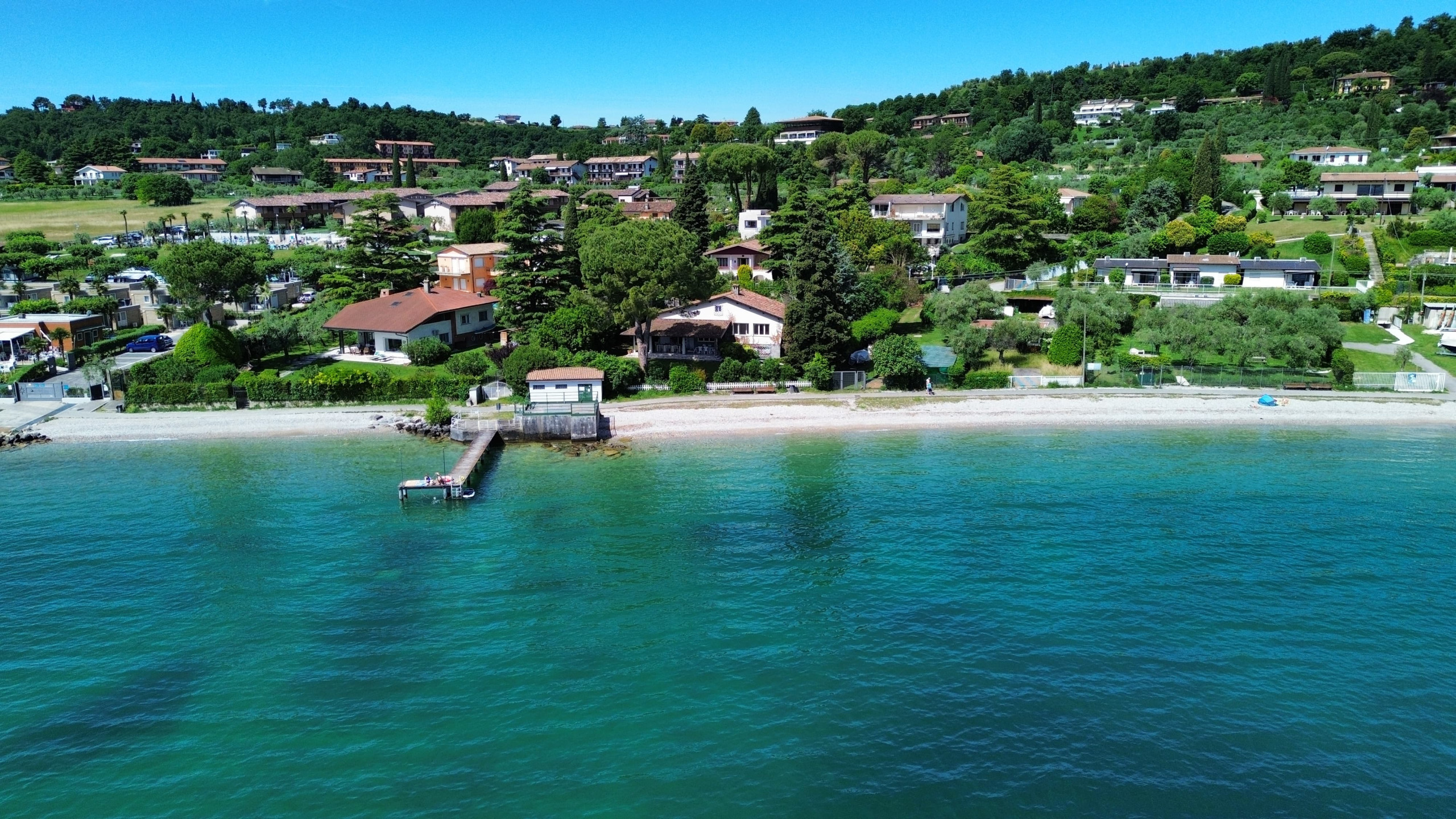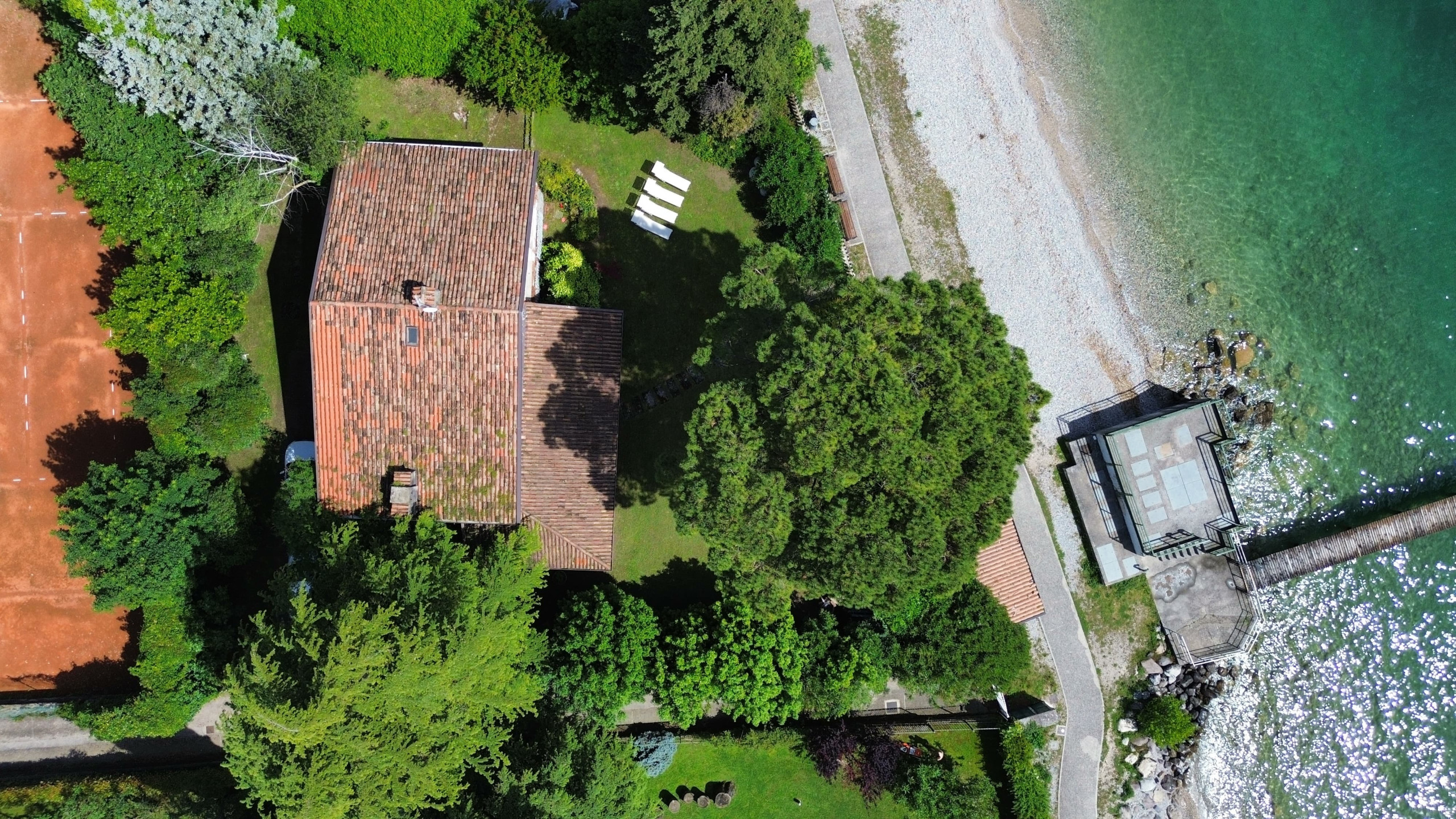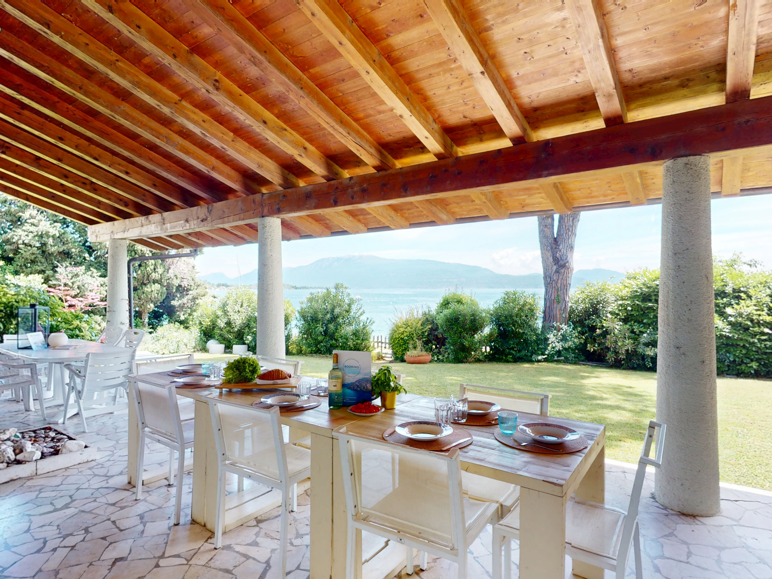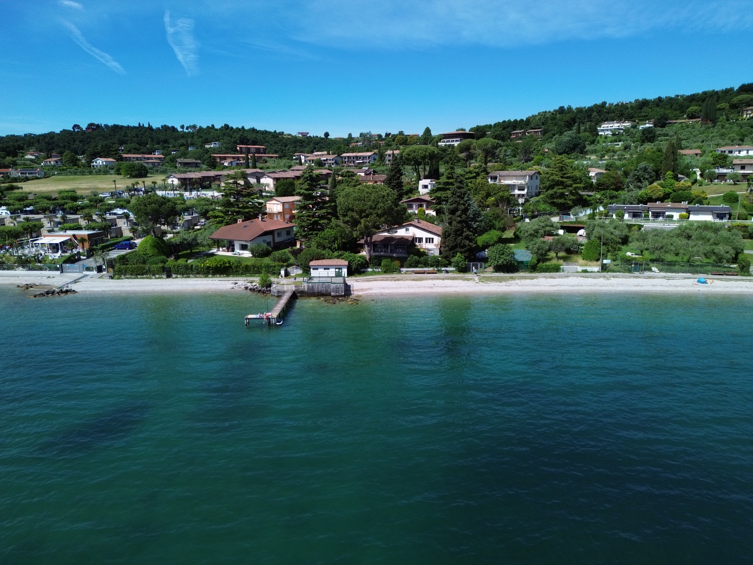 Das Herzstück des Hauses ist die große Außenterrasse: möbliert, geräumig und mit direktem Zugang zum Strand. Ein magischer Ort, um morgens das Frühstück zu genießen, bei Sonnenuntergang zu entspannen oder unter den Sternen zu dinieren, eingetaucht in die natürliche Schönheit der prestigeträchtigsten Zone des Gardasees.