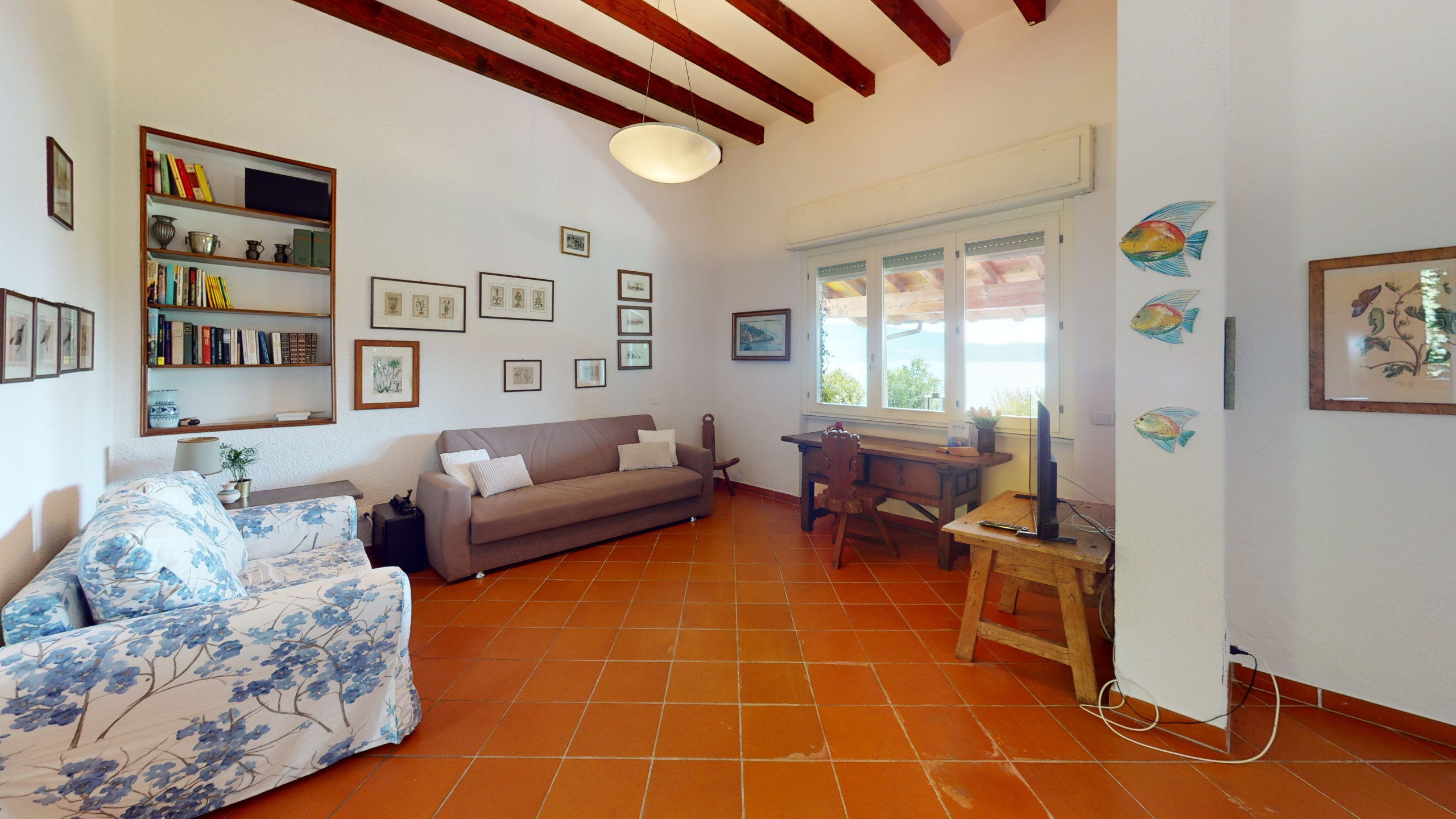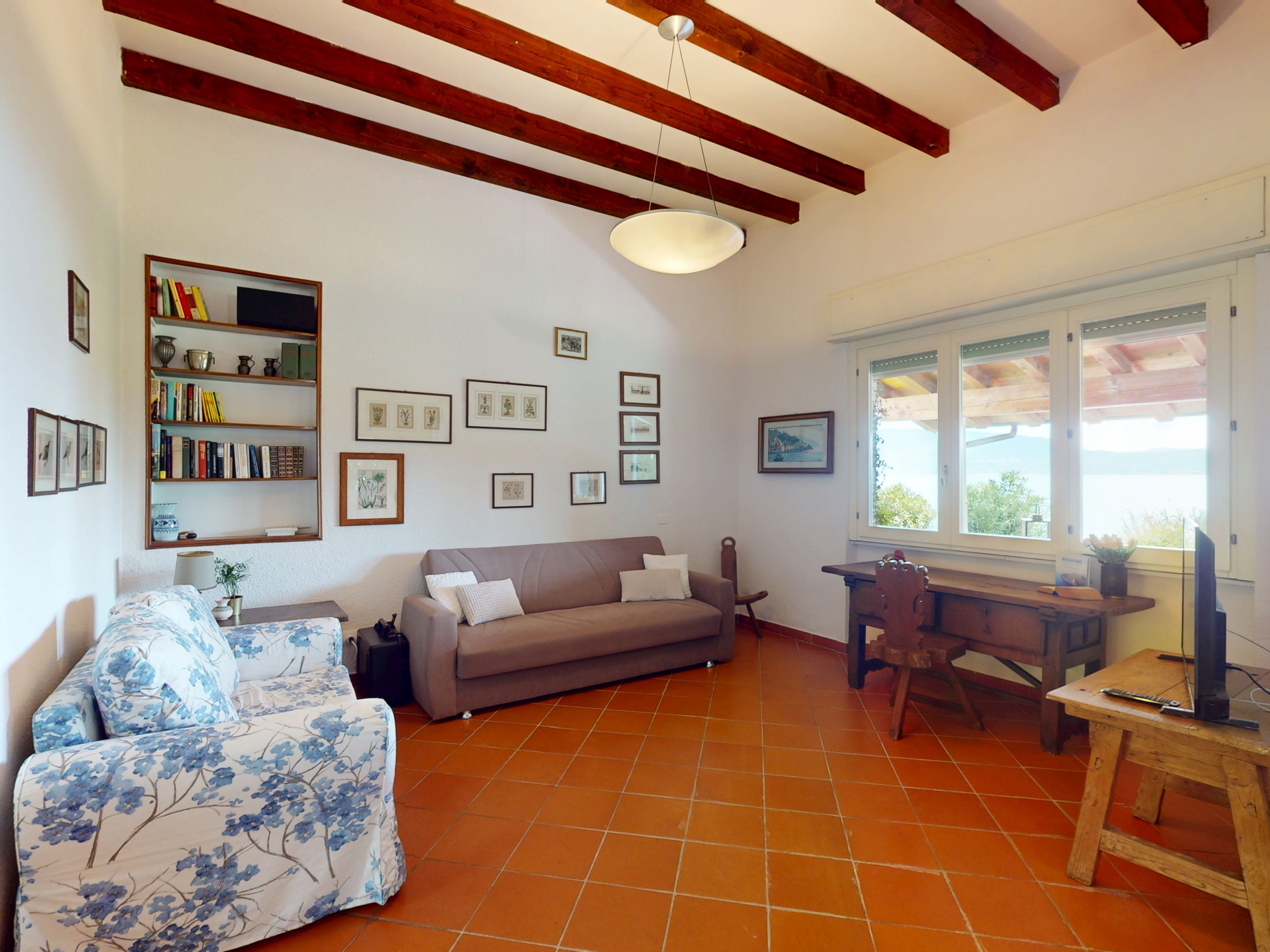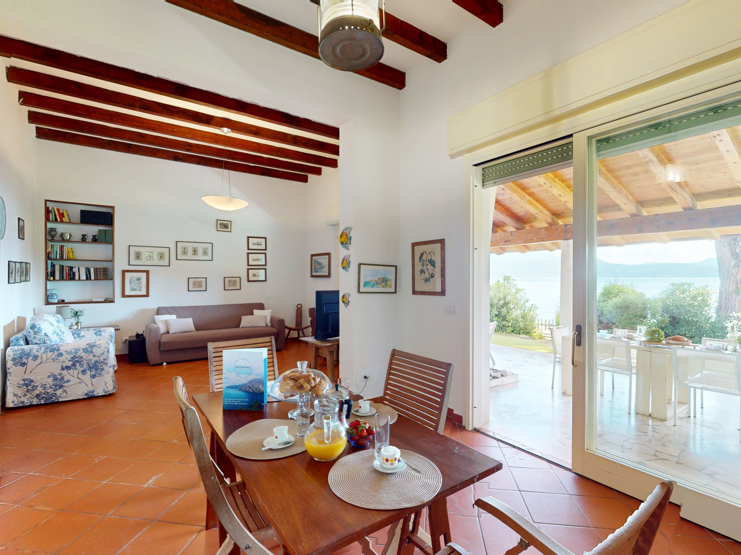 Der geräumige und helle Wohnbereich im typisch italienischen Stil lädt zum Entspannen ein. Die große Glasfront bietet einen durchgehenden Blick auf den Garten und den See.
