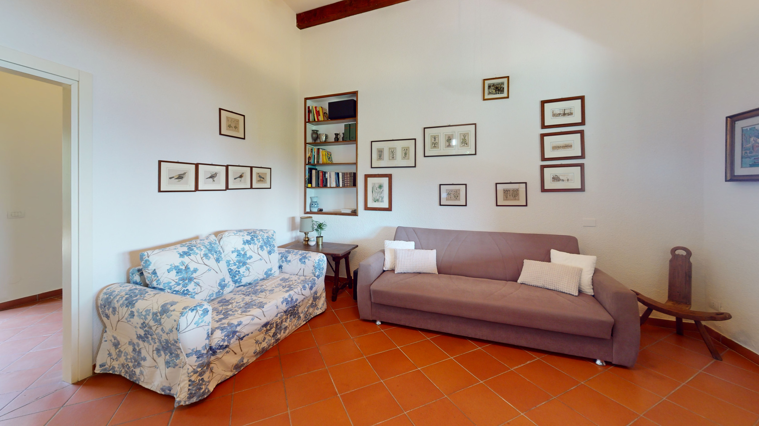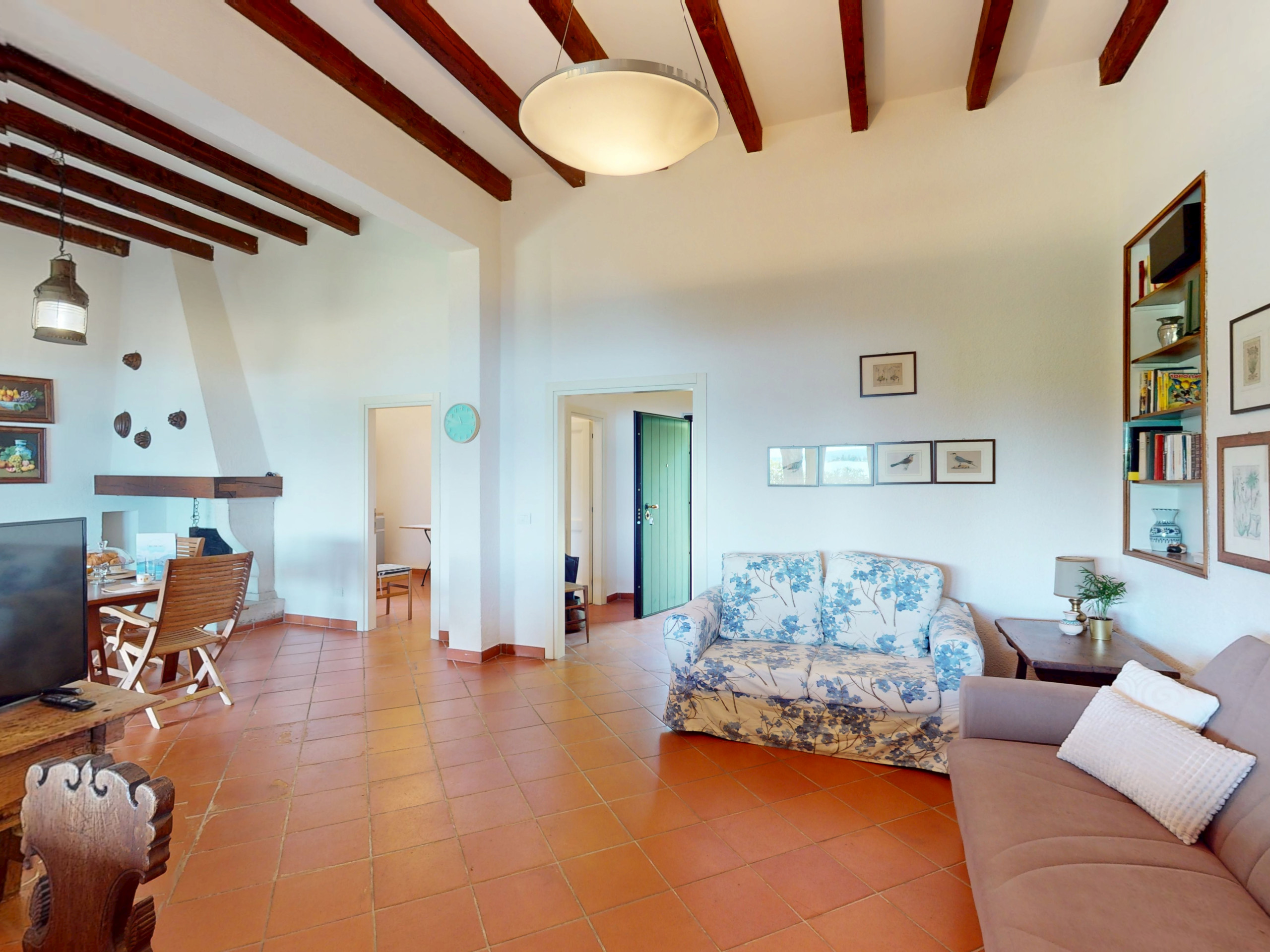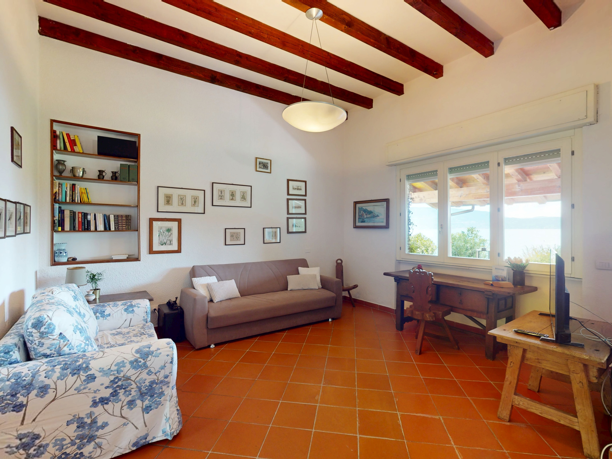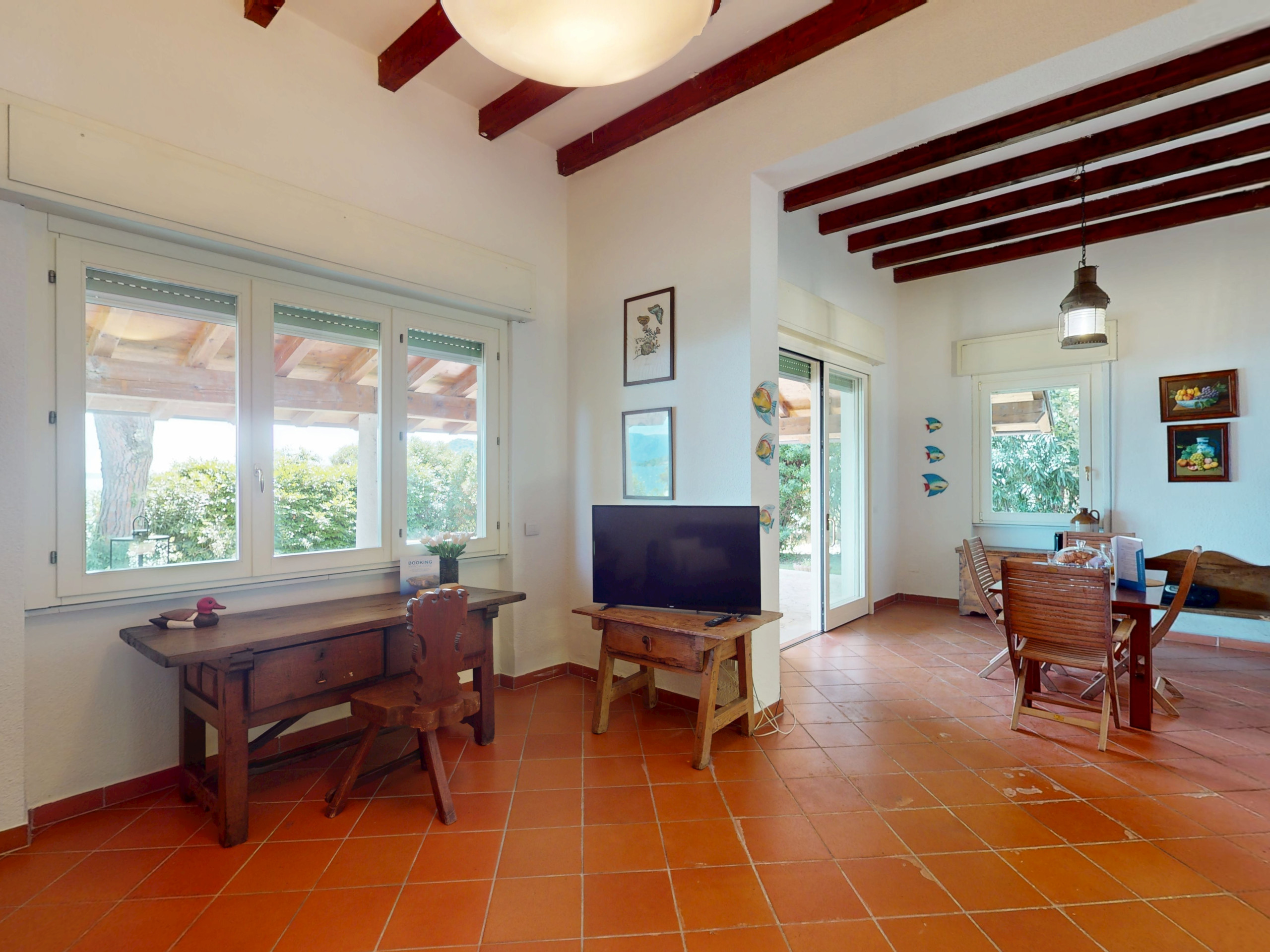 Der geräumige und helle Wohnbereich im typisch italienischen Stil lädt zum Entspannen ein. Die große Glasfront bietet einen durchgehenden Blick auf den Garten und den See.