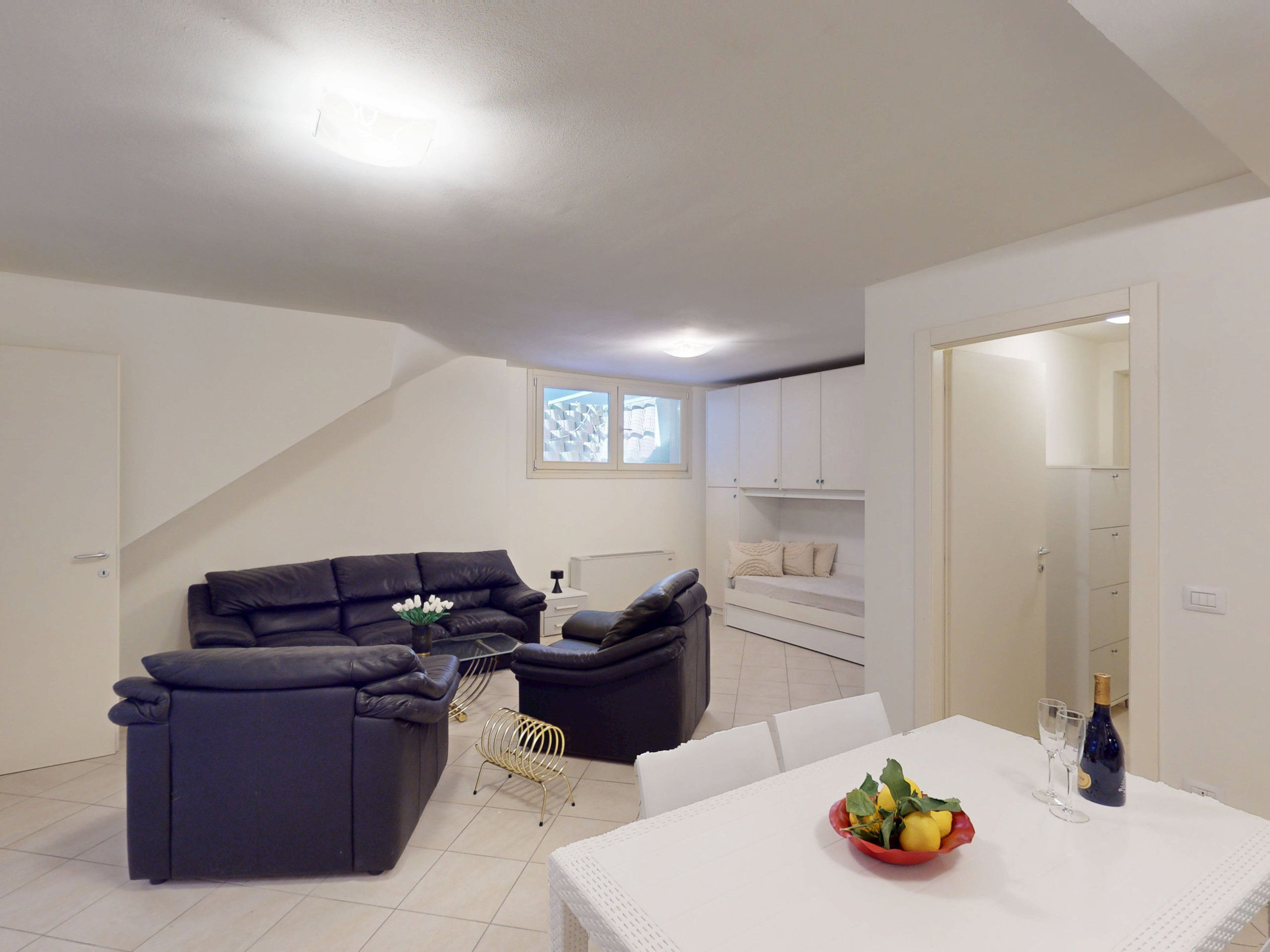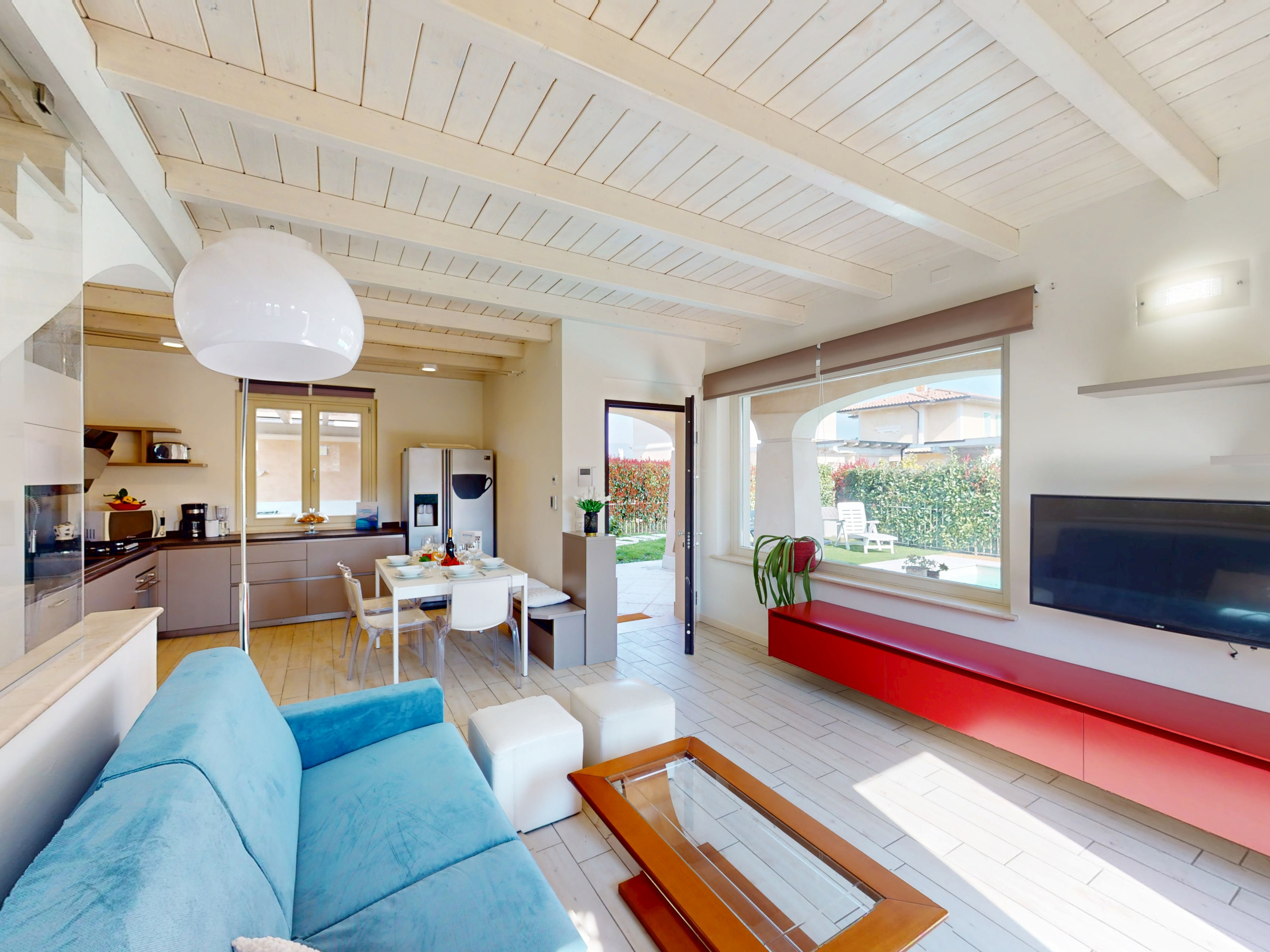 Der geräumige und helle Wohnbereich im typisch italienischen Stil lädt zum Entspannen ein. Die große Glasfront bietet einen durchgehenden Blick auf den Garten und den See.