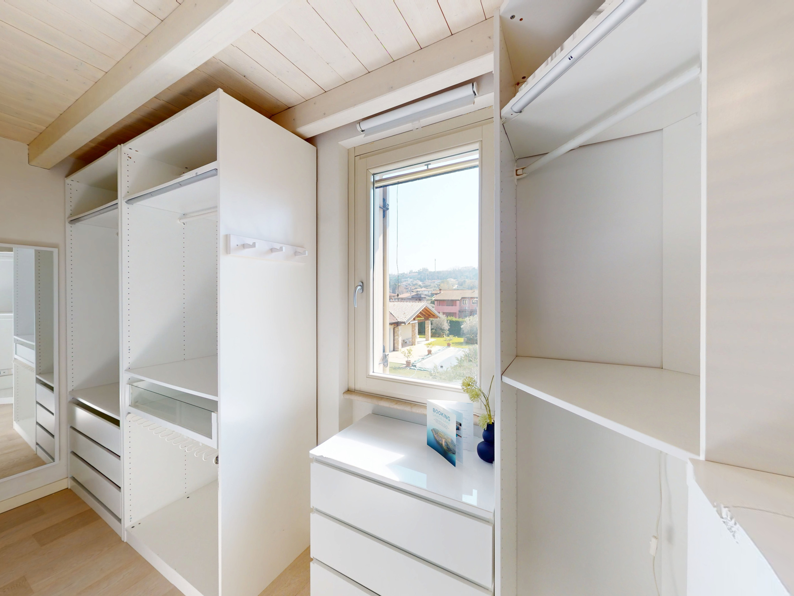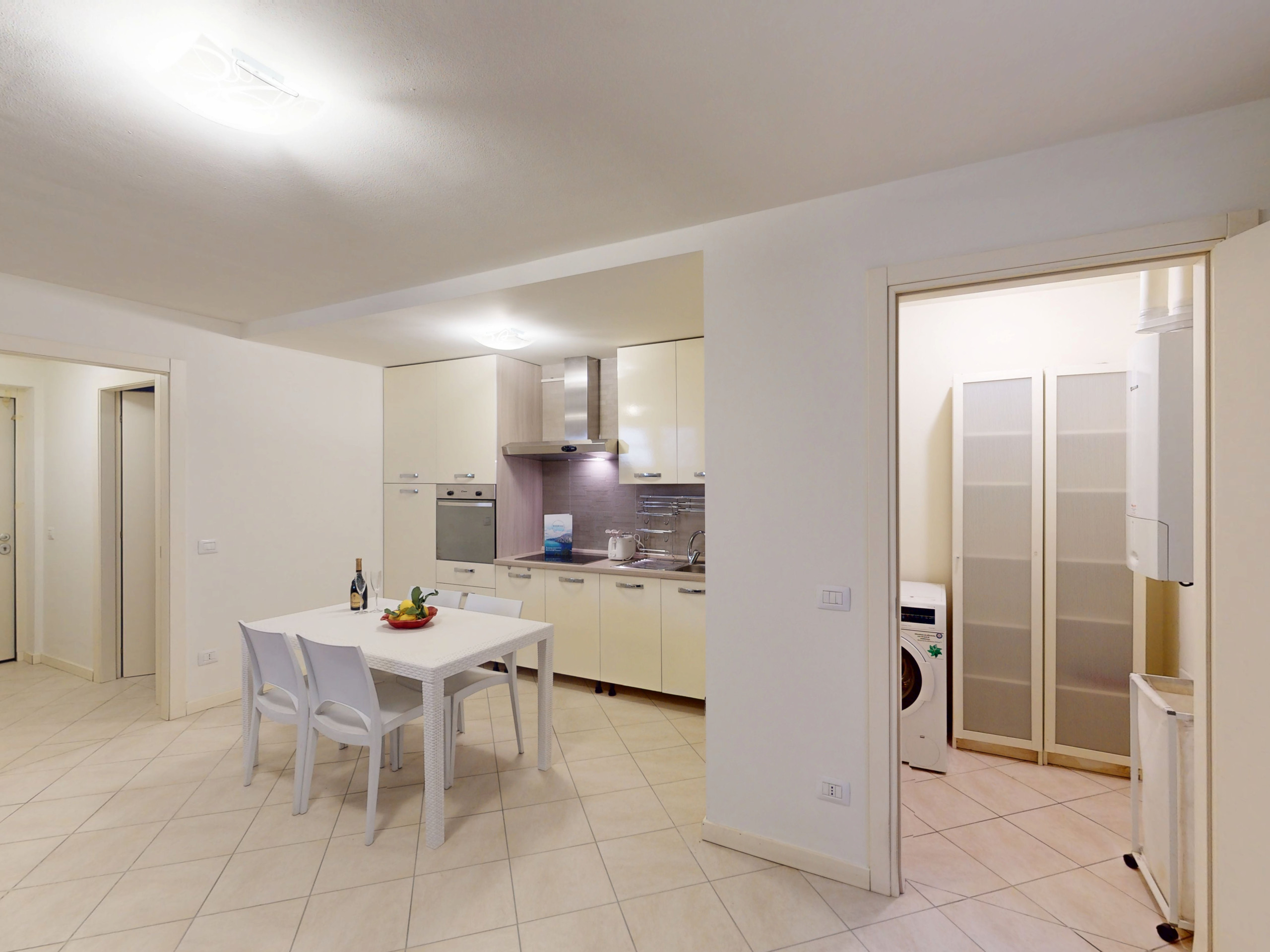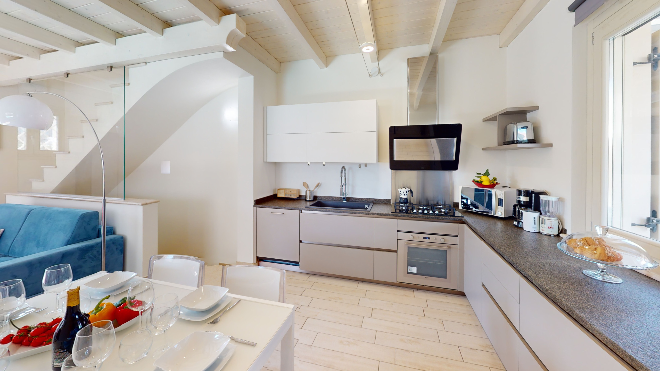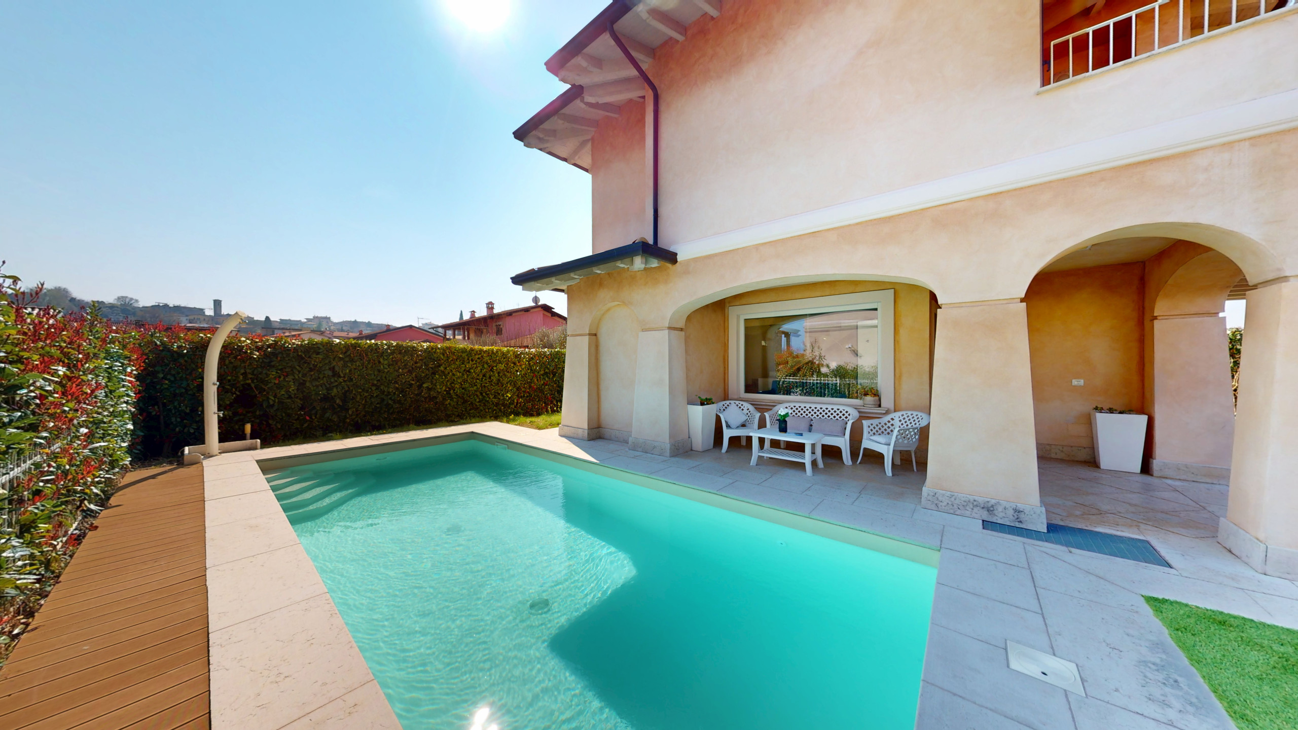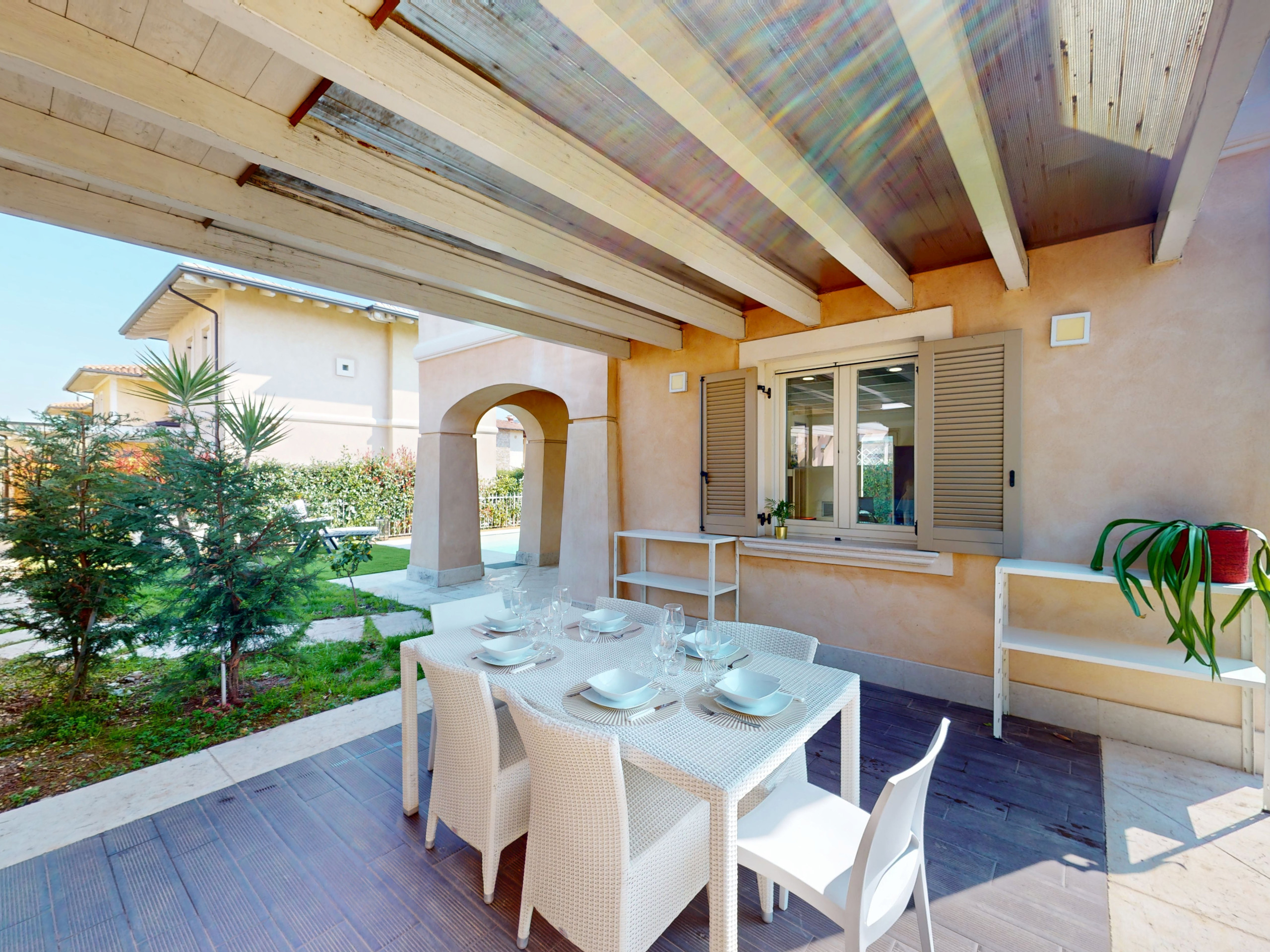 Das Herzstück des Hauses ist die große Außenterrasse: möbliert, geräumig und mit direktem Zugang zum Strand. Ein magischer Ort, um morgens das Frühstück zu genießen, bei Sonnenuntergang zu entspannen oder unter den Sternen zu dinieren, eingetaucht in die natürliche Schönheit der prestigeträchtigsten Zone des Gardasees.