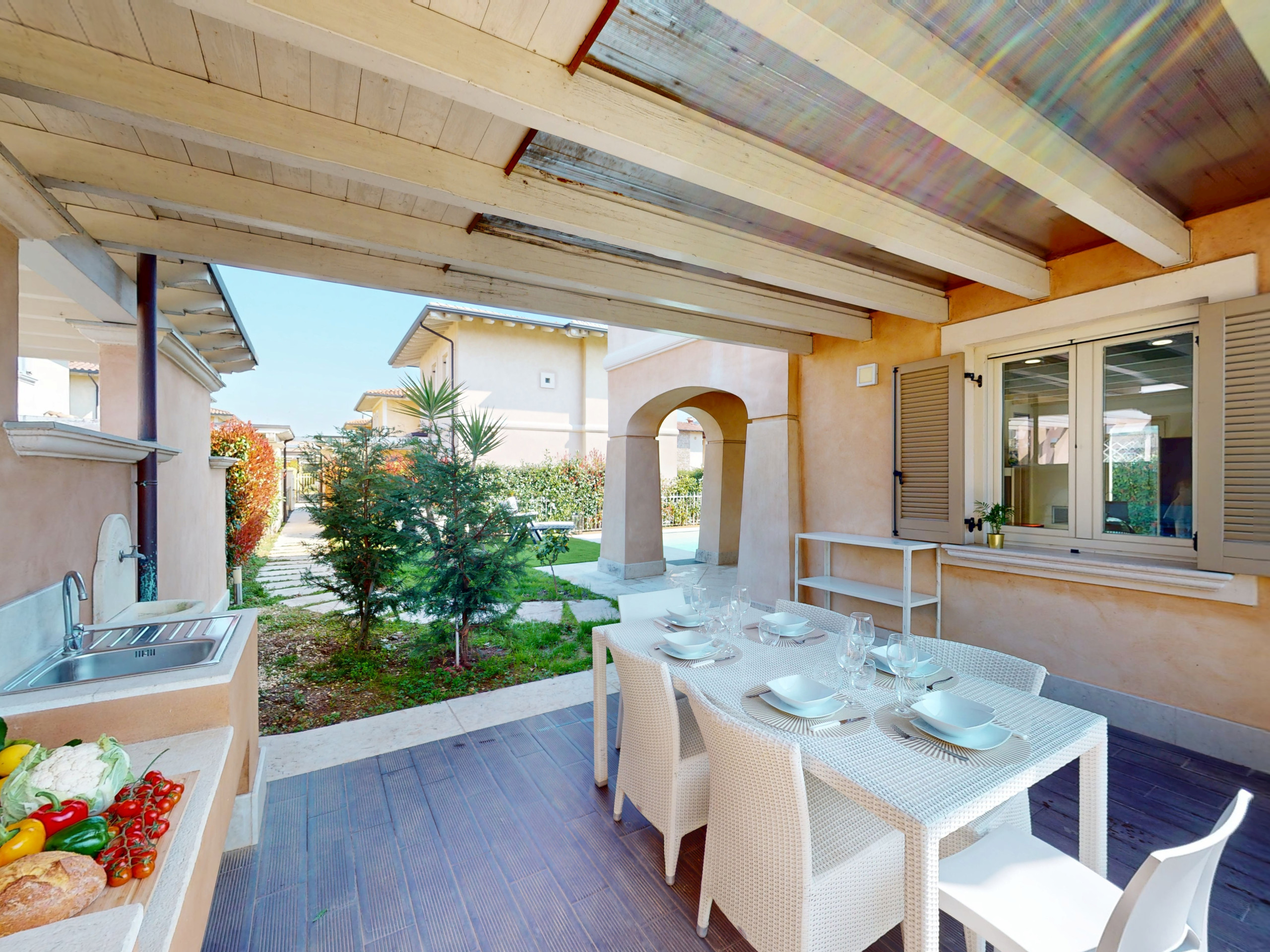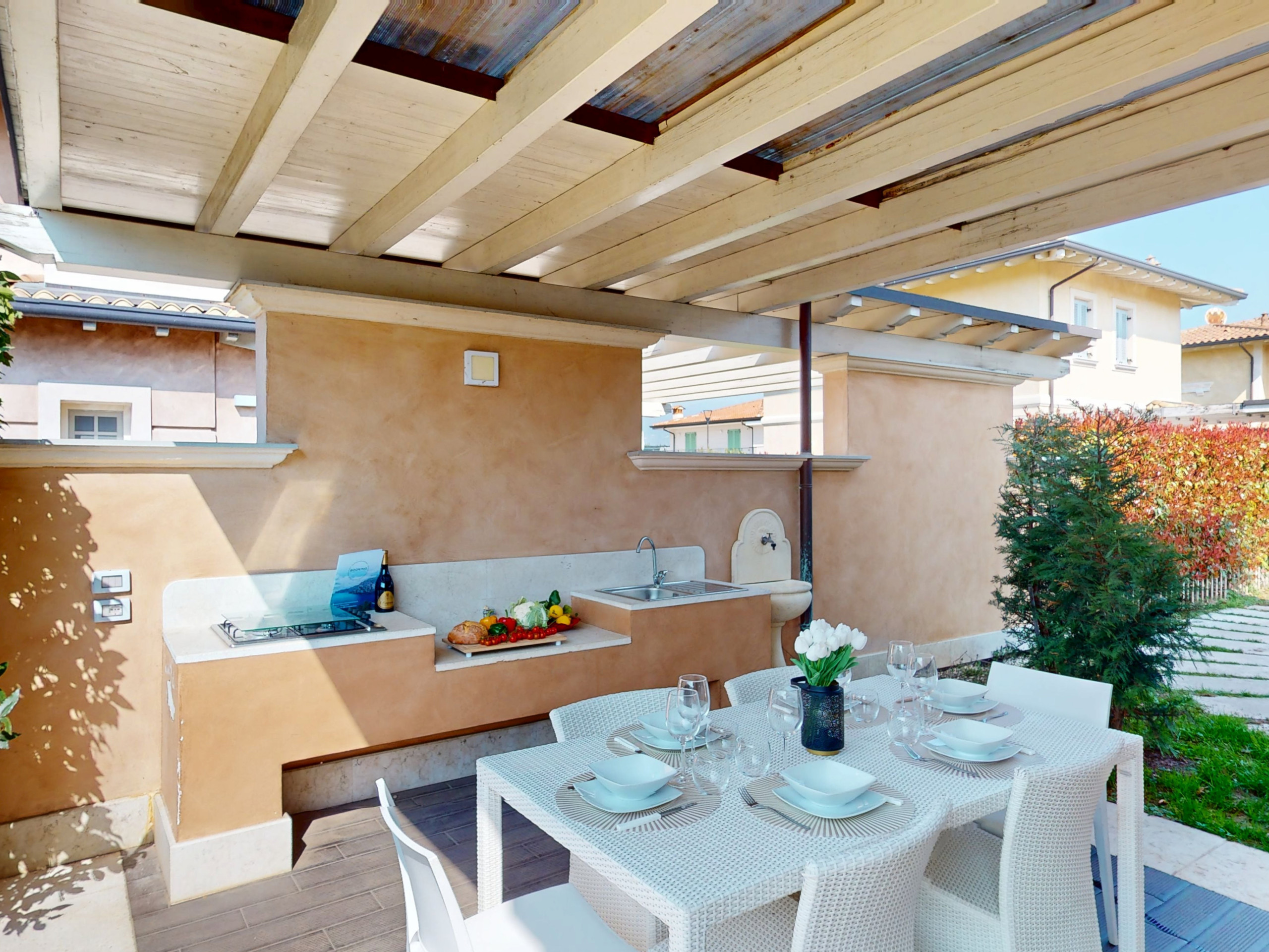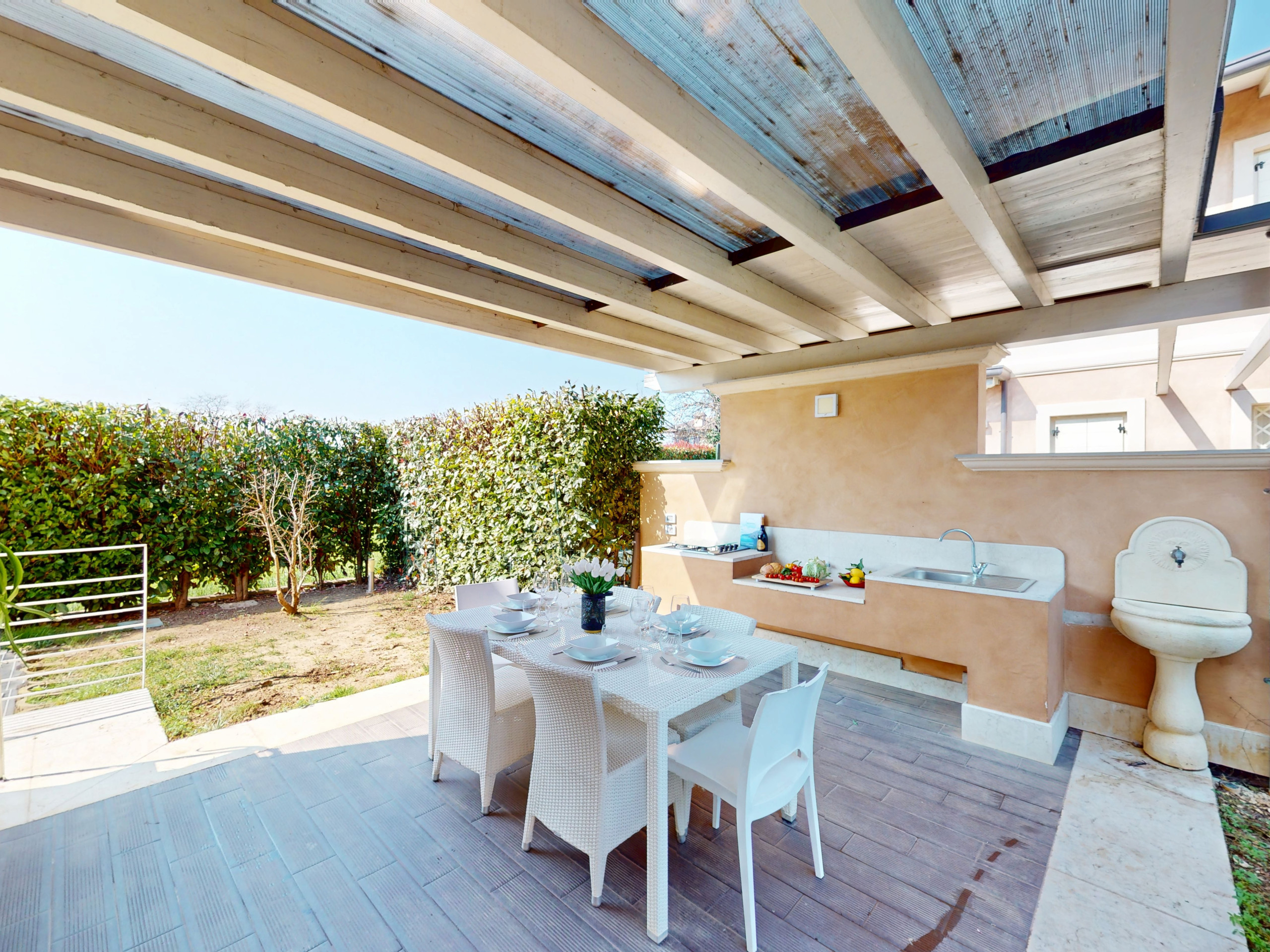 Der private Garten umgibt die Villa und eine große Veranda mit Küche ist ideal für Mittagessen, Sommerabendessen in Gesellschaft und in völliger Privatsphäre, eingebettet in Grün und mit Blick auf den Pool.