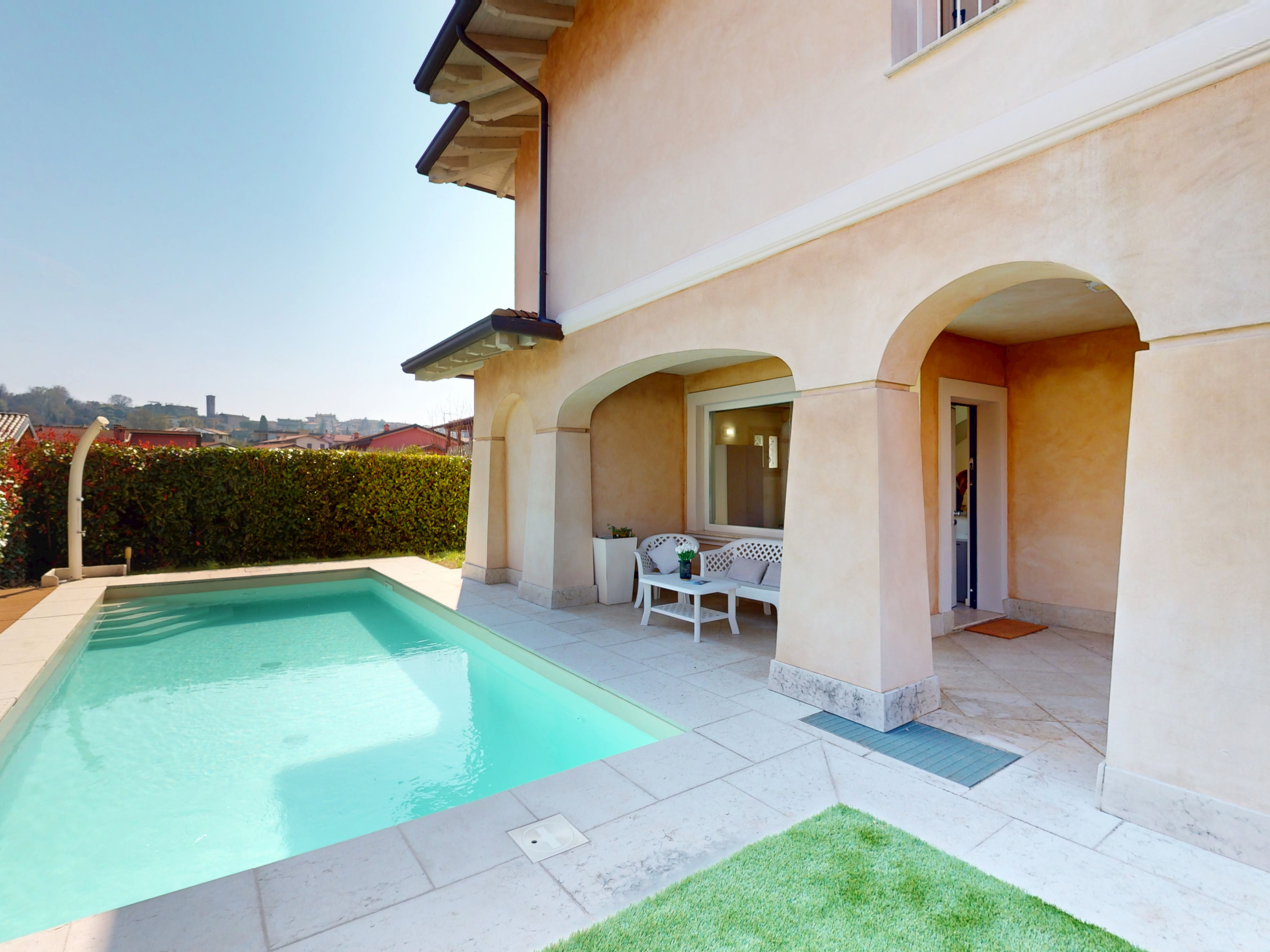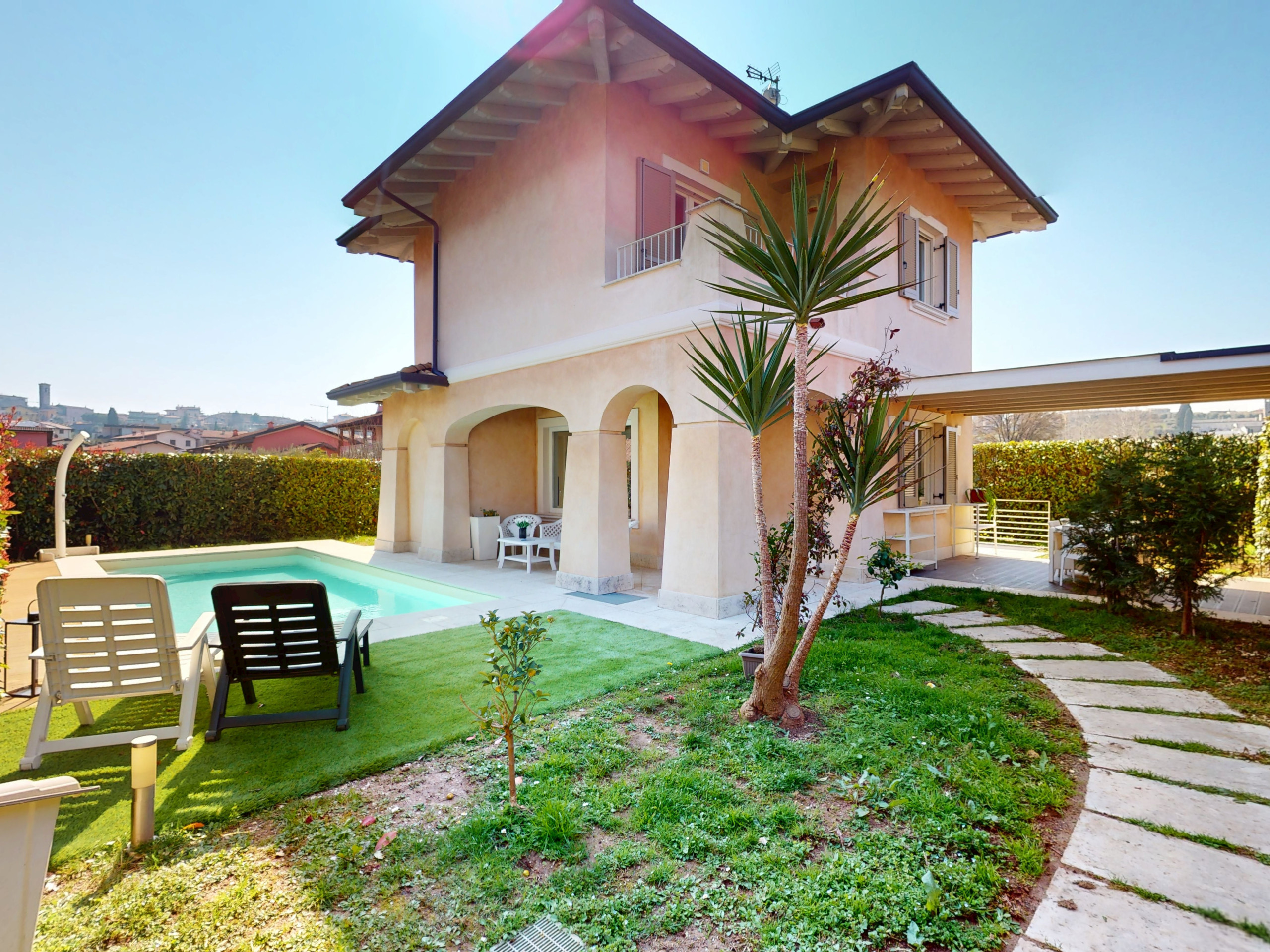 Bezaubernde, unabhängige Villa mit Privatpool, in der Nähe des Zentrums von Manerba del Garda, 500 Meter vom See entfernt. Der See ist zu Fuß erreichbar. Die geräumige und helle Villa erstreckt sich über drei Etagen mit drei Schlafzimmern und drei Badezimmern. Im Erdgeschoss befindet sich ein Wohnzimmer mit großem Fenster, das auf den Pool blickt, ein Schlafsofa und ein Gäste-WC. Der Schlafbereich befindet sich im ersten Stock und besteht aus einem Doppelschlafzimmer mit Terrassentür und Balkon, einem Doppelzimmer, einem Einzelzimmer und einem vollständigen Badezimmer mit großer Dusche. Im Untergeschoss befindet sich ein Wohnraum mit Doppelbett, ein Badezimmer mit Dusche und eine Waschmaschine. Das Objekt ist mit Bildschirmen ausgestattet. Das Grundstück ist von einem großen privaten Außenbereich umgeben, der mit Tisch, Liegen, Außenküche und Sofas am Rande des Pools ausgestattet ist. Doppelgarage. Klimaanlage gegen Aufpreis von 0,50 €/kWh. Wenn nicht direkt in der Buchung enthalten, werden bei der Ankunft die Kurtaxe (pro Gast) und eine Kaution von 300 € erhoben.