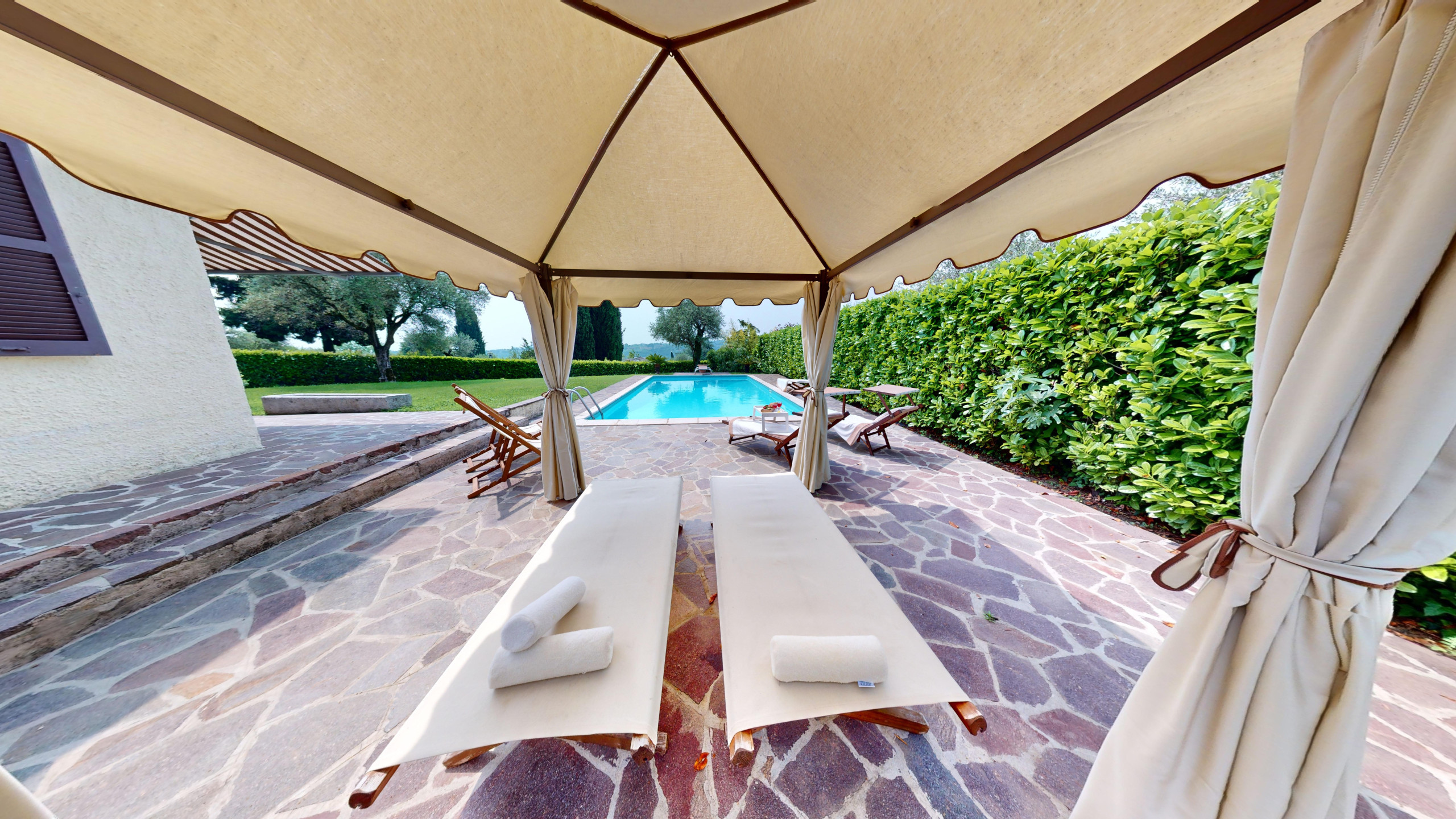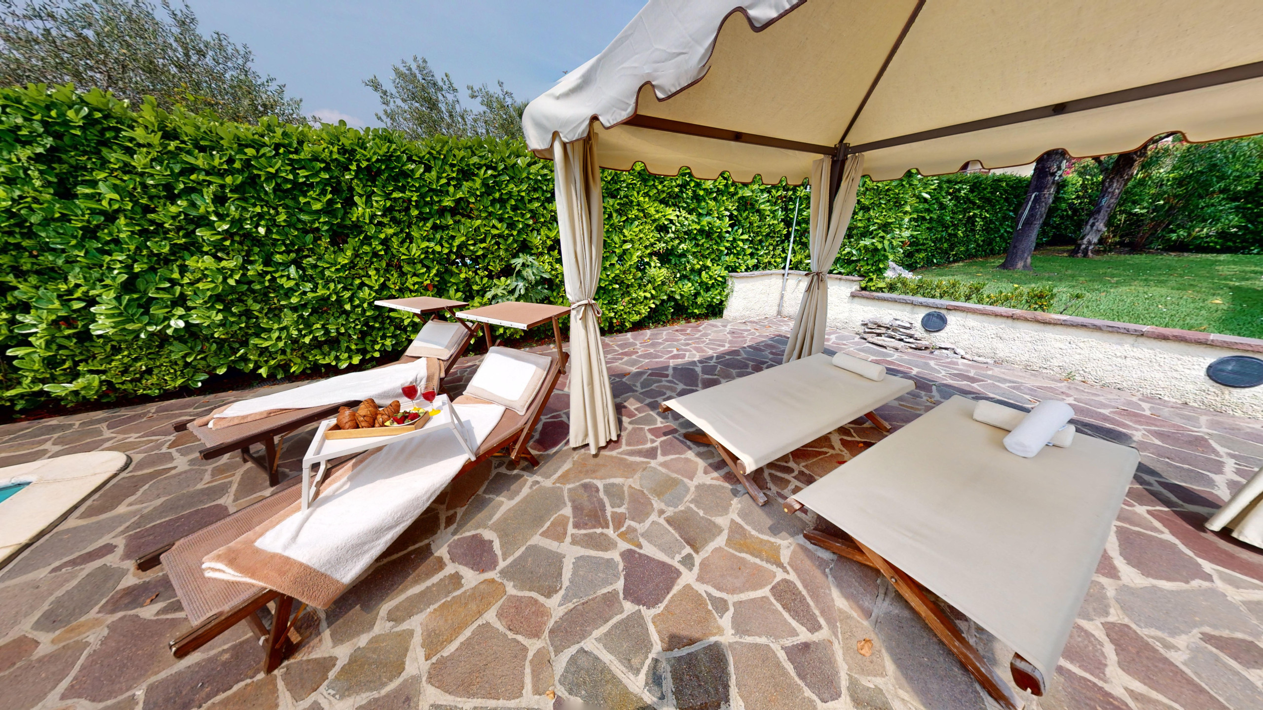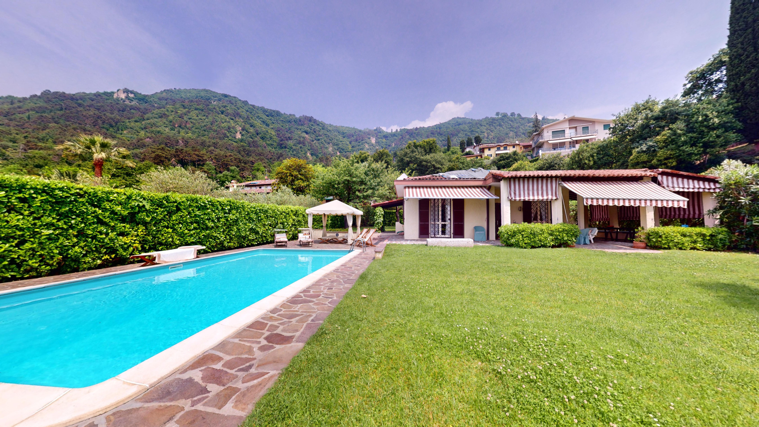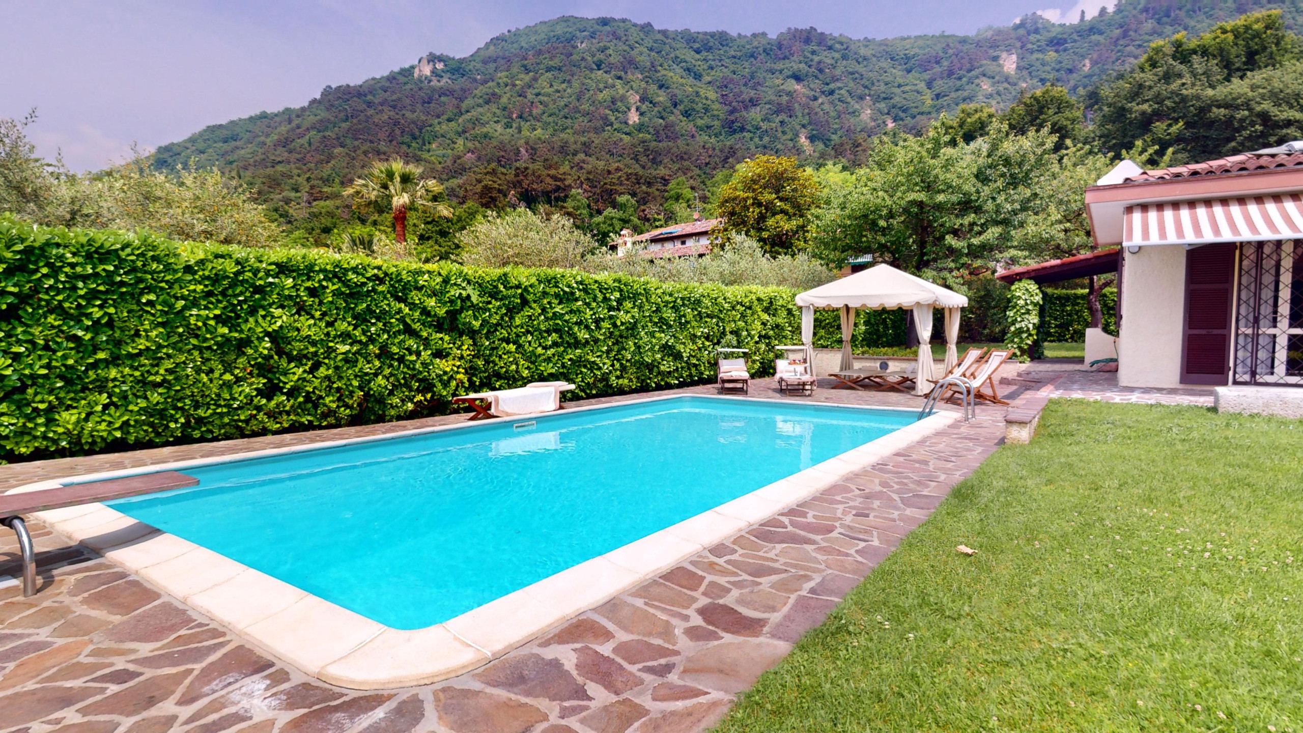 Die großzügigen Außenbereiche bieten ein einzigartiges Erlebnis: Die Terrasse mit ihrem charmanten Outdoor-Wohnbereich und den beiden Tischen mit Grill laden ein, das Leben in Gesellschaft von Freunden und Familie zu feiern. Inmitten des grünen Gartens befindet sich der private Swimmingpool mit Seeblick.