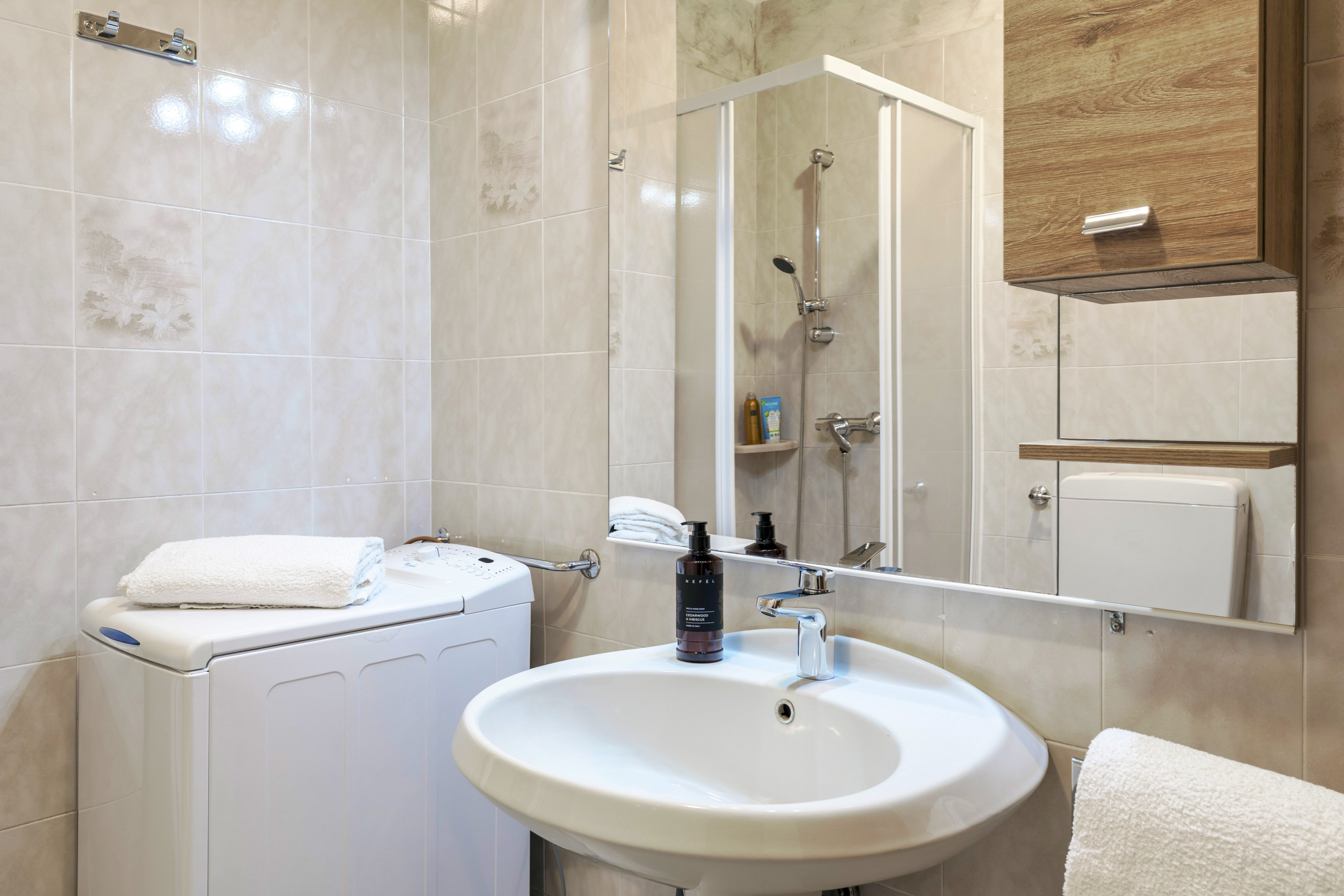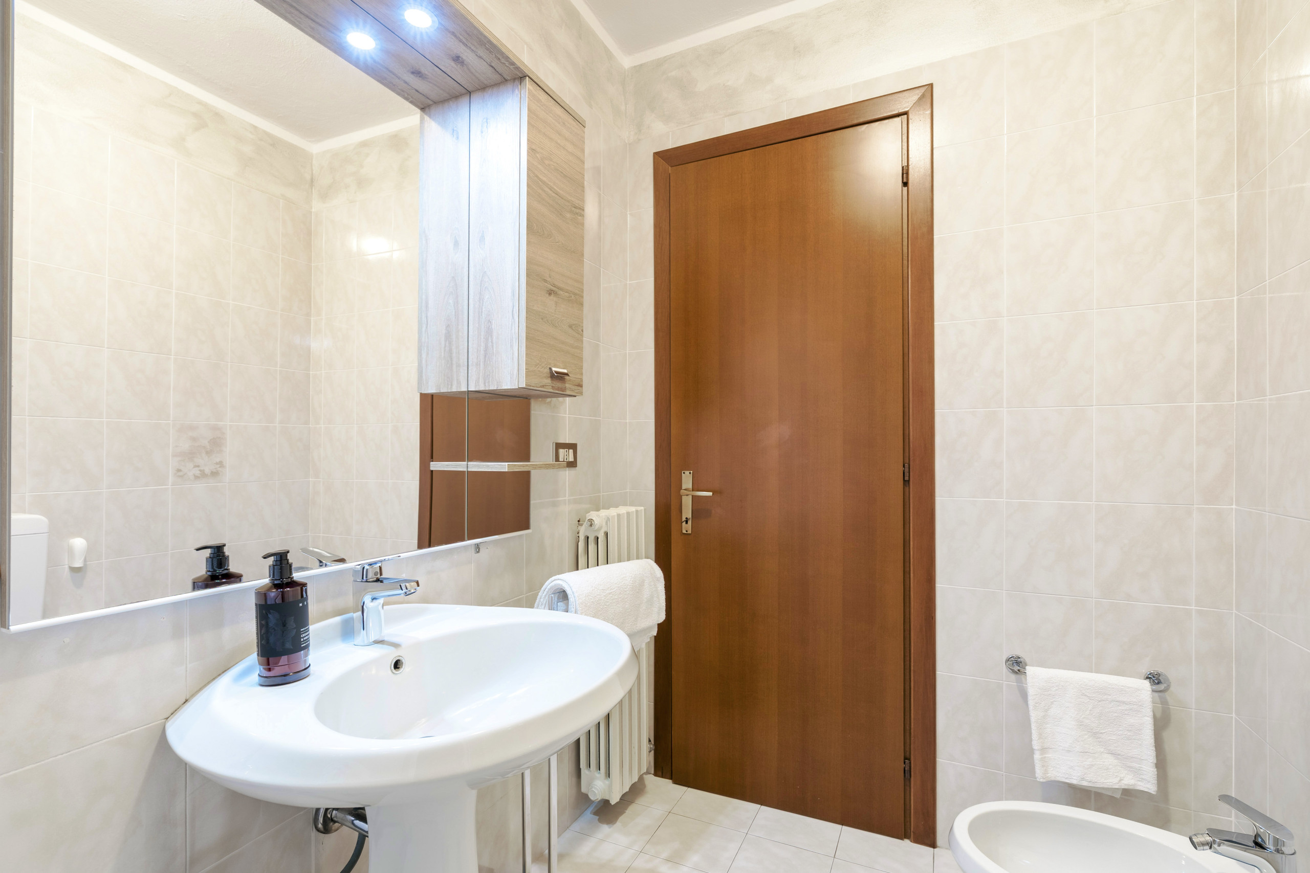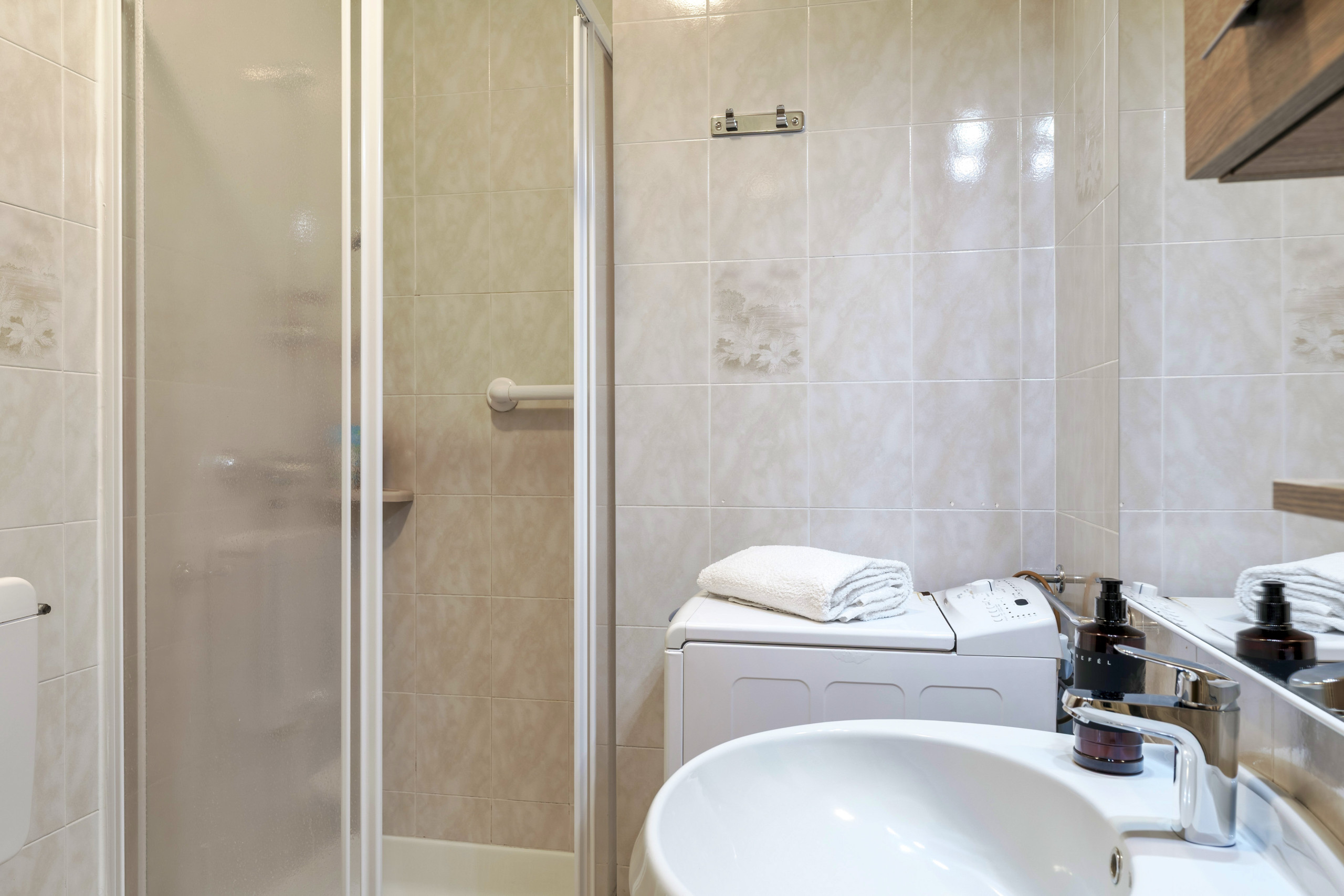 The Costa del Sole 2 three-room apartment is a bright apartment of approximately 65 sqm located in Pacengo di Lazise, within walking distance of Movieland and Caneva World and about 4 km from the historic centre of Lazise. It is situated in the Costa del Sole residential complex, with a communal swimming pool (guaranteed opening 15/05-30/09). The apartment is suitable for people with reduced mobility as it is completely on the ground floor and all rooms have manoeuvring spaces suitable for a wheelchair. The bathroom is fully accessible and designed to ensure comfort and safety. It is equipped with a wide sliding door to facilitate wheelchair access, floor-level shower with support handles. The washbasin is installed at an accessible height with free space underneath to allow wheelchair approach. The WC is equipped with a handrail on one side and a foldable grab bar on the other for easy and safe use. Non-slip surfaces and adequate lighting complete a functional and inclusive environment.