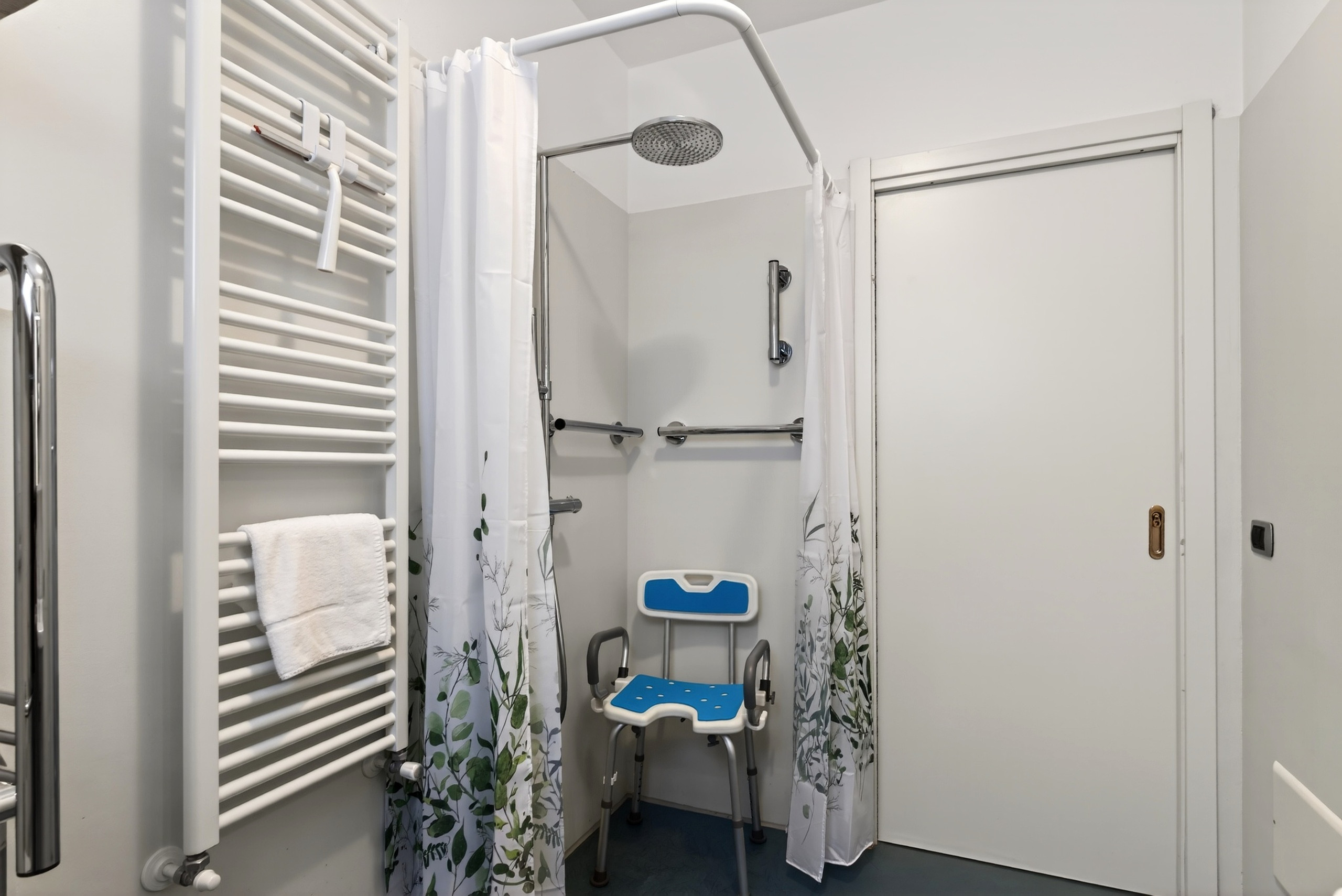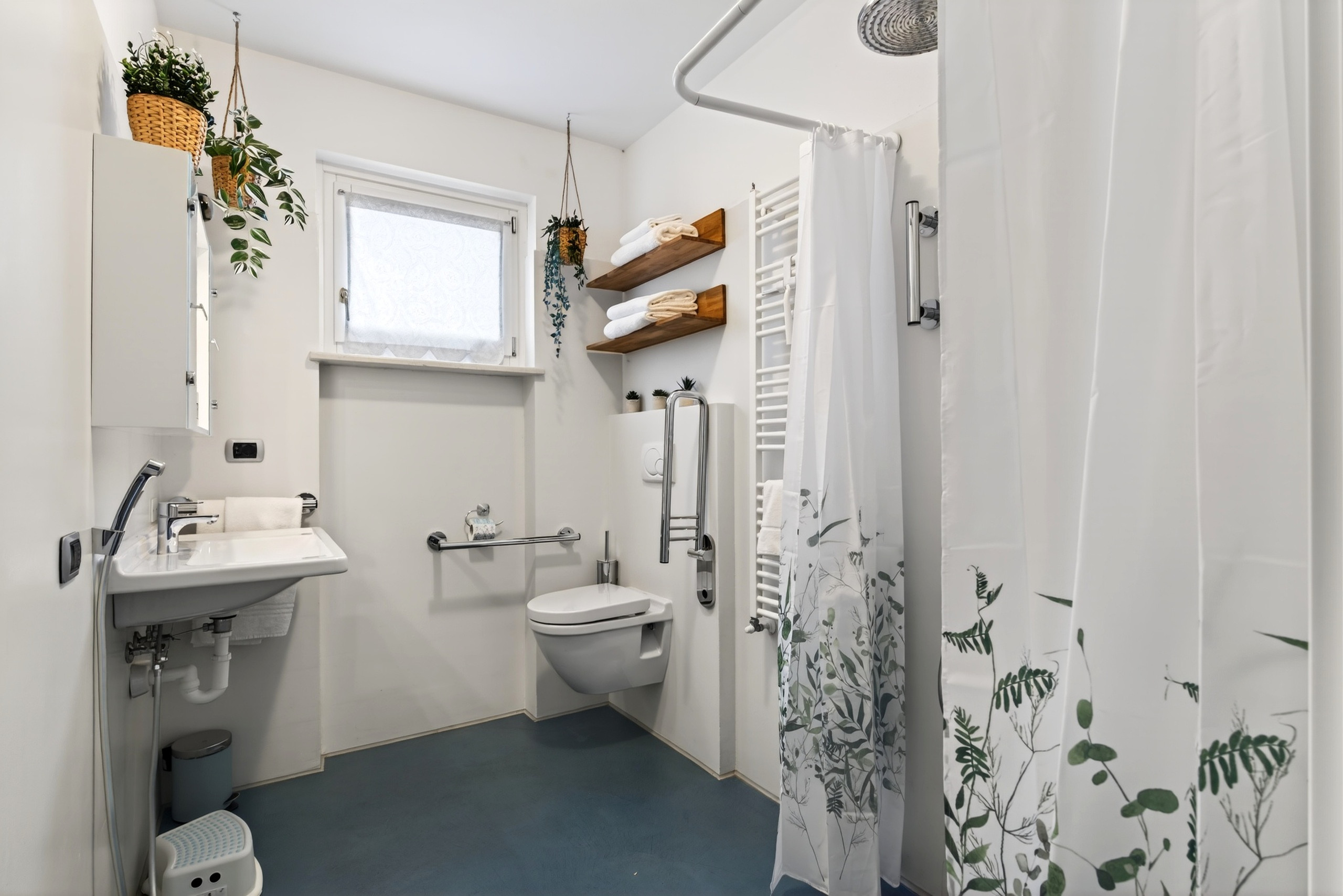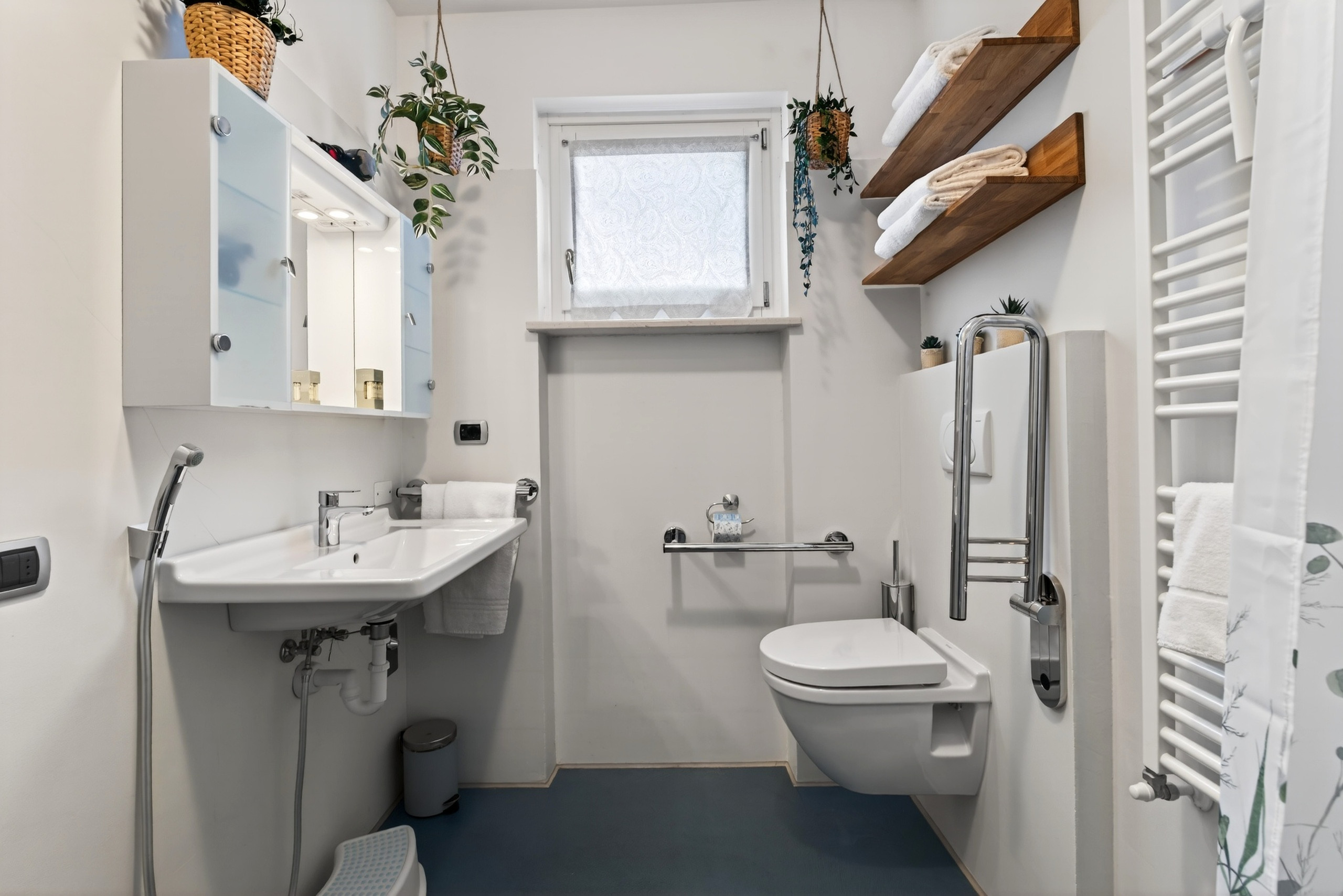 The master bedroom has ample manoeuvring space at the foot of the bed, a safe and a large wardrobe. The second bedroom consists of a bunk bed (beds measure 80x190 cm) and a pull-out bed as well as a wardrobe and a bookshelf. Both rooms overlook the porch with sun shade and the large rear garden. The living area consists of a double sofa bed and a large equipped kitchen with gas hob, refrigerator, freezer, oven, toaster, American coffee machine and dishwasher. Air conditioning, smart tv and wifi are available to guests. The living area overlooks a second covered porch with sun shade, barbecue/fireplace and a second table with chairs. In the accessible basement, accessible through a ramp, there is a parking space in the garage and a cellar with washing machine and bicycle parking with the possibility of charging e-bikes. On the ground floor, near the apartment entrance, there is a second private uncovered parking space. Pets are not allowed. Smoking is prohibited in the house.