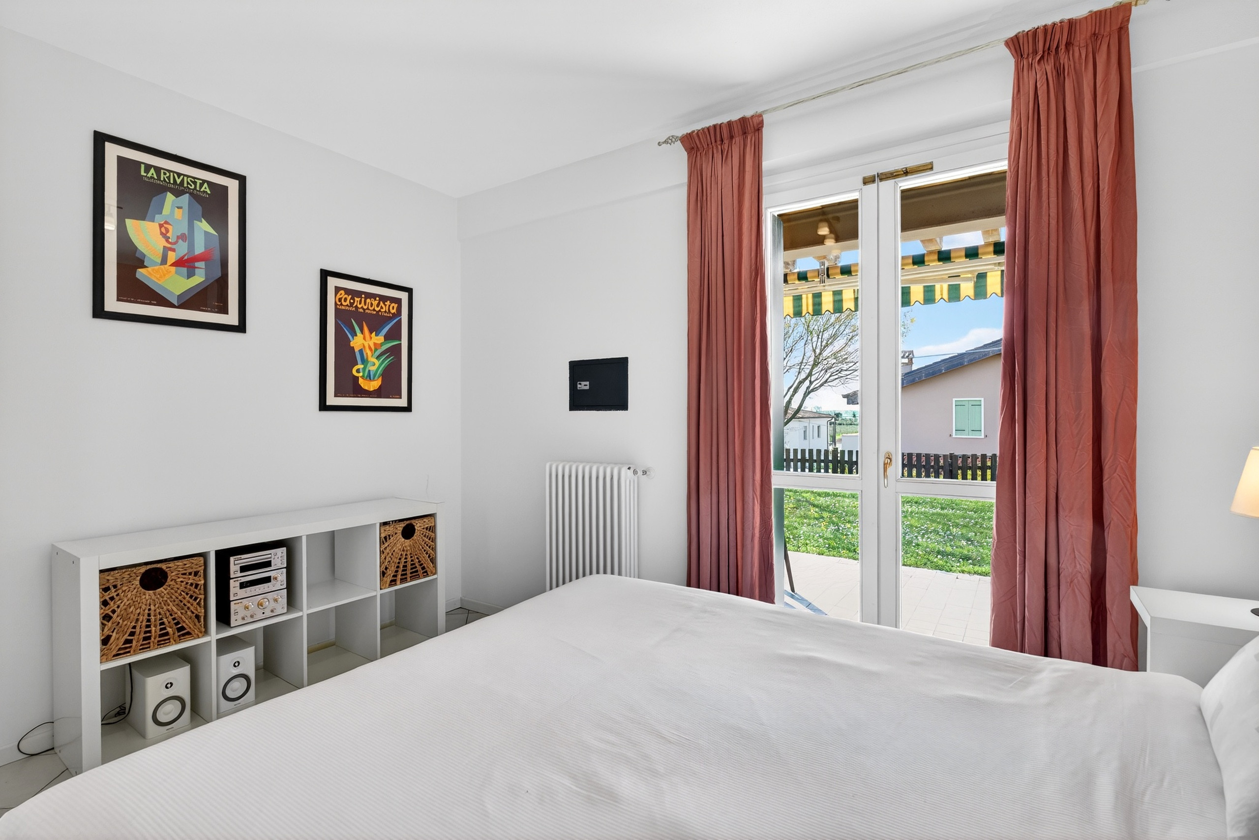 Spacious three-room apartment of approximately 65 square metres, located in Lazise, about 1500 metres from the historic centre and beach, in the Miralago residential complex, with swimming pool and large sunbathing area (open from 15/05 to 30/09). Public parking is available for guests. The ground floor apartment can accommodate 4 to 6 people and consists of a living room with a fully equipped kitchen including refrigerator, gas hob, oven, American coffee machine and toaster, and a double sofa bed. The living room overlooks a beautiful enclosed garden suitable for safely hosting your four-legged friend. Large private terrace equipped with sun shade, table and chairs for pleasant outdoor meals. Windowed bathroom with washing machine and shower box, master bedroom with large wardrobe and a room with bunk bed. Air conditioning, satellite TV and WiFi available for guests. Pets are allowed upon request. Smoking is not permitted inside the accommodation. We have a second apartment on the first floor with lake view.