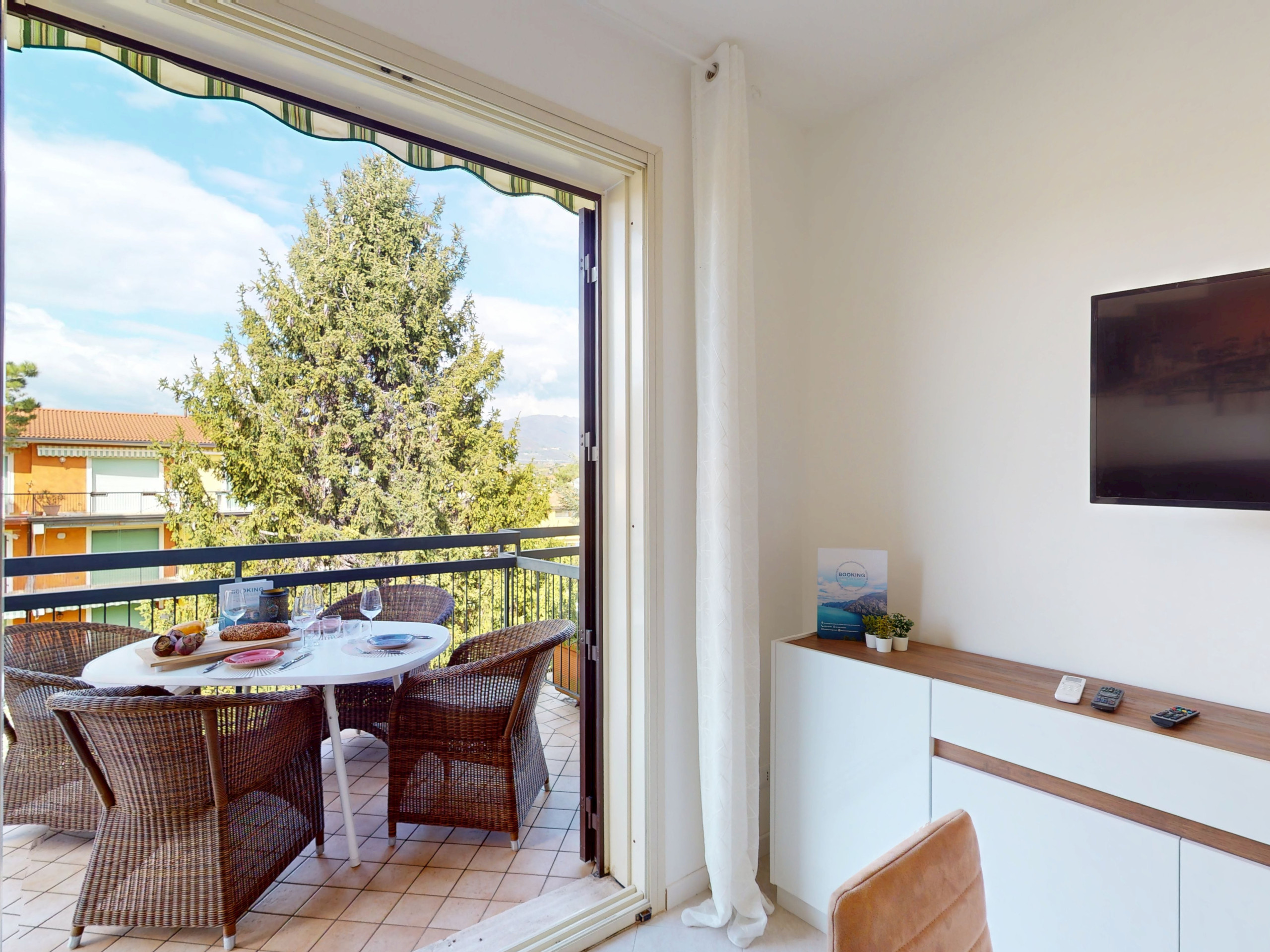 The apartment is perfect for families or couples who want to enjoy an unforgettable experience on Lake Garda, offering a bright and comfortable atmosphere: the private equipped porch is ideal for outdoor lunches, moments of relaxation or simple conversations with company, while the large condominium park, enriched by centuries-old olive trees, provides a unique atmosphere of tranquillity.