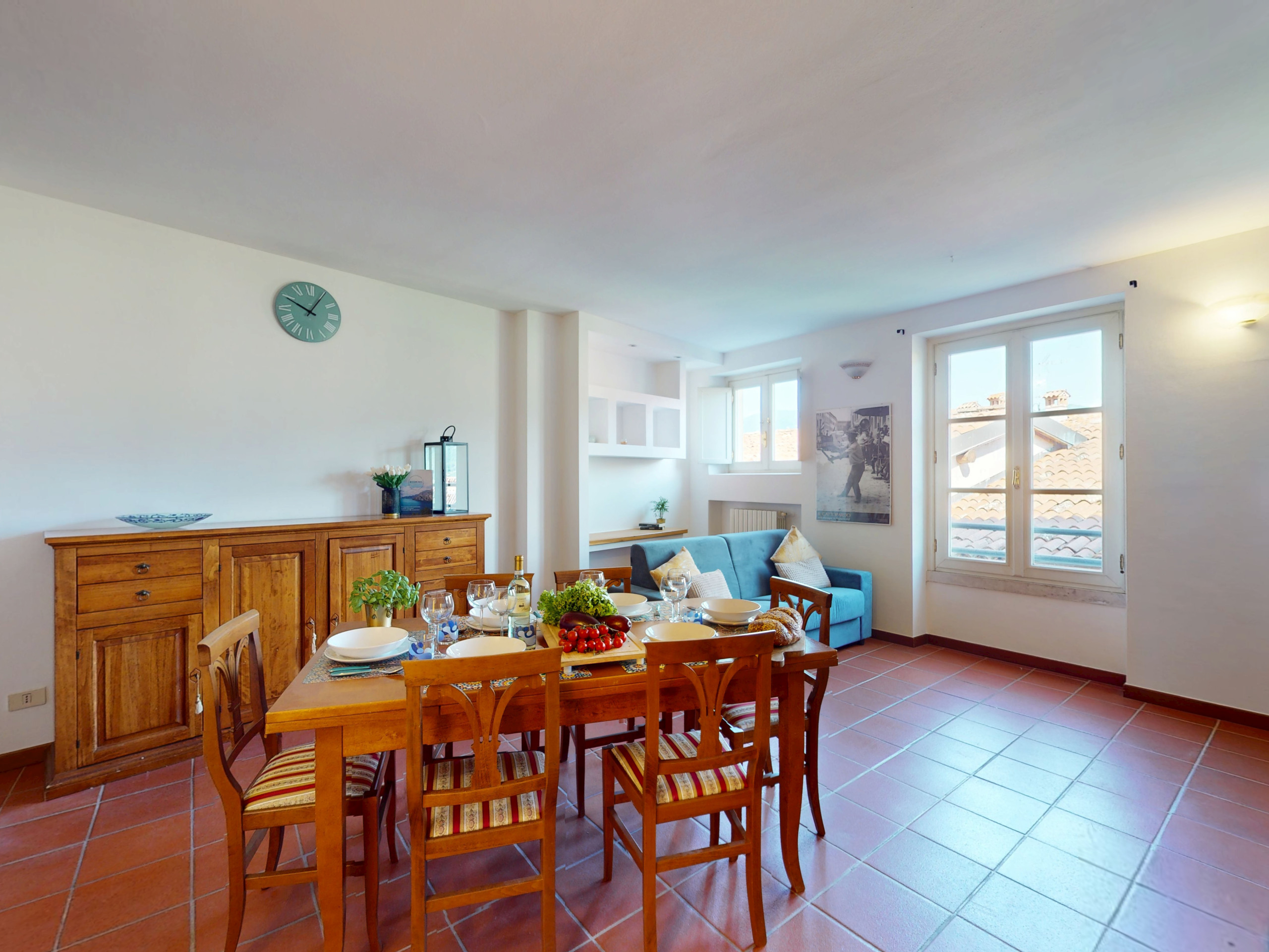 The living room, furnished with taste and attention to detail, features a comfortable sofa bed and Wi-Fi connection.