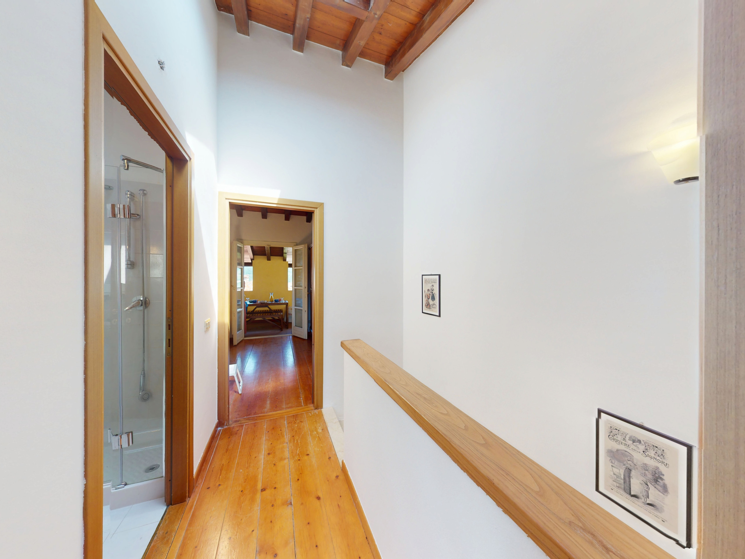 Going up to the upper floor, the space opens onto two bedrooms with suggestive exposed beams: the master bedroom, spacious and relaxing, opens onto a private terrace furnished with a table and chairs, offering a splendid view of the lake, perfect for an outdoor breakfast or a sunset aperitif.