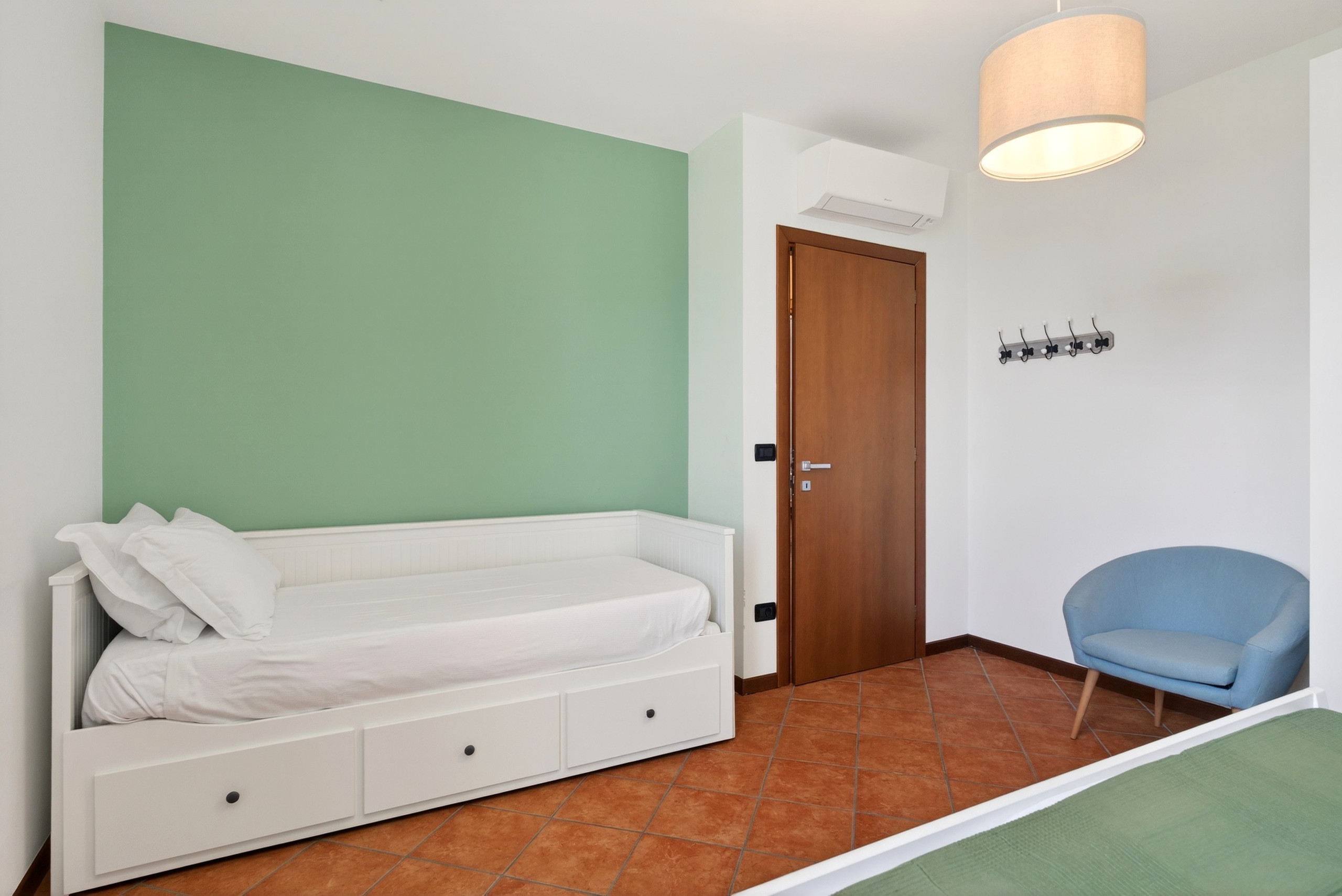The Giarole apartment, entirely located on the ground floor, has a large room with two single beds that can be joined with a wardrobe, a double bedroom with an additional single bed convertible to a double, a small bathroom with a shower, a main windowed bathroom with a laundry corner with a washing machine, shower box, double sink. The spacious kitchen overlooks the side terrace equipped with a table and chairs and features a modern kitchen with a dishwasher, induction hob, microwave, large refrigerator with freezer, American-style breakfast counter, coffee corner with German coffee machine and coffee machine with pods. The living area furnished with sofa, armchairs, satellite TV and large dining table, opens onto the covered terrace with lounge area and offers a pleasant view of the garden and pool.