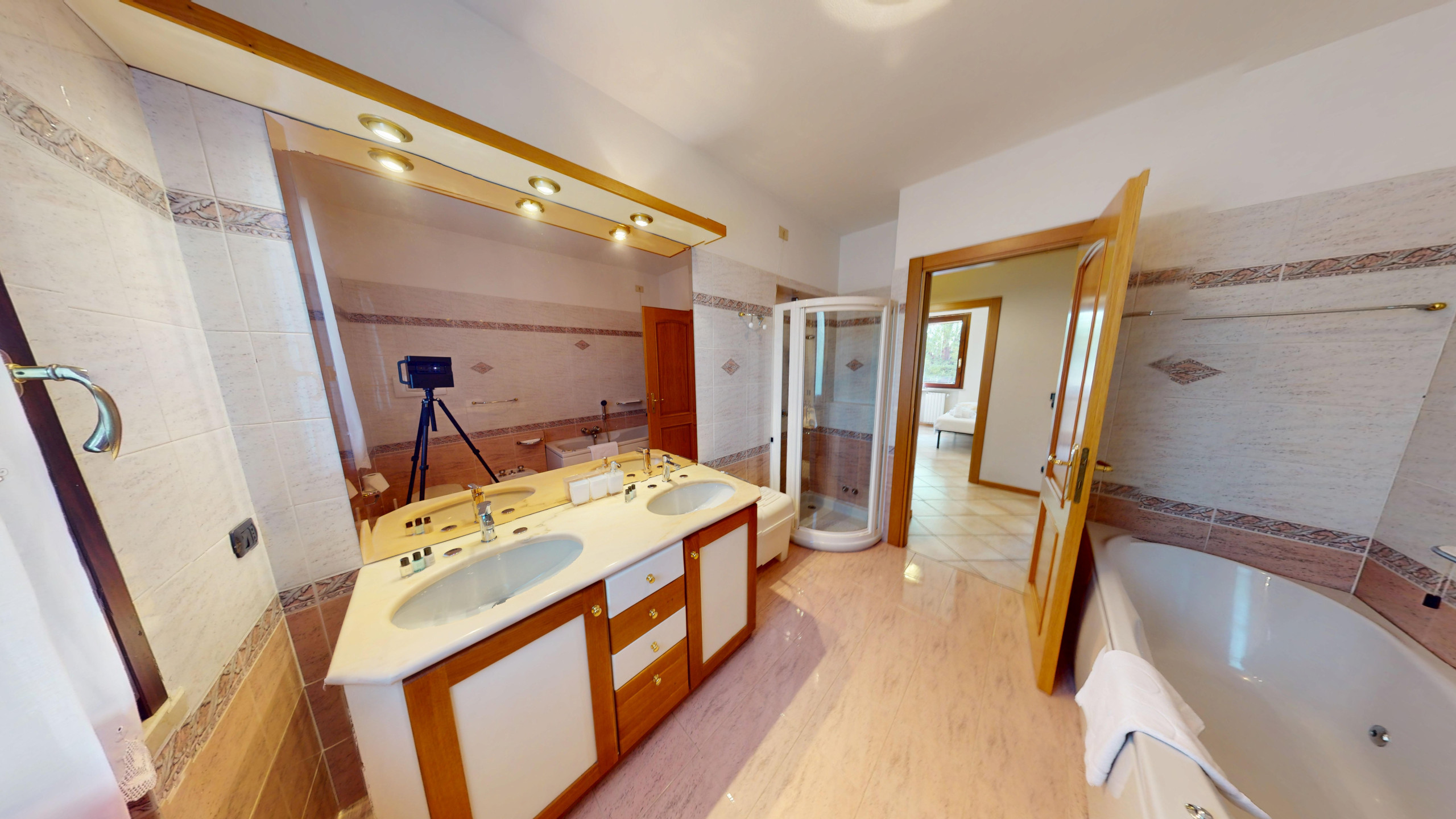On the first floor, the sleeping area surprises you with an elegant and refined master bedroom, equipped with a private balcony that allows you to enjoy the view of the garden. A second bedroom with two single beds, a shower bathroom, and a spacious walk-in closet add comfort and practicality to this level.