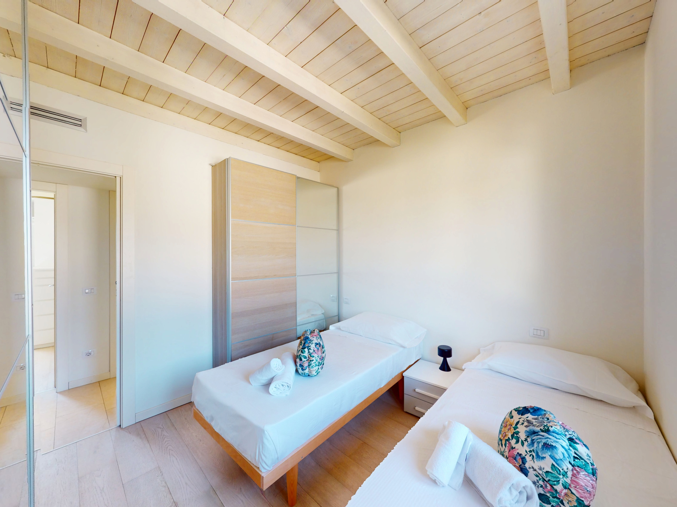 On the first floor, the sleeping area surprises you with an elegant and refined master bedroom, equipped with a private balcony that allows you to enjoy the view of the garden. A second bedroom with two single beds, a shower bathroom, and a spacious walk-in closet add comfort and practicality to this level.