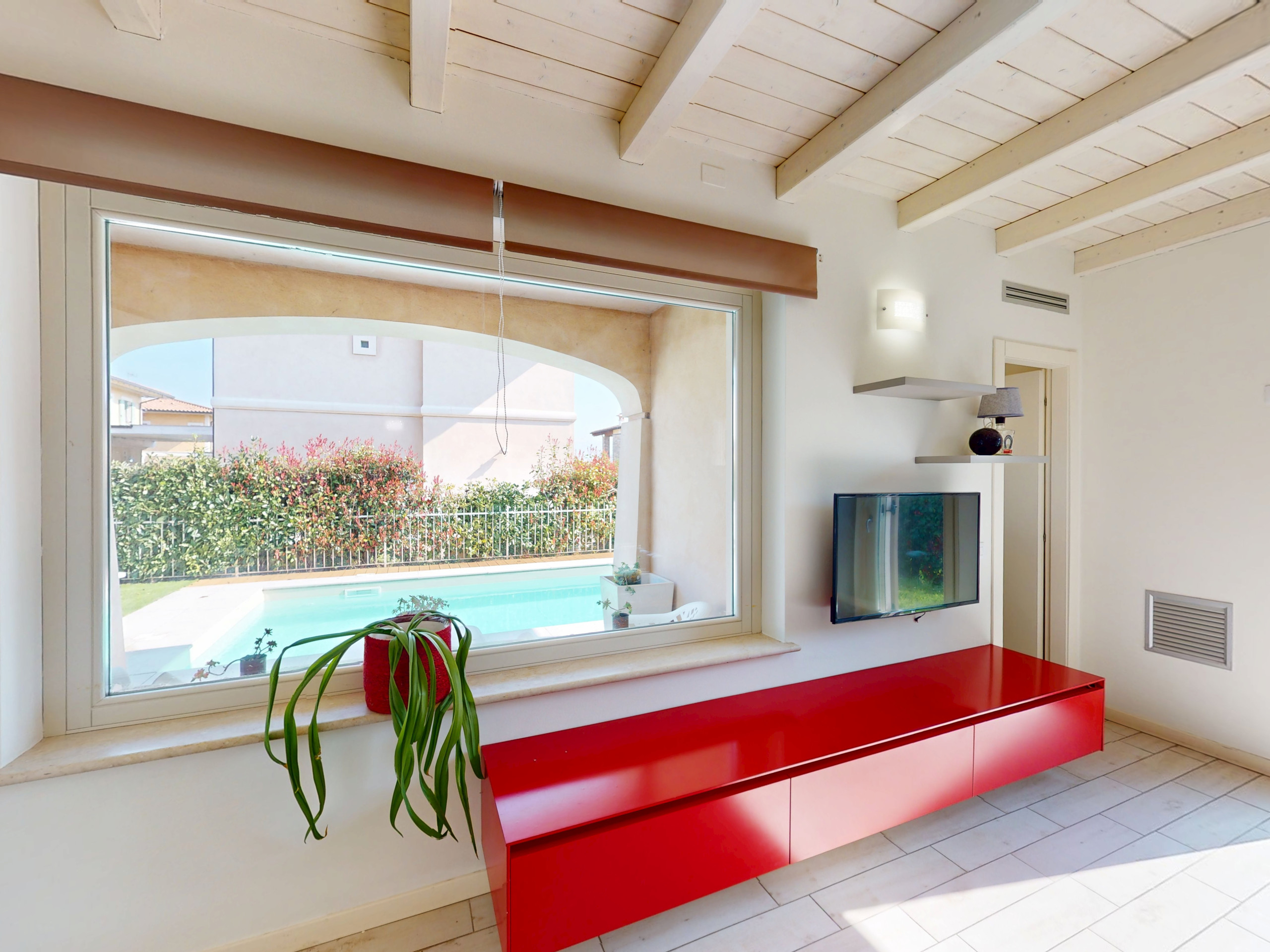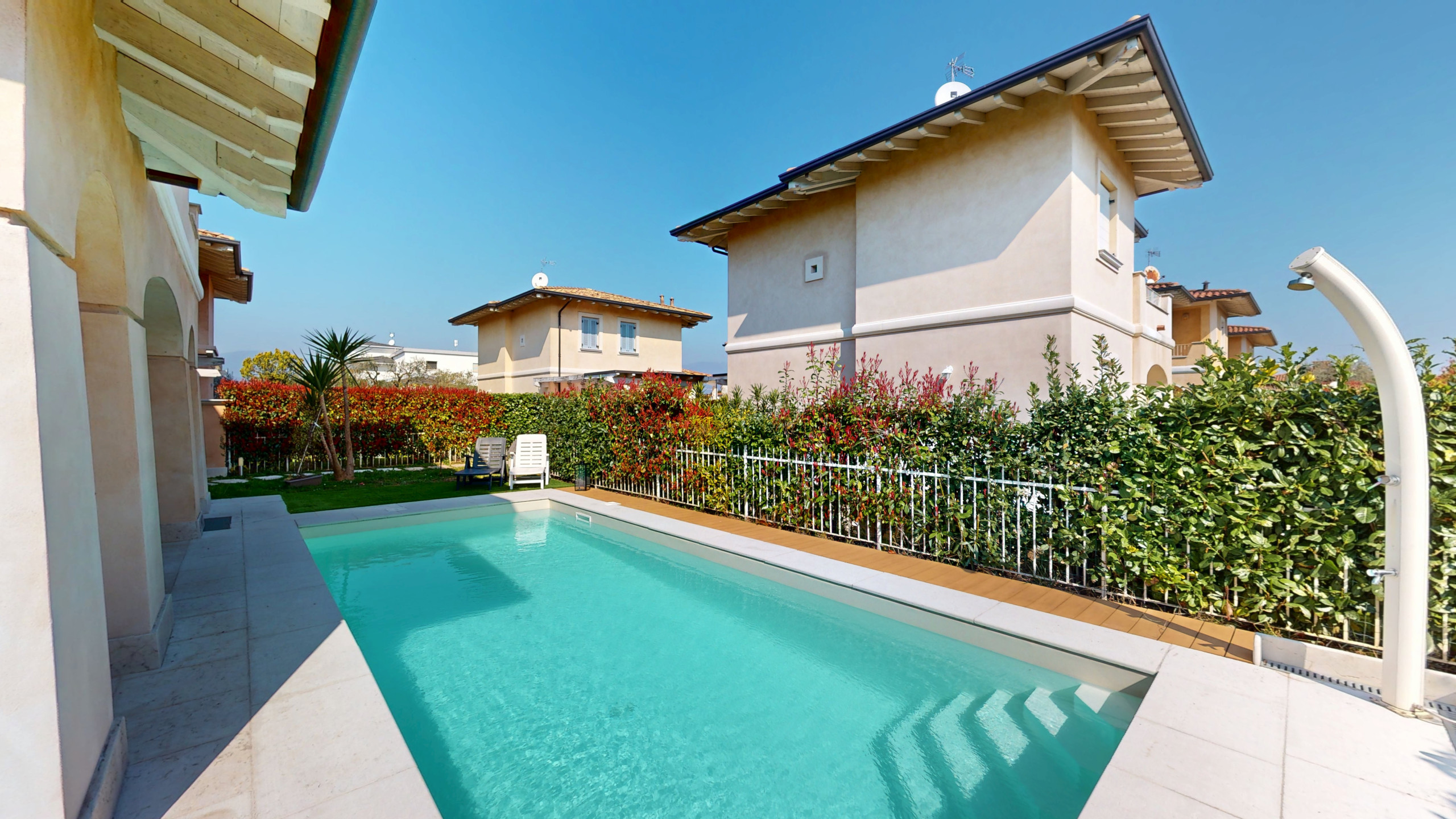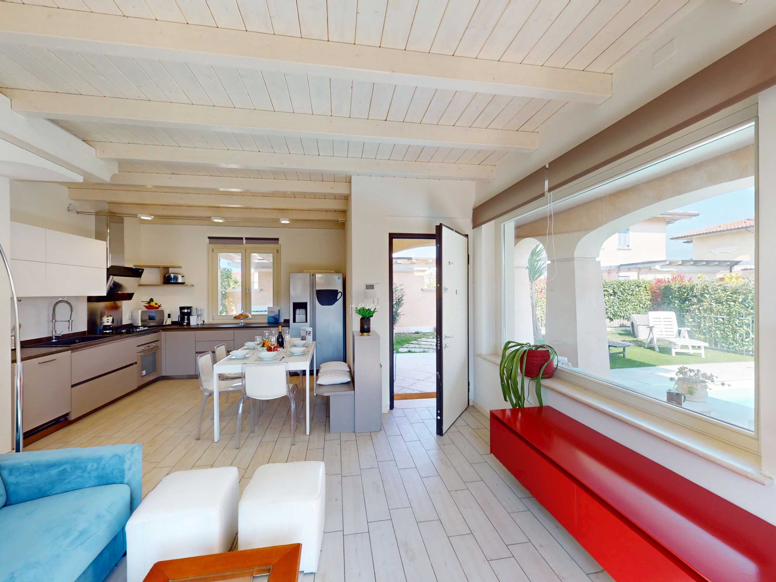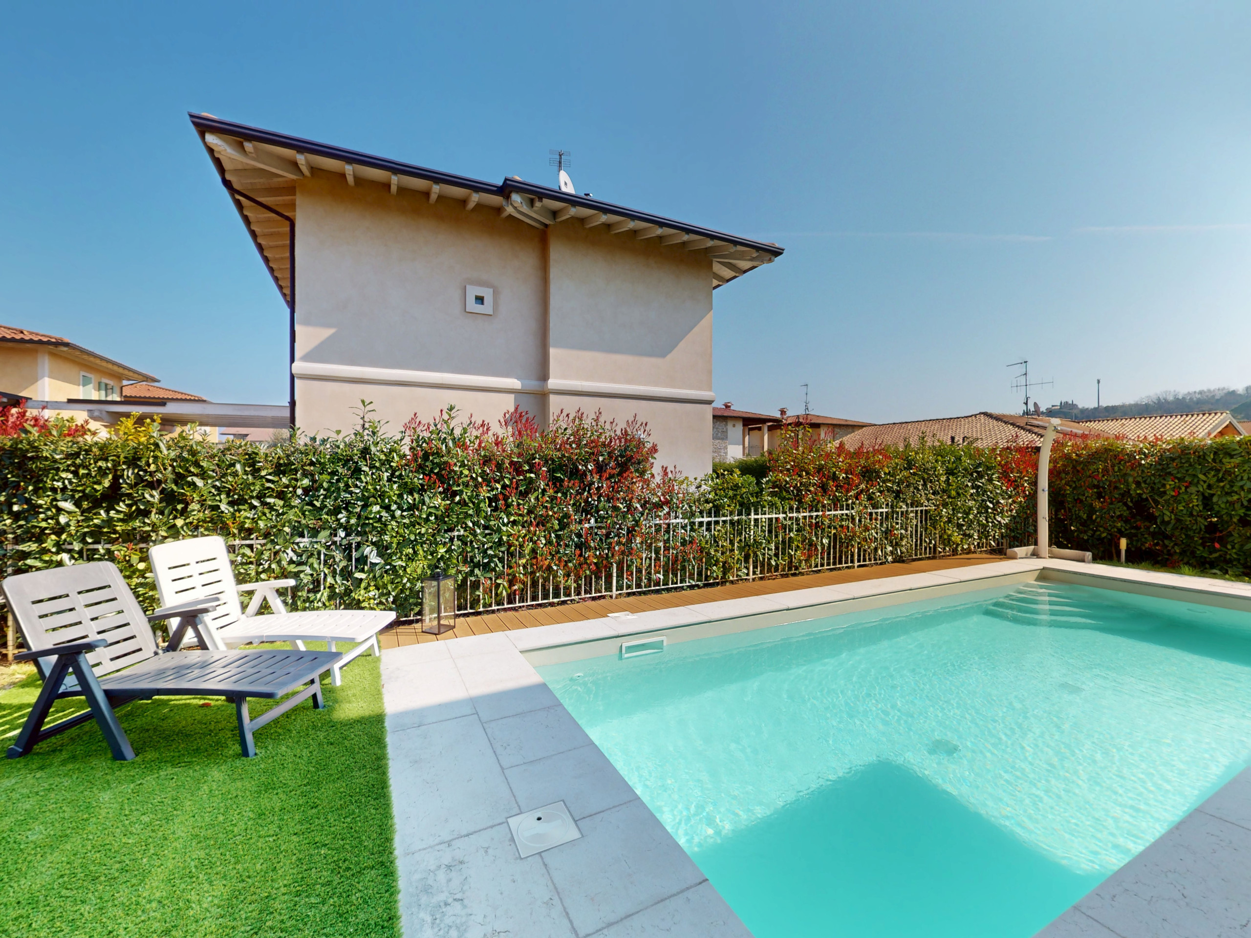 Delightful independent villa with private pool, close to the centre of Manerba del Garda, 500 metres from the Lake. The lake can be reached on foot. The spacious and bright villa is on three floors, with three bedrooms and three bathrooms. On the ground floor there is a living room with a large window overlooking the pool, a sofa bed and a guest bathroom. The sleeping area is on the first floor and consists of a double bedroom with patio doors and a balcony, a twin bedroom, a single bedroom and a full bathroom with a large shower. In the basement there is a lounge with a double bed, a bathroom with a shower and a washing machine. The property is equipped with screens. The property is surrounded by a large private outdoor space furnished with a table, sun loungers, an outdoor kitchen and sofas located by the pool. Double garage. Air conditioning is available for a fee of €0.50/kWh. If not directly charged in the booking, the tourist tax (per guest) and a security deposit of €300 will be required upon arrival. CIN IT017102B4ISABZLAX