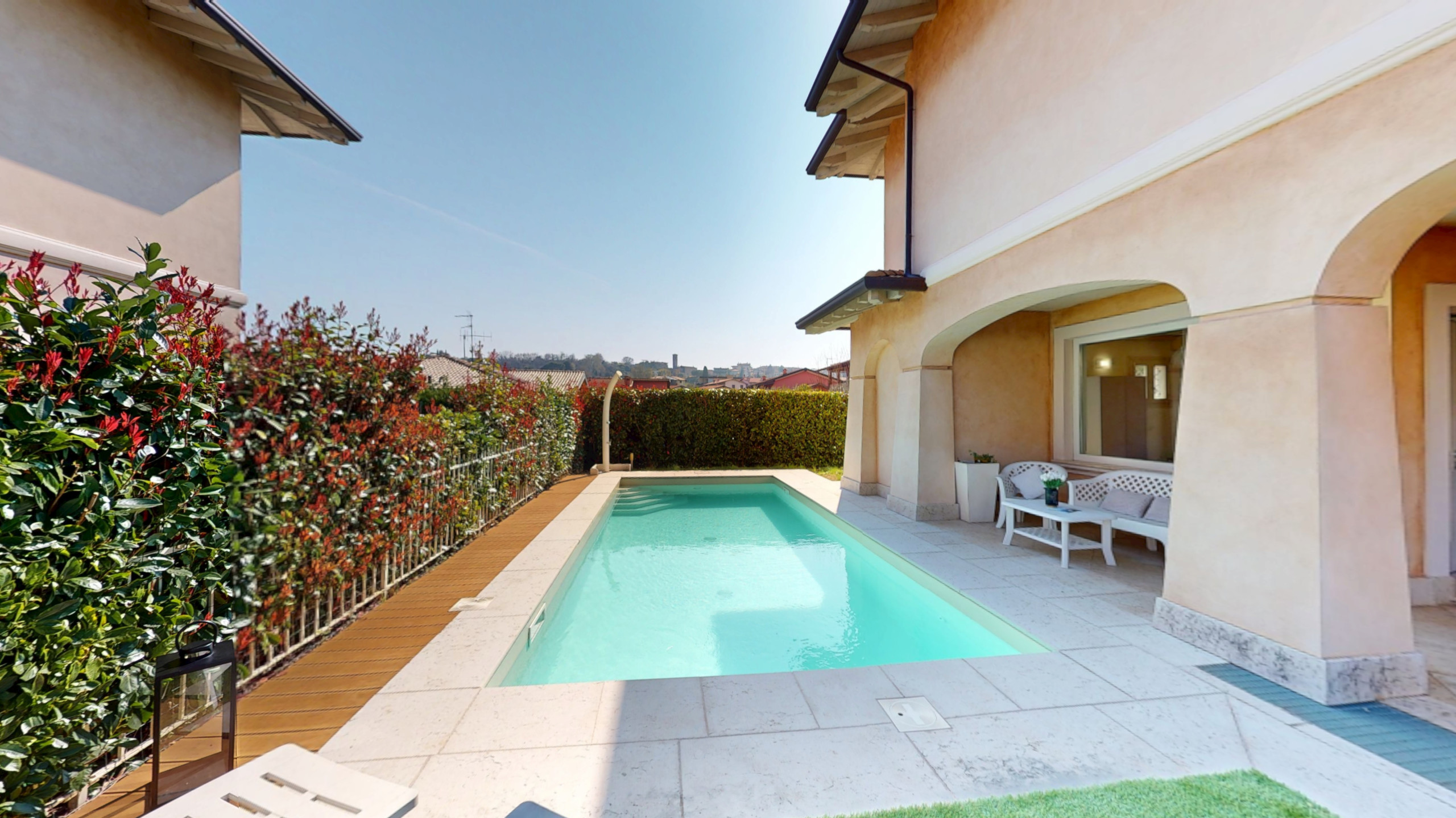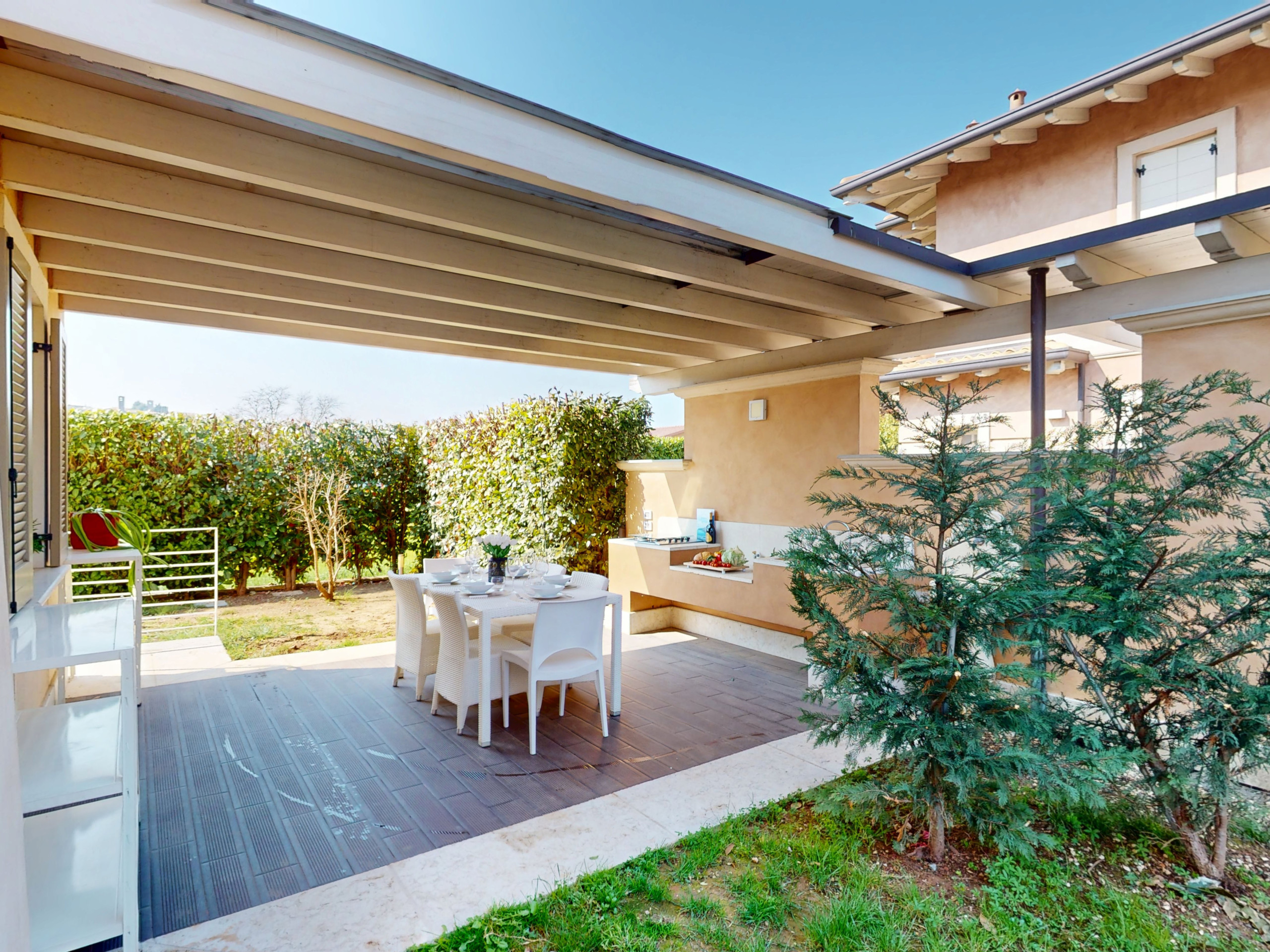 The private garden surrounds the villa and a large portico with a kitchen is ideal for lunches, summer dinners with friends and in total privacy, immersed in greenery and with a view of the pool.