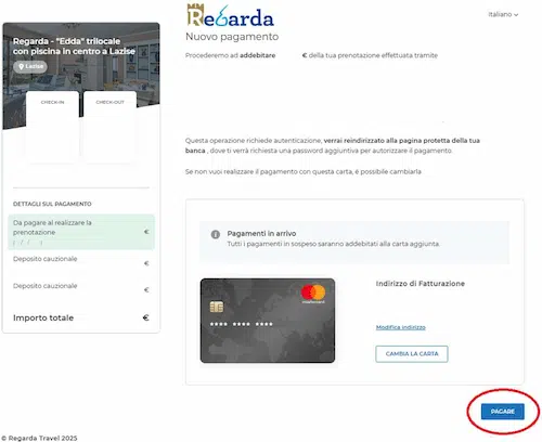 Per garantire la massima sicurezza e trasparenza, gestiamo i pagamenti con carta di credito, operando in piena conformità con la normativa europea PSD2, procedura di sicurezza obbligatoria per tutti i pagamenti online in Europa, che garantisce che solo il legittimo proprietario della carta possa approvare la transazione. Ciò significa che non preleveremo mai alcun importo dalla tua carta se non sarai tu ad averlo autorizzato. Circa 4 giorni prima della scadenza riceverai via e-mail un promemoria che ti ricorda il successivo blocco cauzionale. Accedendo alla tua area personale potrai inserire i dati completi della carta di credito da utilizzare (intestatario, numero, data di scadenza e CVV).