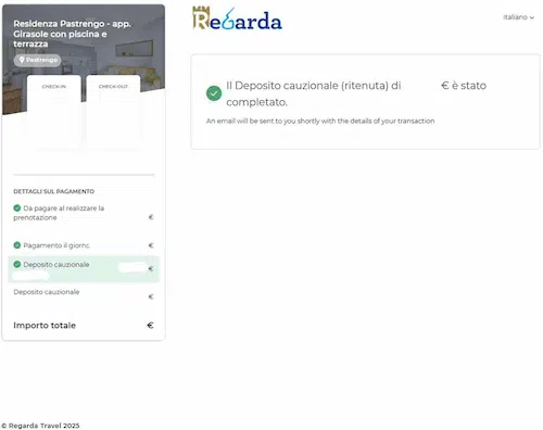 L'importo (specifico per ogni struttura) non viene prelevato dalla tua carta, ma viene bloccato attraverso una pre-autorizzazione. Ǫuesto significa che la somma viene temporaneamente messa in attesa e riduce il tuo plafond disponibile, ma non viene addebitata sul tuo conto. Il giorno previsto per il tuo arrivo riceverai un’e-mail contenente un link, tramite il quale autorizzare il blocco del deposito cauzionale.